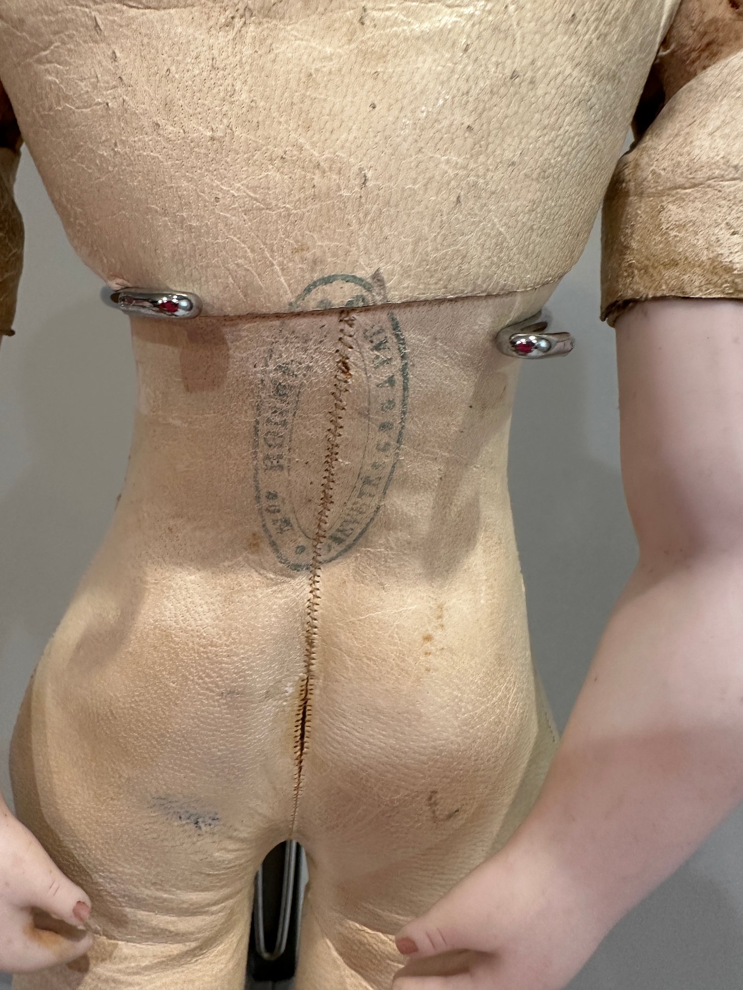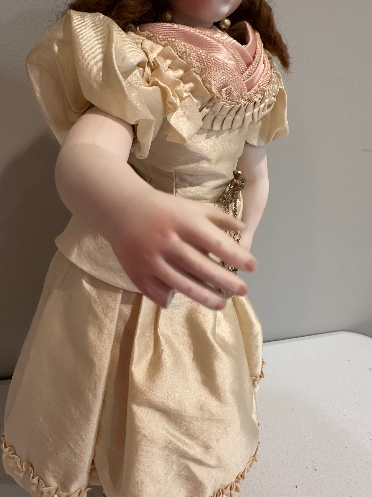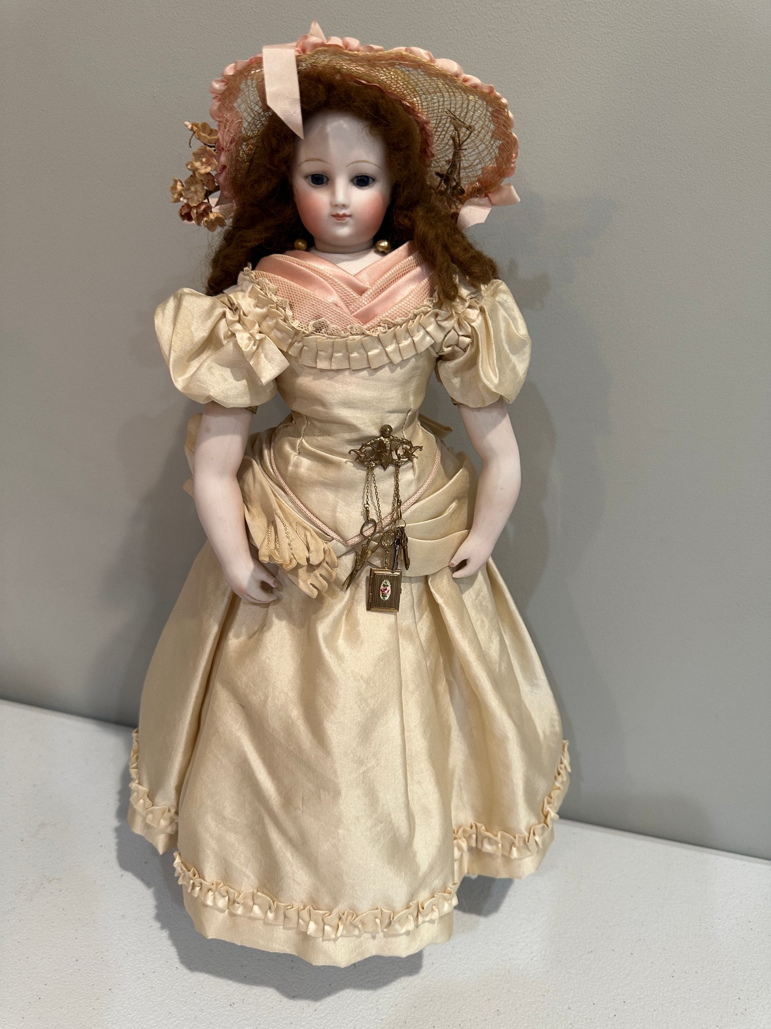 17” Rohmer French Fashion swivel head, blue eyes, beautiful full bisque arms jointed at shoulder, beautiful costume including long gloves and hat. One missing finger on right hand, brown mohair wig, blue stamped leather body.