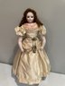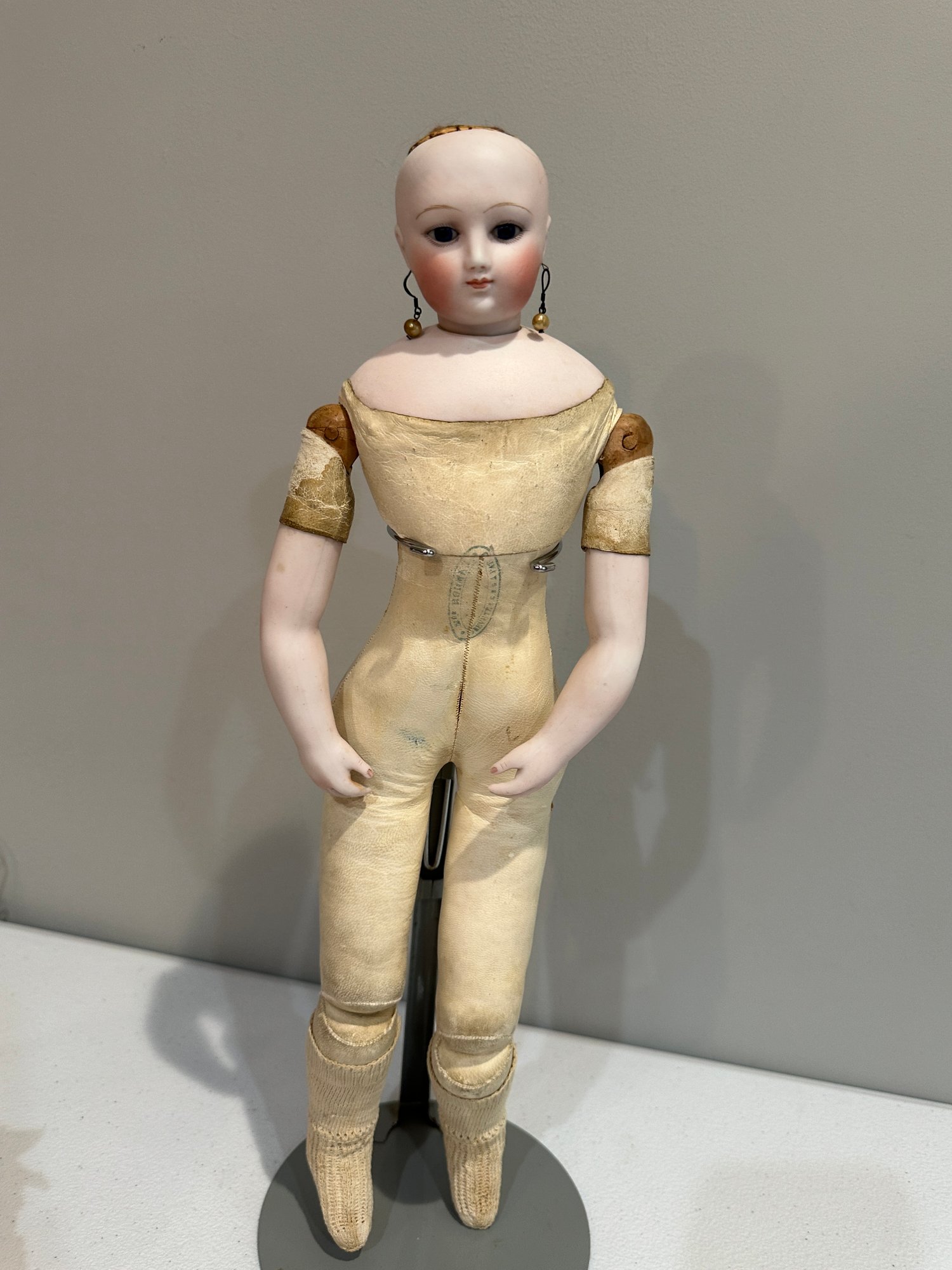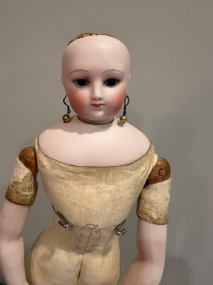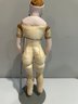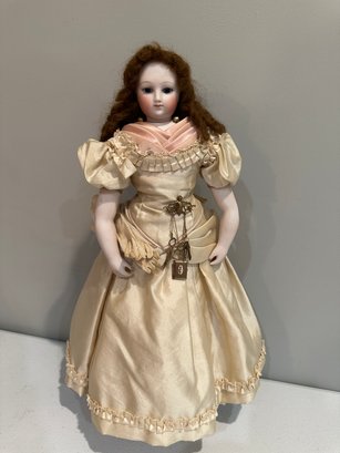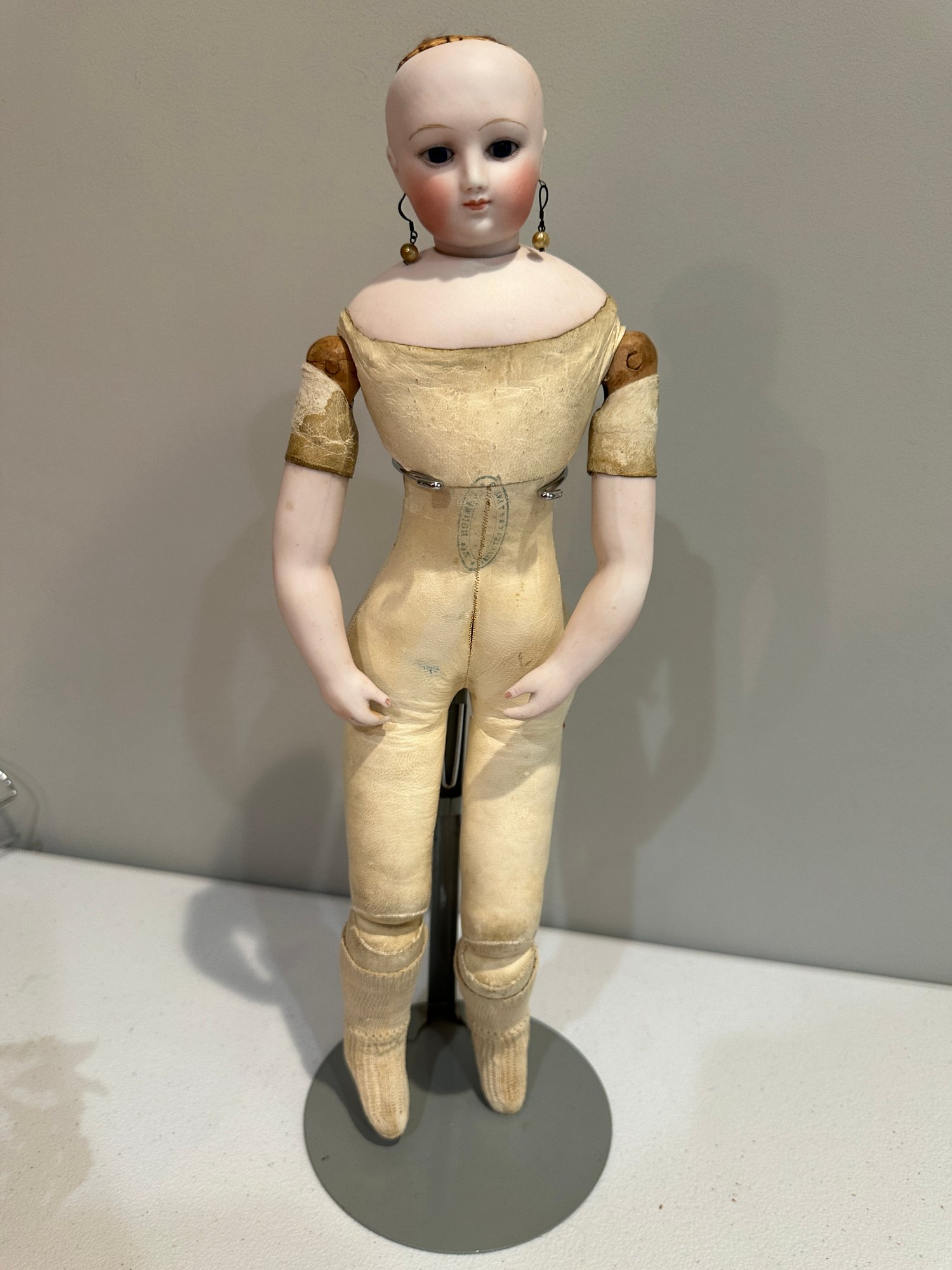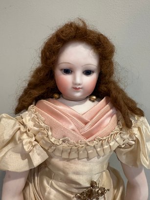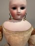 17” Rohmer French Fashion swivel head, blue eyes, beautiful full bisque arms jointed at shoulder, beautiful costume including long gloves and hat. One missing finger on right hand, brown mohair wig, blue stamped leather body.