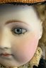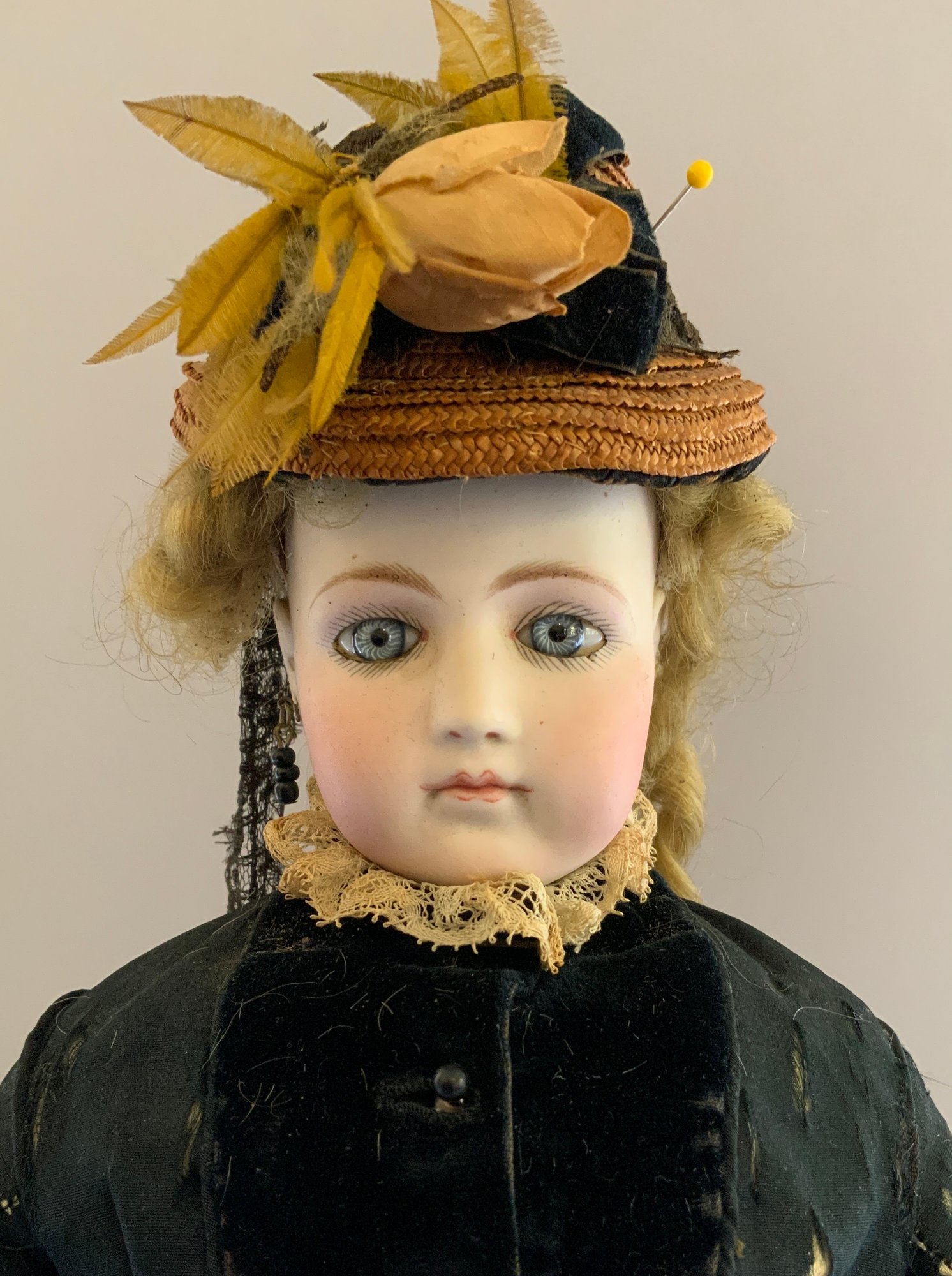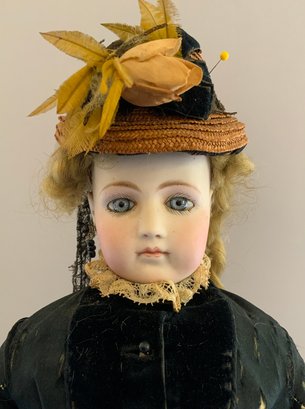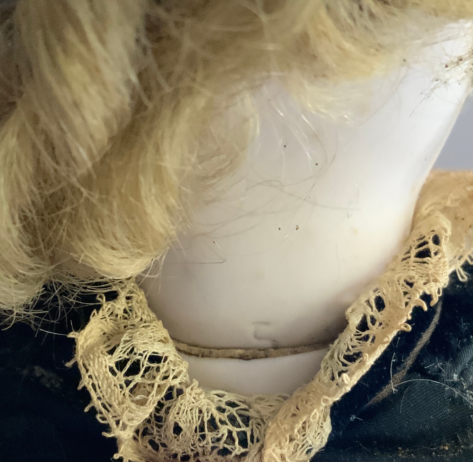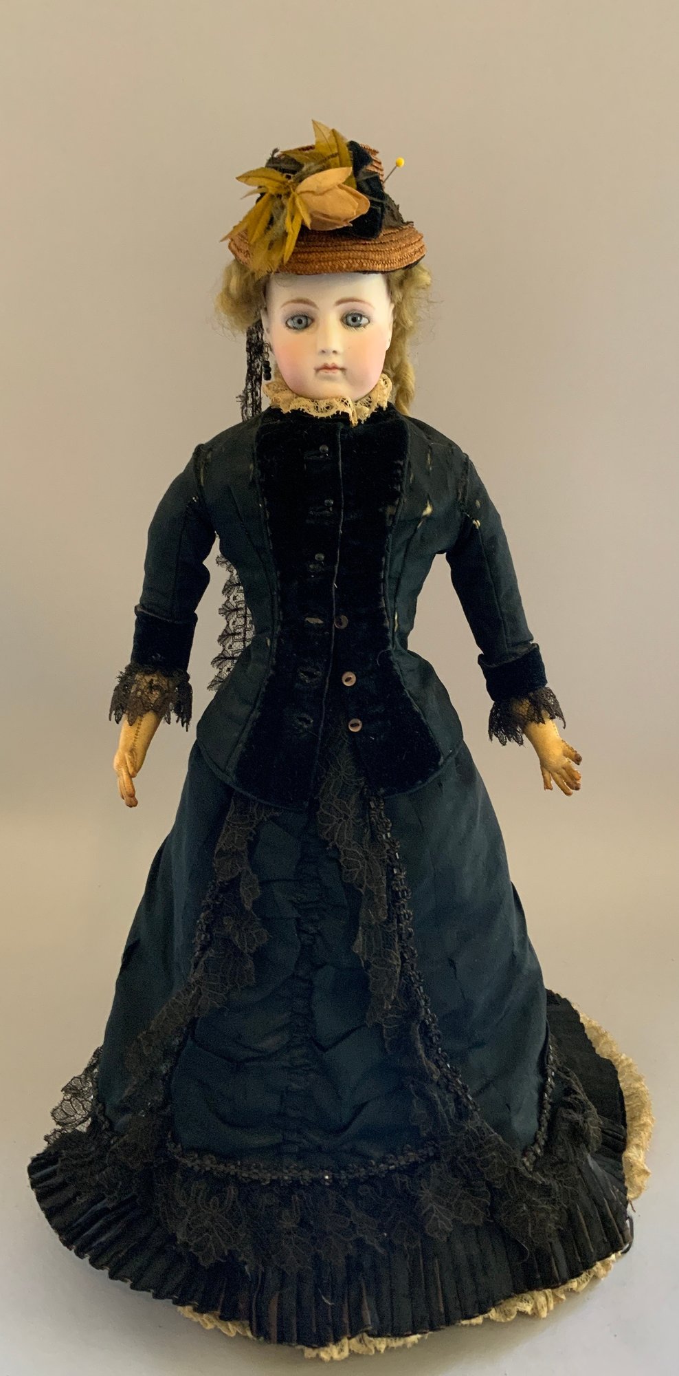 17 ½” Swivel head French Fashion incised 5, blue glass eyes, CM, PE, blonde mohair wig, cloth body with kid arms, black walking suit, (lower left eye fleck)