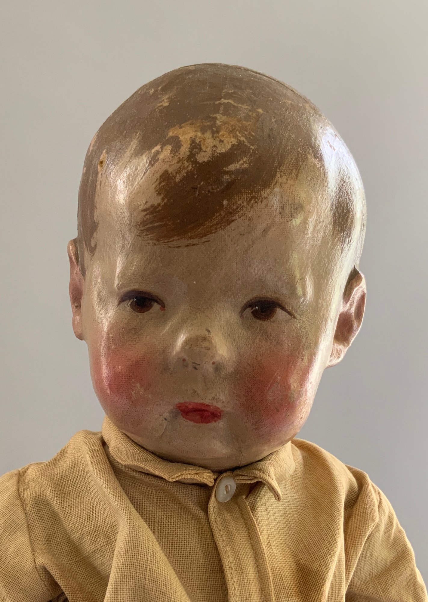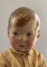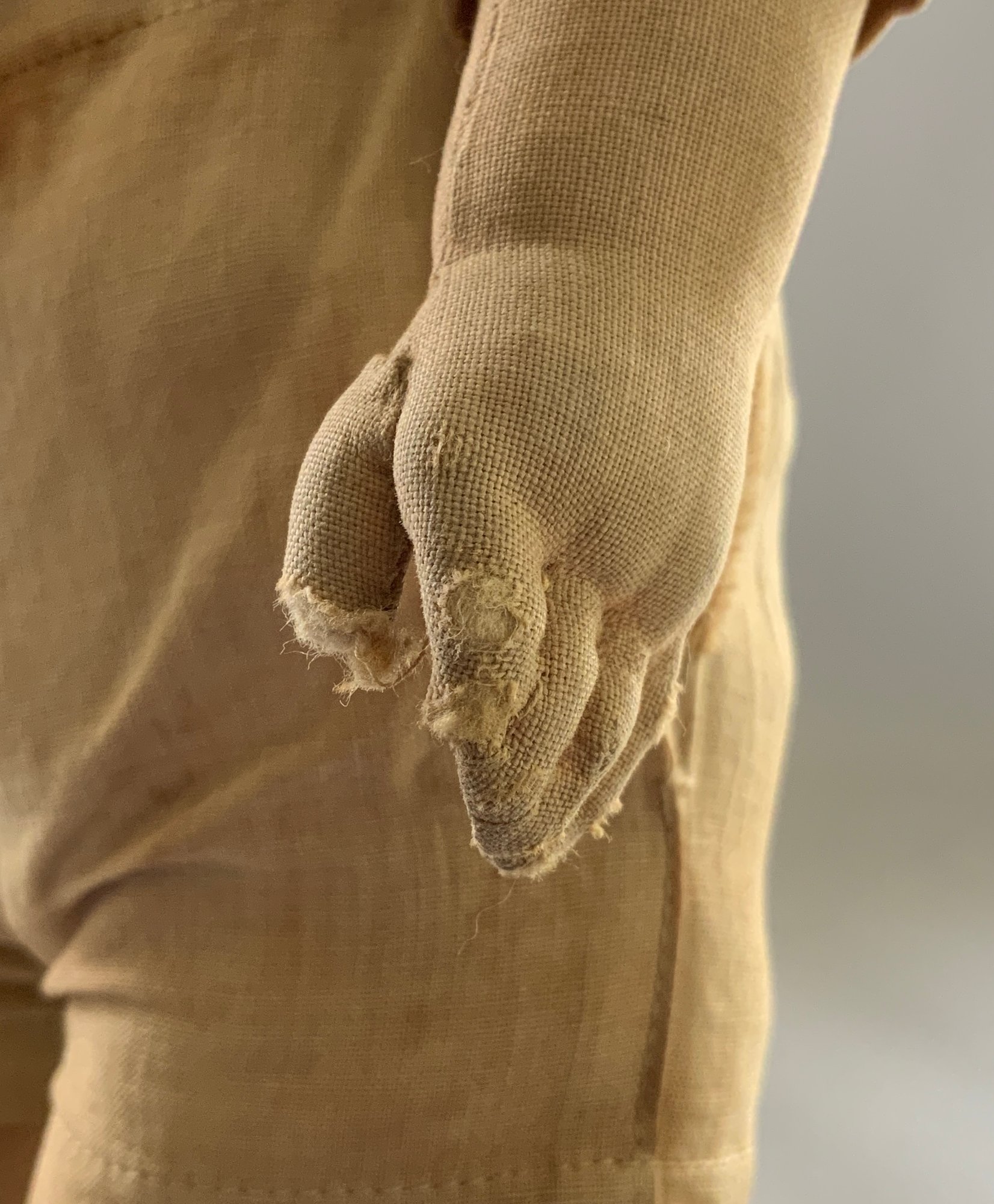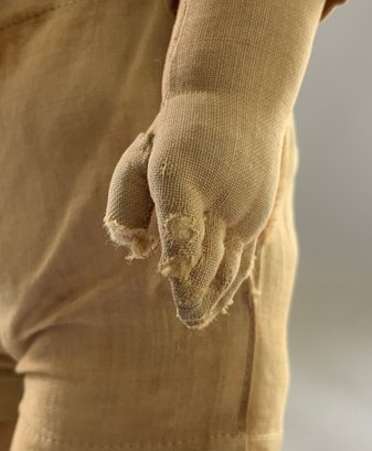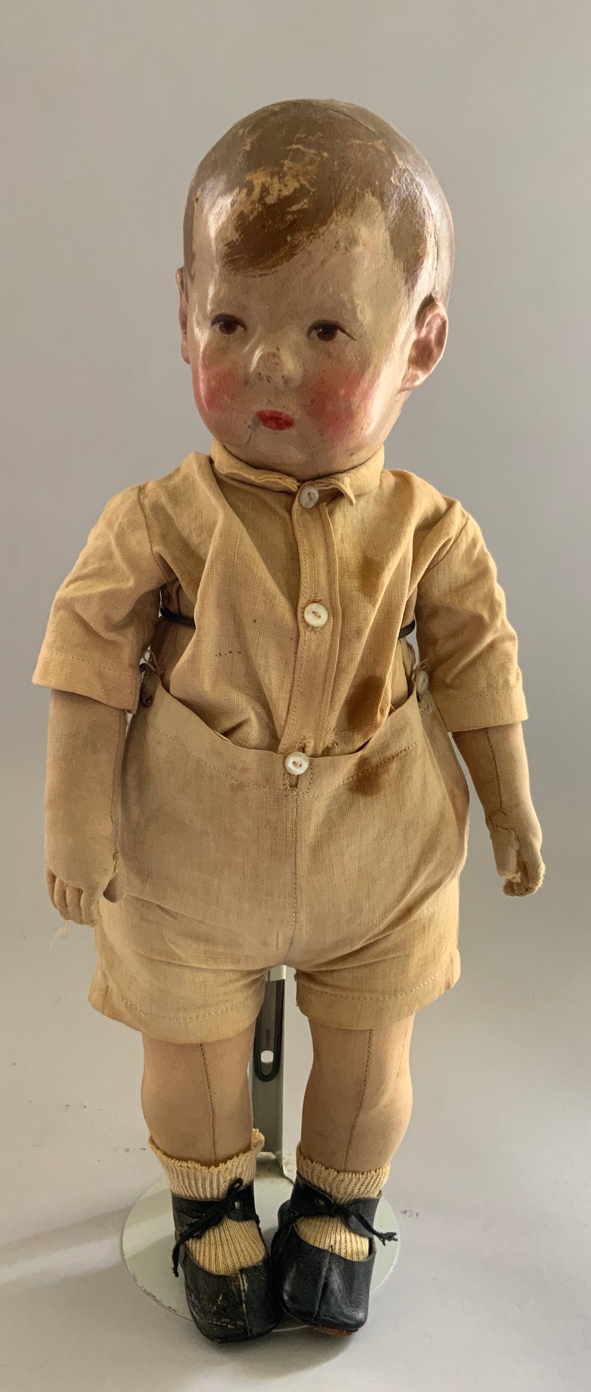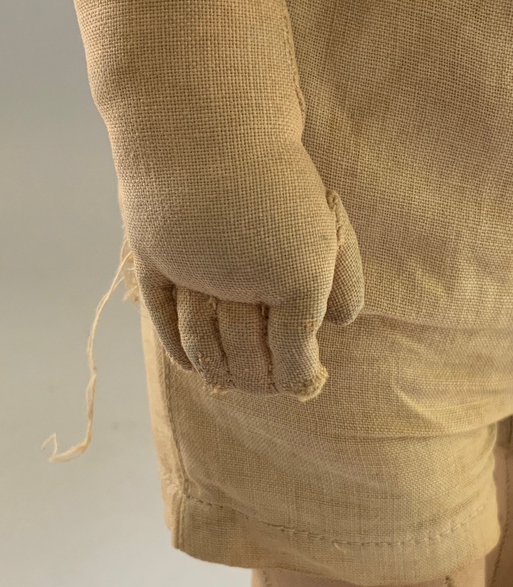 17” Wide hip Kathe Kruse, muslin head, painted features, cloth body, tan outfit (wear), (head rubs)