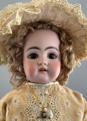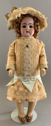 18” Bisque Handwerck 79, brown glass sleep eyes, blonde mohair wig, OM with teeth, PE, BJCB, yellow silk dress (melting), with needlework, (tiny left cheek dark spot)