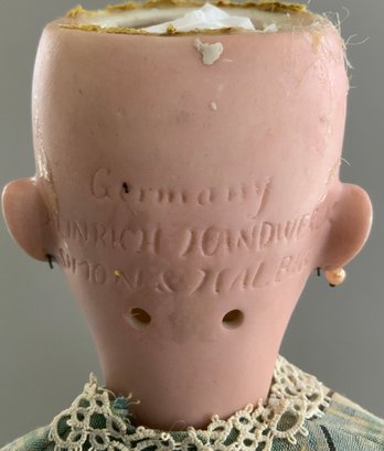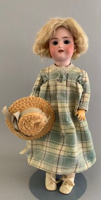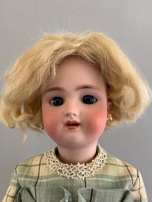 18” Bisque Heinrich Handwerck Simon Halbig 1, blue glass sleep eyes (right eye bottom fleck, eyes need to be reset), OM with teeth, PE, blonde mohair wig, BJCB, green/blue dress