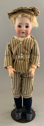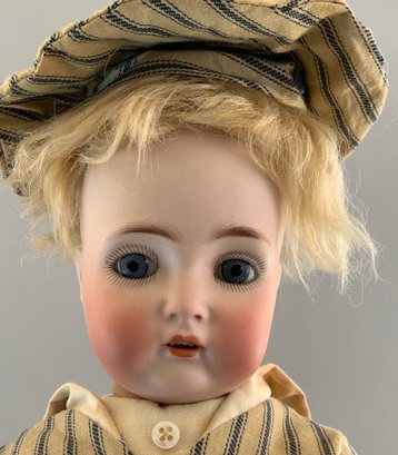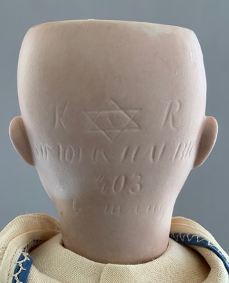 18” Bisque K*R 403, blue glass eyes, OM with teeth, blonde mohair wig, BJCB,