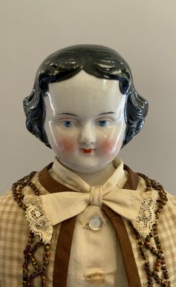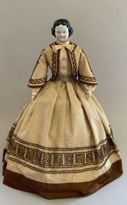18” Black hair china, painted features, newer cloth body, china limbs, beige gingham dress with hoop skirt
