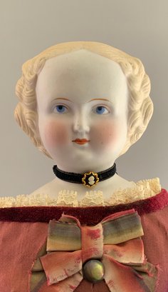 18” Blonde hair Parian, painted features, cloth body with bisque arms & legs, silk moiré dress (melting)