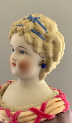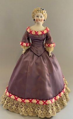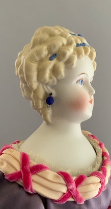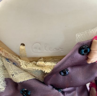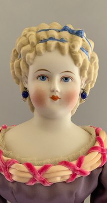 18” Blonde hair Parian shoulder head artist doll Emma Clear, painted features, blonde sculpted hair with blue ribbons, PE, cloth body with bisque limbs, lavender silk dress with lace & trim, painted shoes
