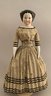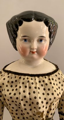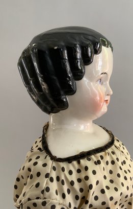 18” Center-part flat-top, black hair china S/H, w/ sausage curls, blue ptd. eyes, cloth body, china limbs, wears black pin-dot dress w/ bands of black velvet ribbon,