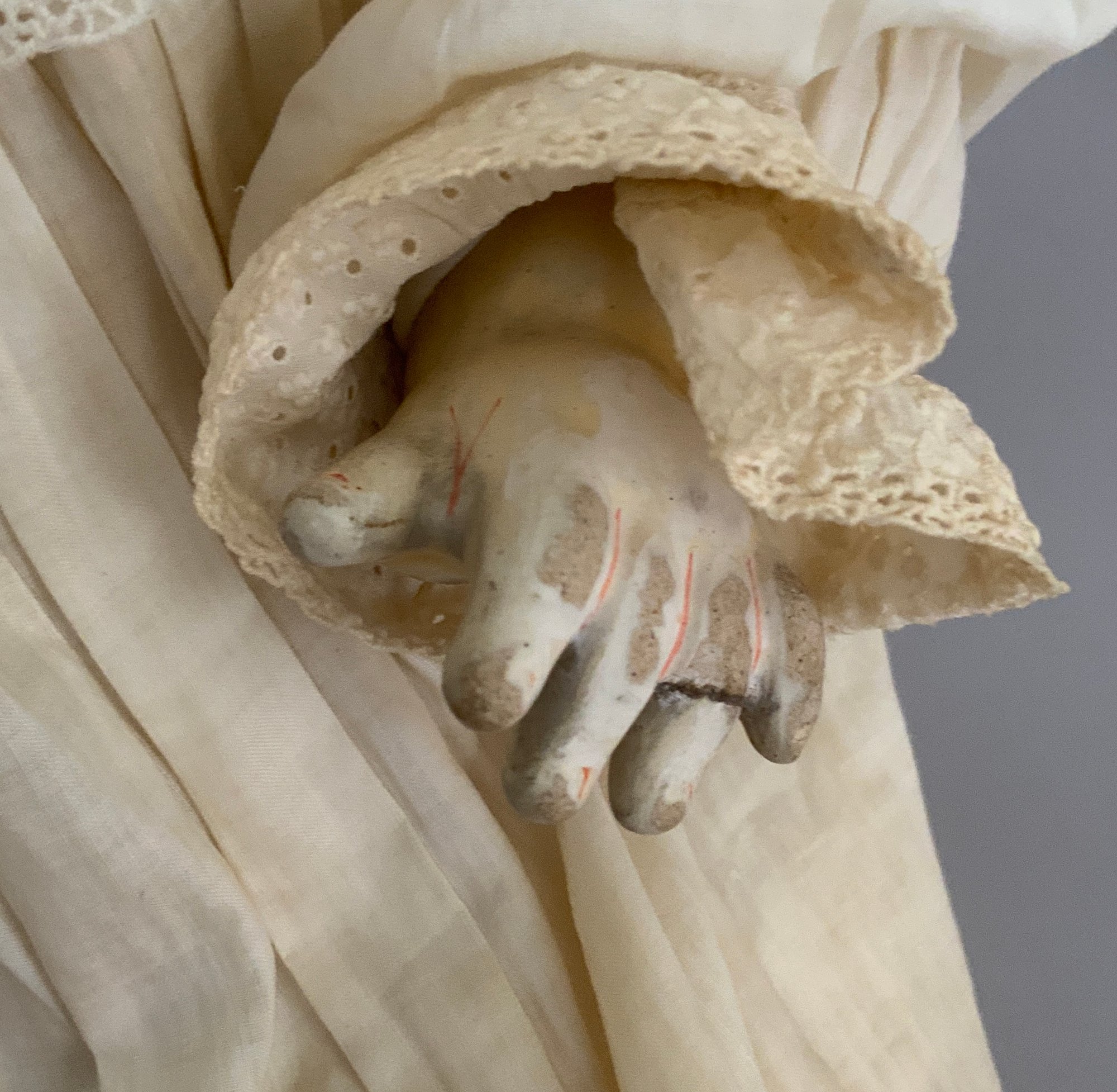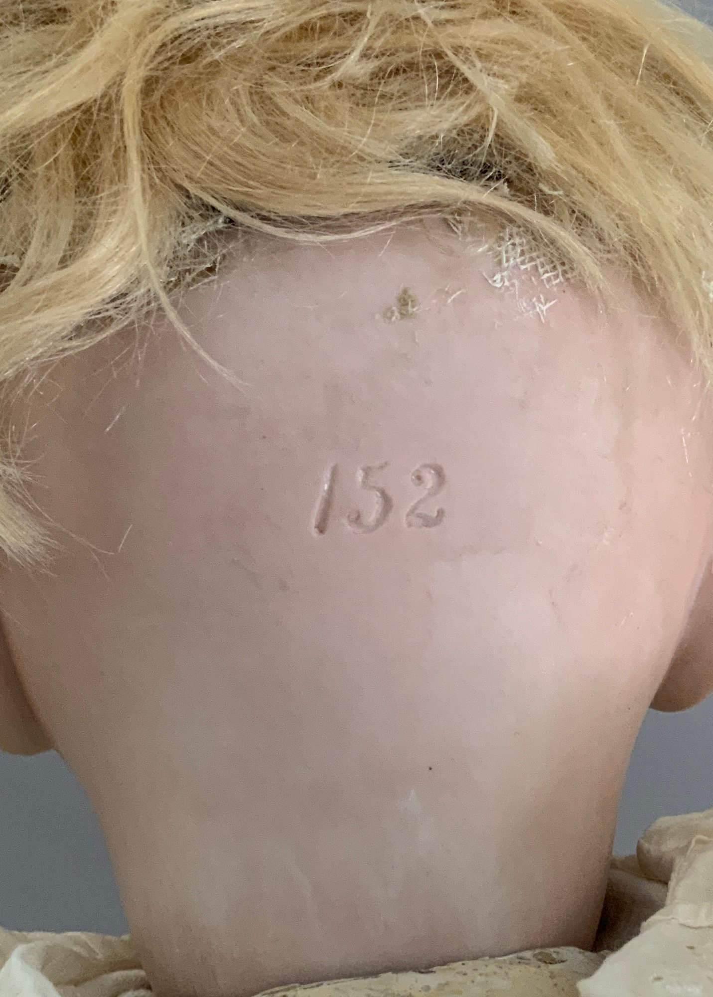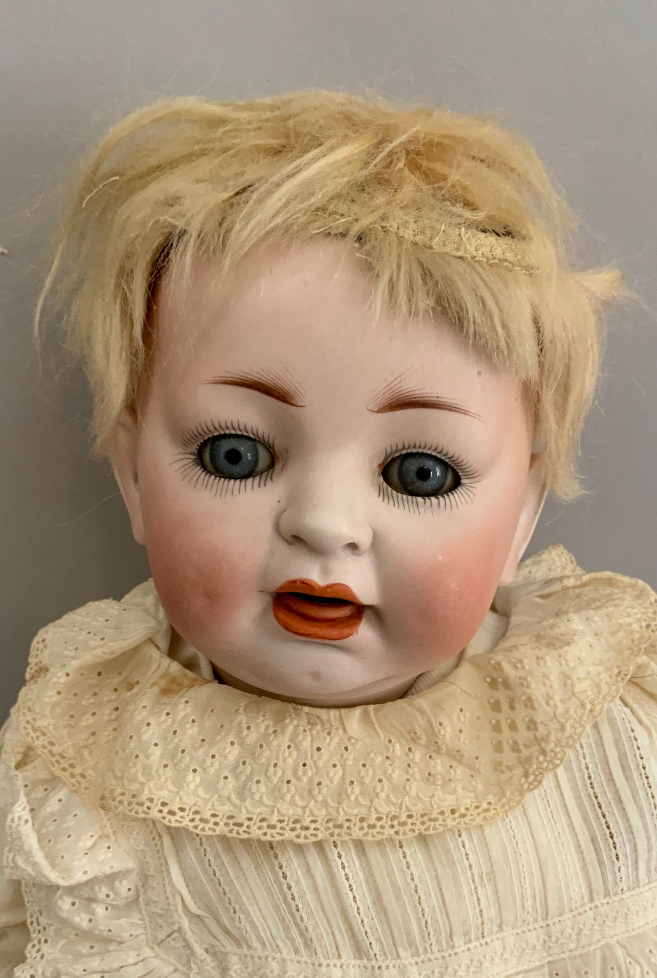 18” Character baby Kestner 152, Blue glass sleep eyes, OM with teeth & tongue, dimples, blonde mohair wig (sparse), compo baby body (restorations to body areas, mended finger left & right hand), white gown