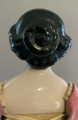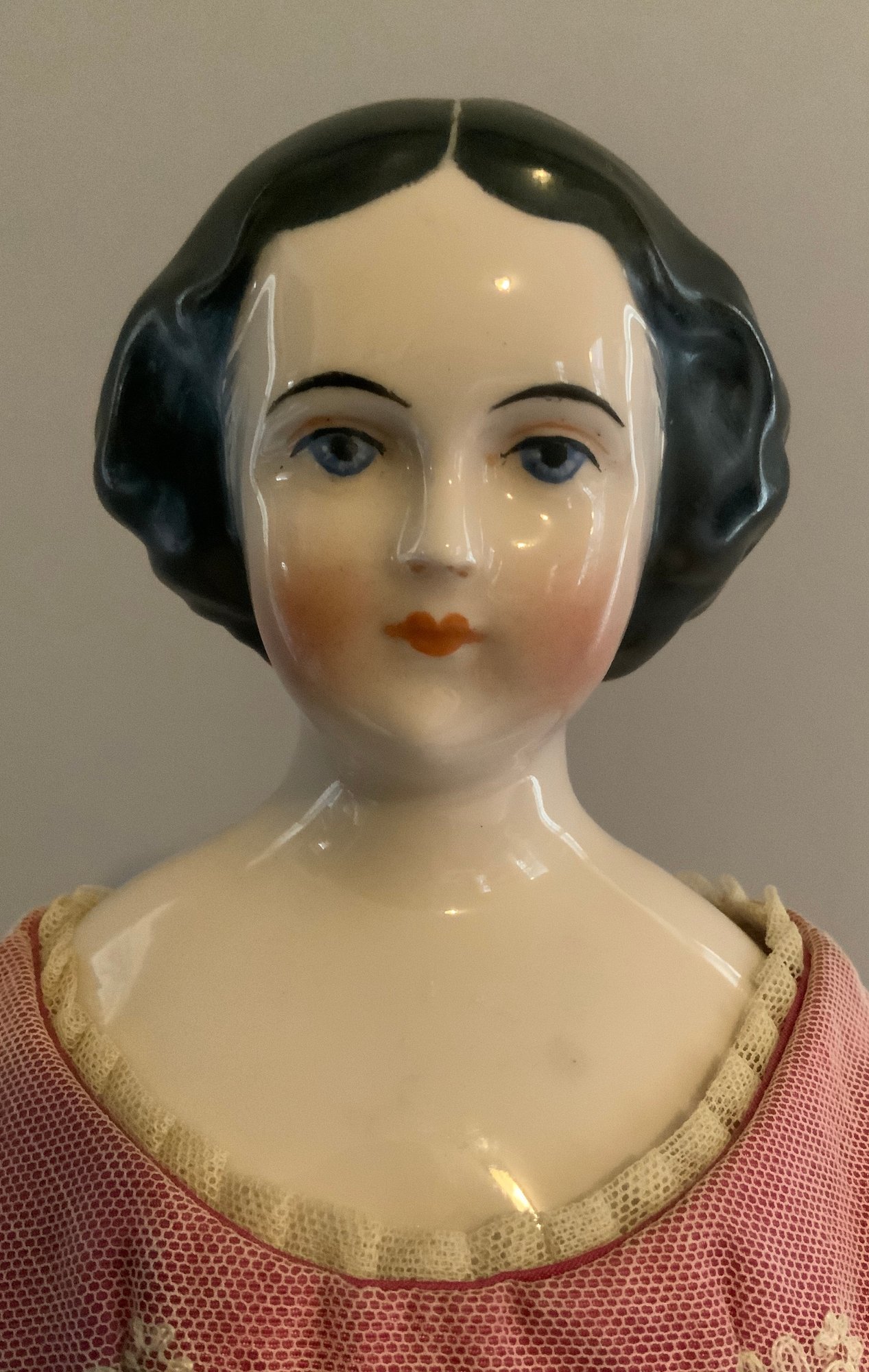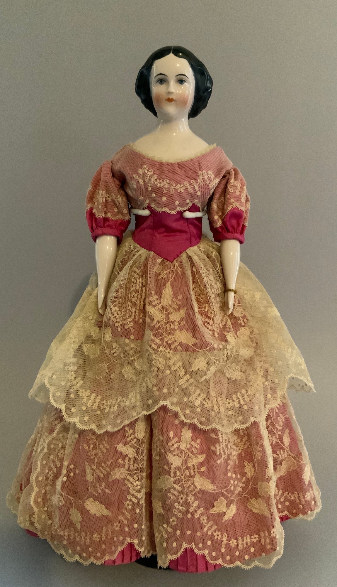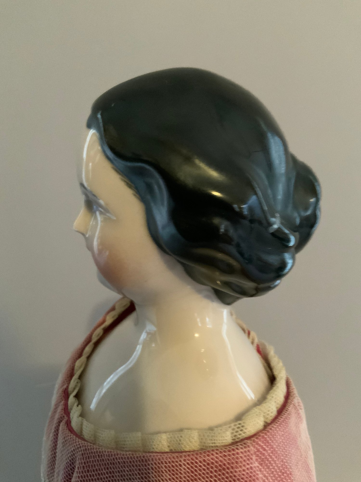 18” Emma Clear black hair china shoulder head artist doll, painted features, center part hair, cloth body with china limbs, pink silk dress with needlework (some holes)