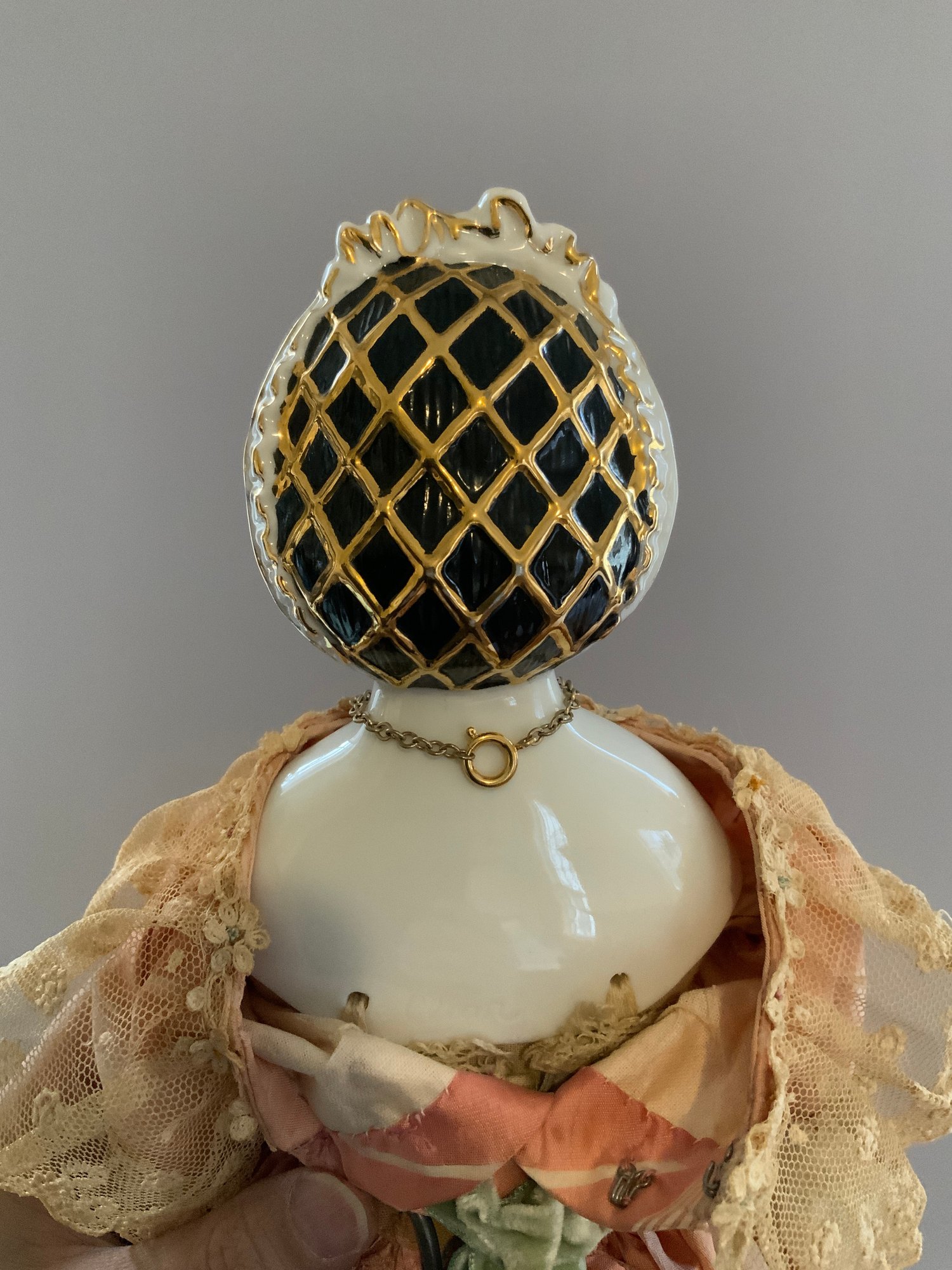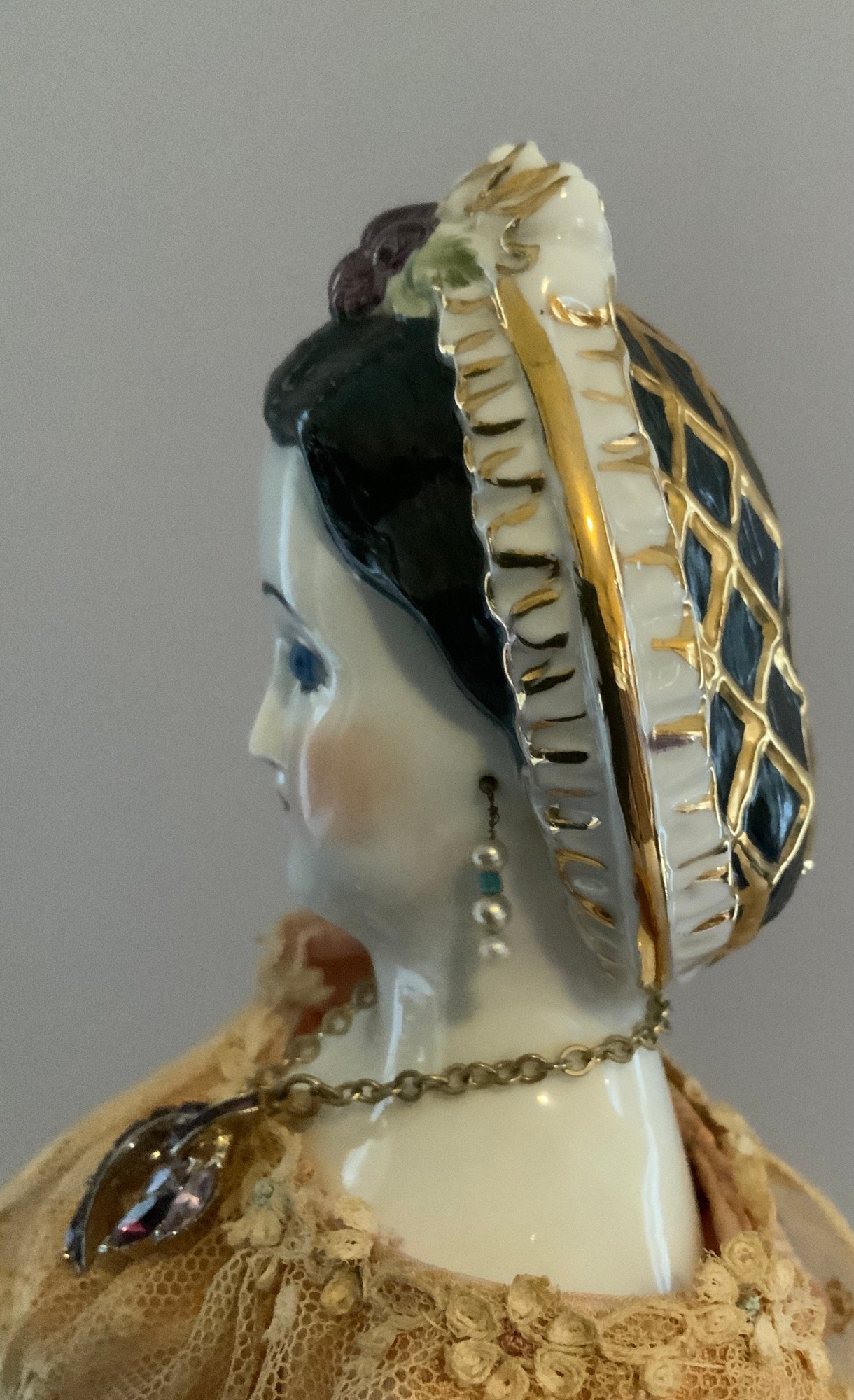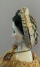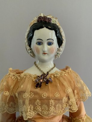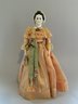 18” Emma Clear black hair china shoulder head artist doll, blue glass eyes, black molded hair with snood, cloth body, with china limbs, peach dress, with black painted boots