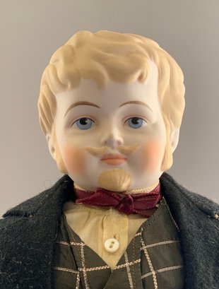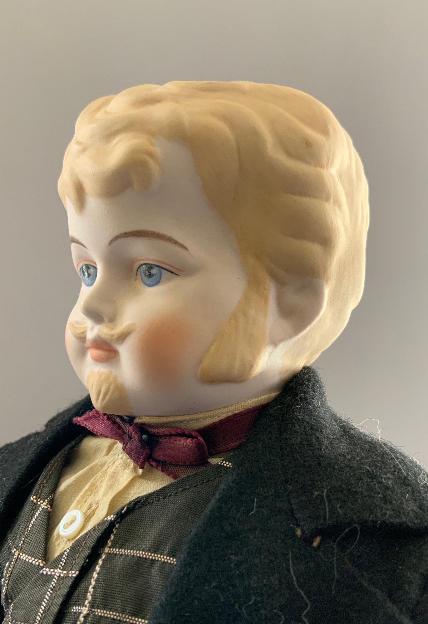 18 ½” Emma Clear Parian artist doll, boy, sculpted blonde hair, blonde side burns, goatee, & moustache, straight leg cloth body with parian limbs, black white suit, circa 1945