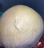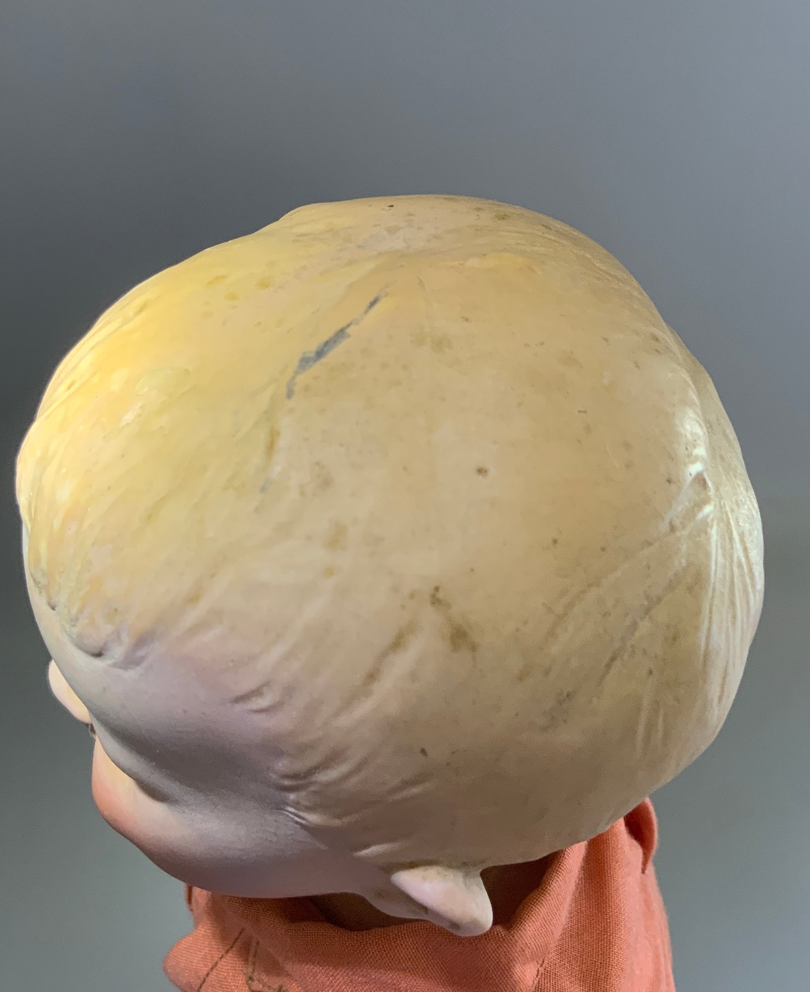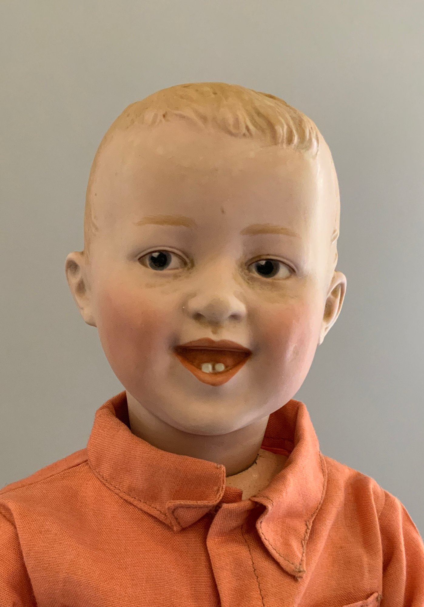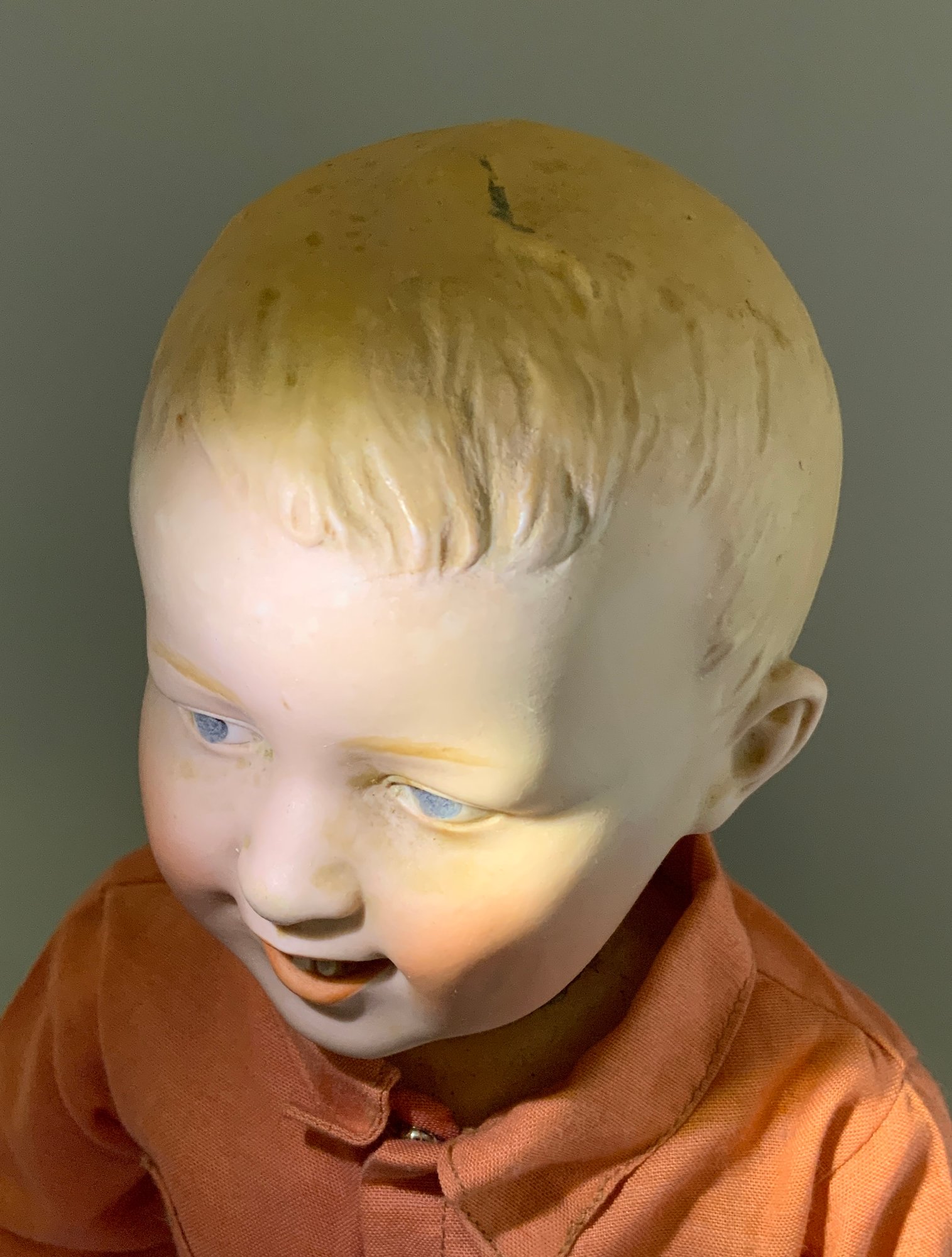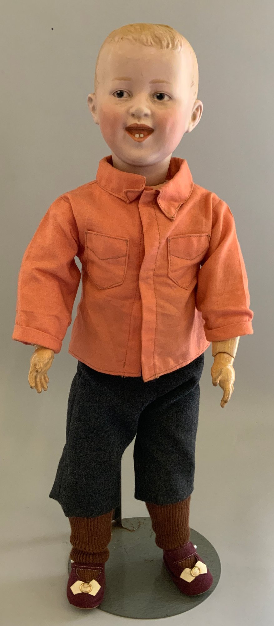 18” Heubach laughing boy incised 8 Germany, intaglio eyes, laughing mouth, BJCB, orange & blue outfit, (firing lines in head & repairs)