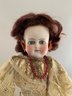 18 ½” Kestner turned head shoulder head, blue glass eyes, CM, PE, auburn mohair wig, cloth body with kid arms, white dress with lace, brown leather boots, (plaster pate)
