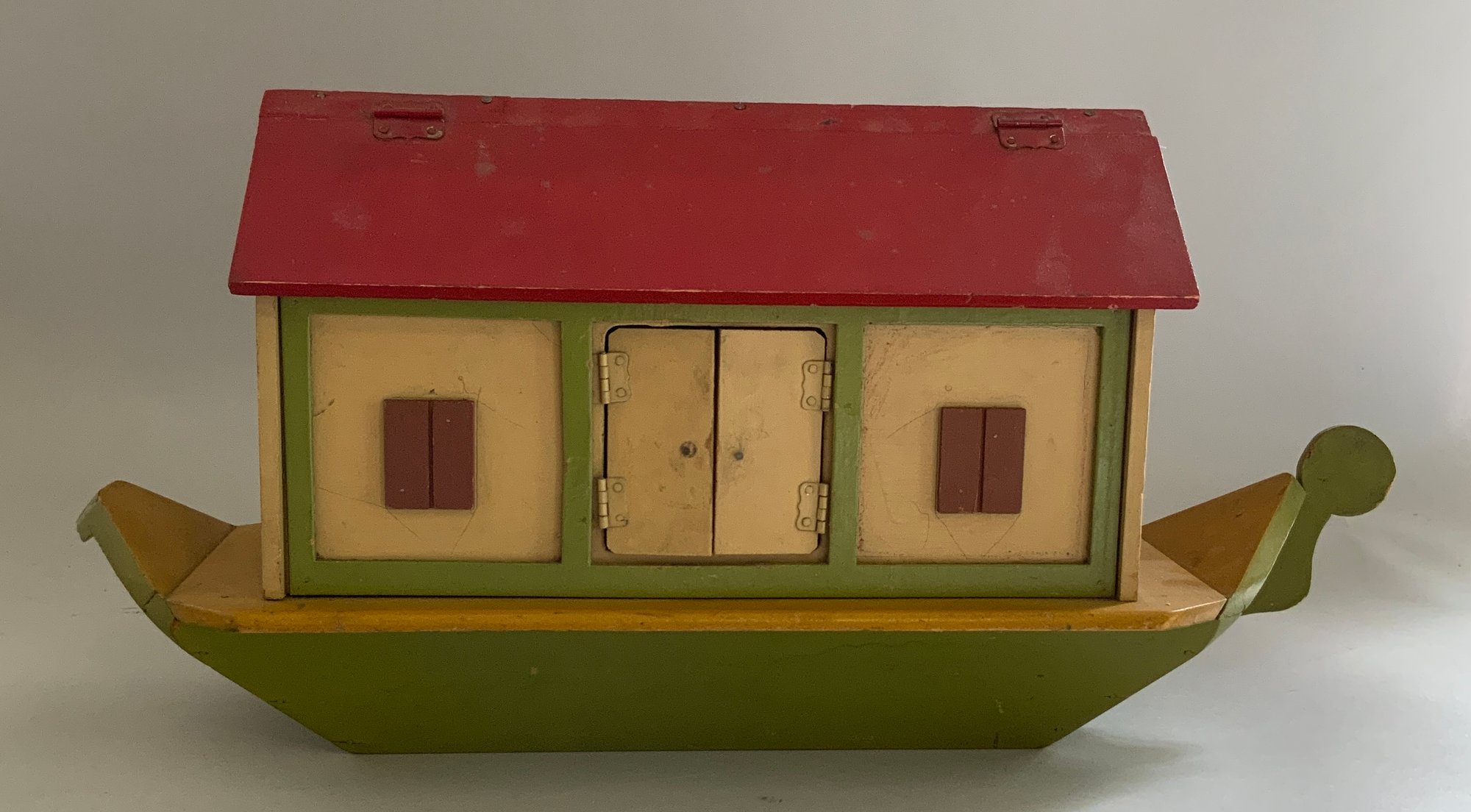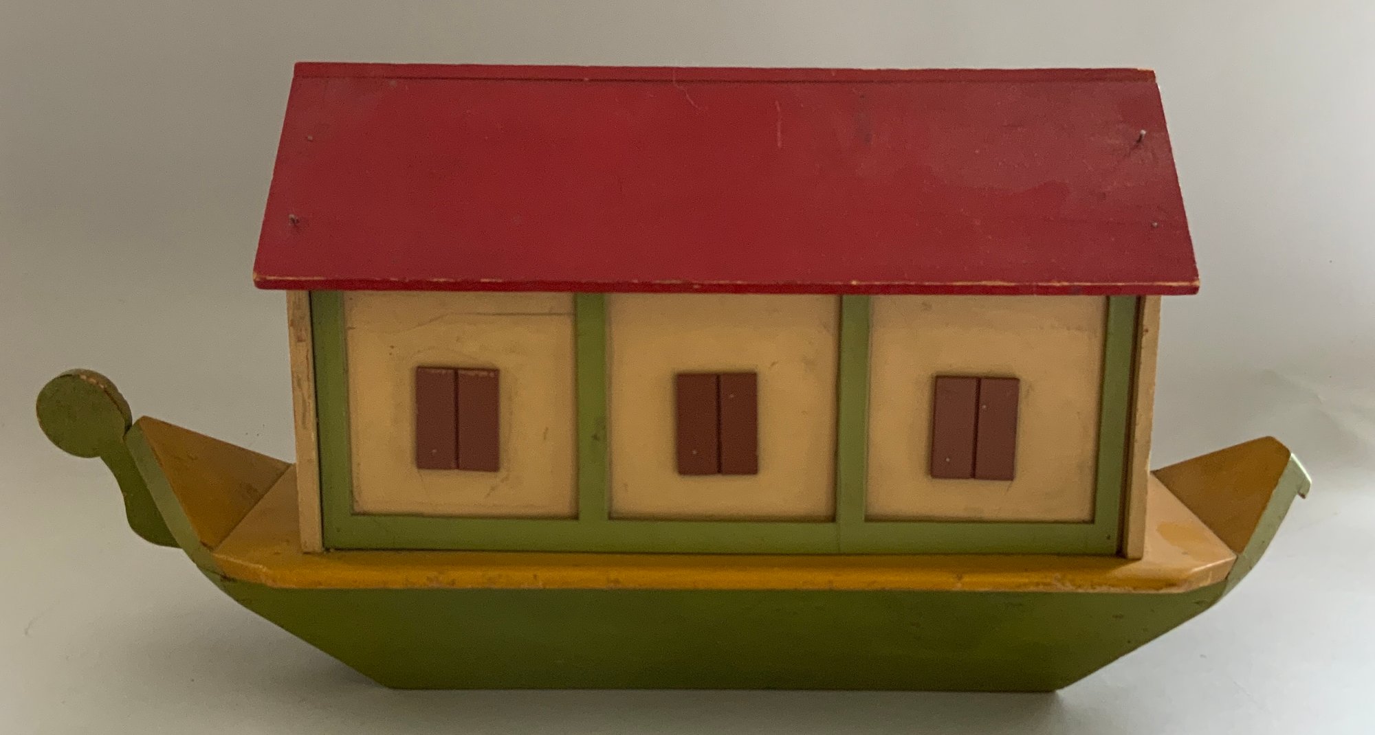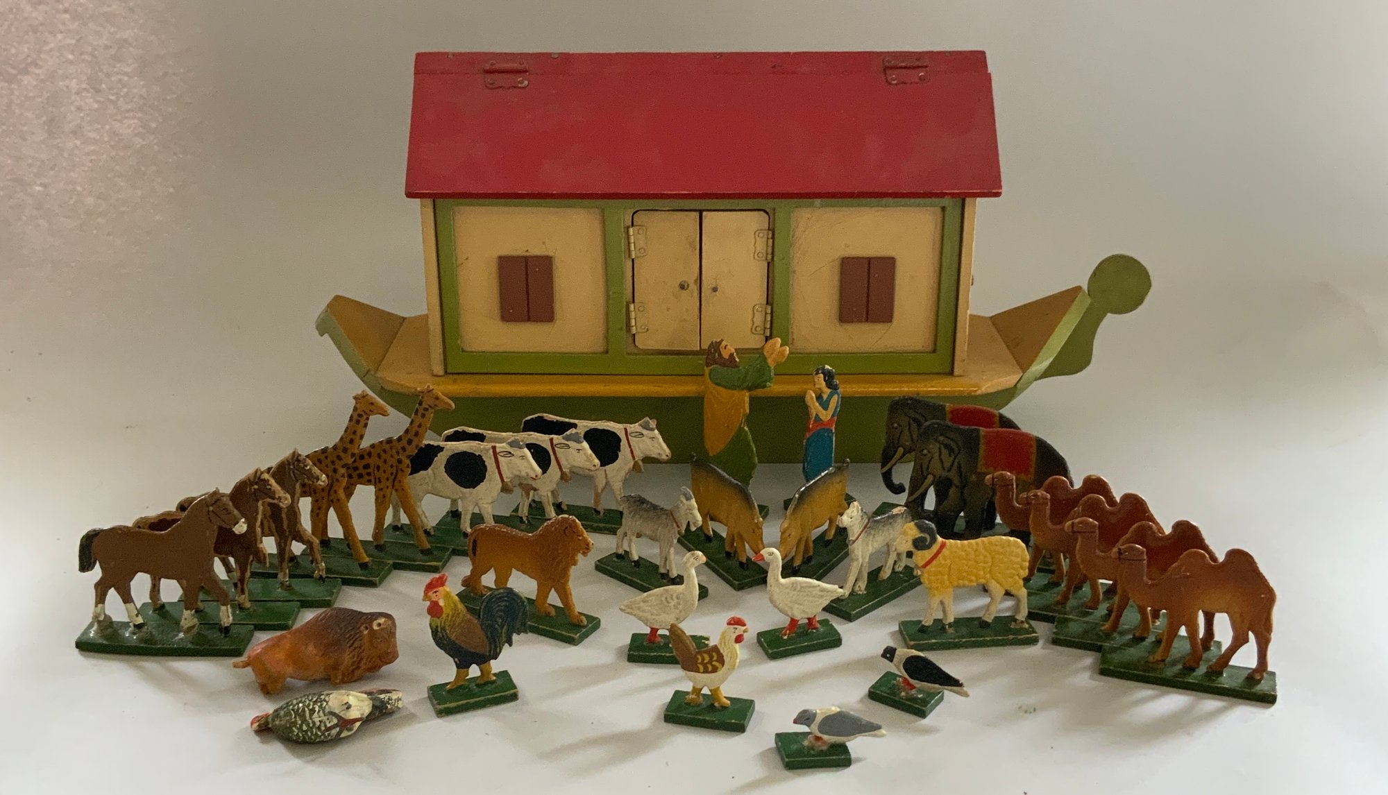 18” Long German painted ark with animal & people figures on bases marked made in Germany, hinged roof