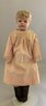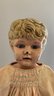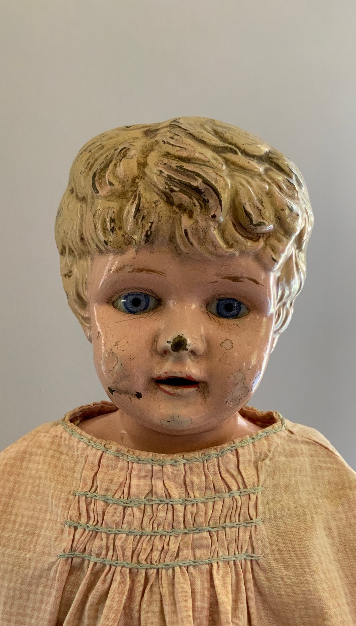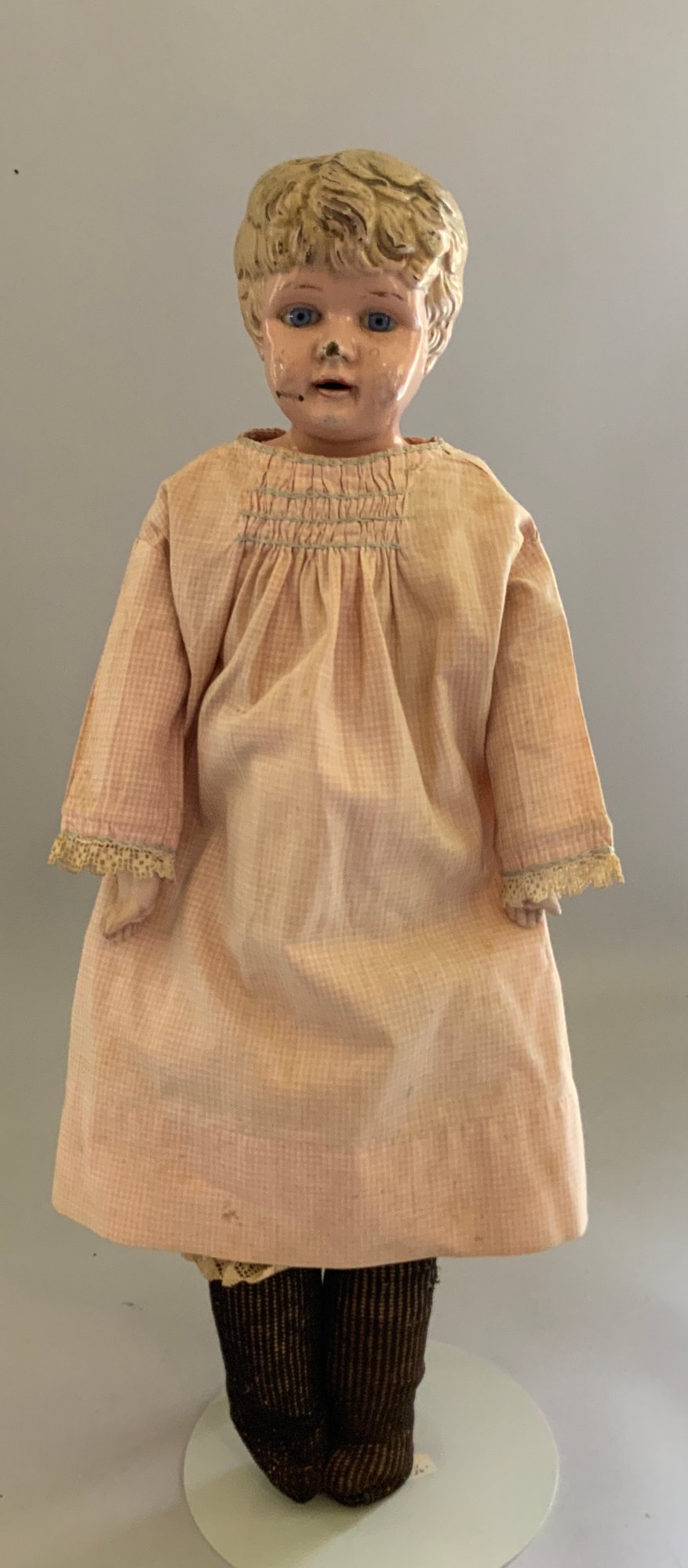 18 ½” Metal head, blue glass eyes, OM, kid body, bisque arms, pink check dress, (right thumb damage), (chips & dent)