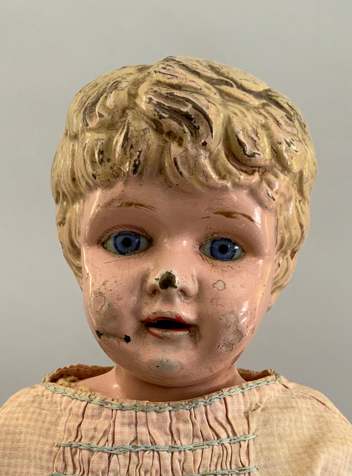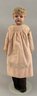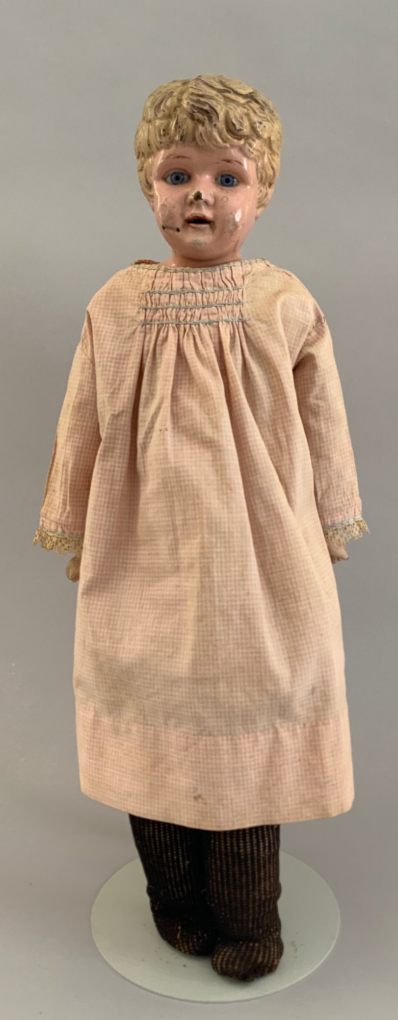 18” Metal shoulder head, blue glass eyes, sculpted hair, kid body with bisque arms (right thumb broken), faded pink check dress