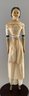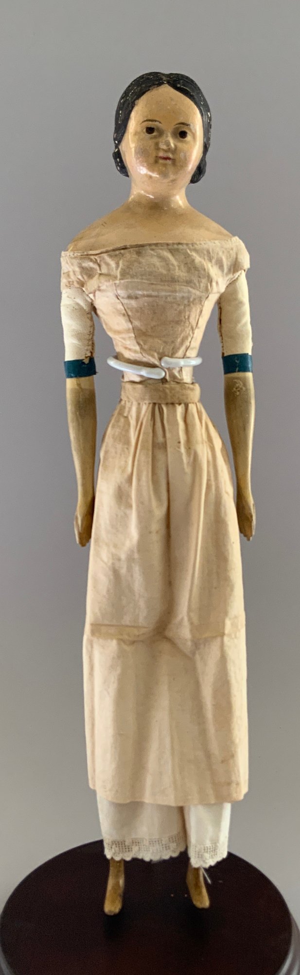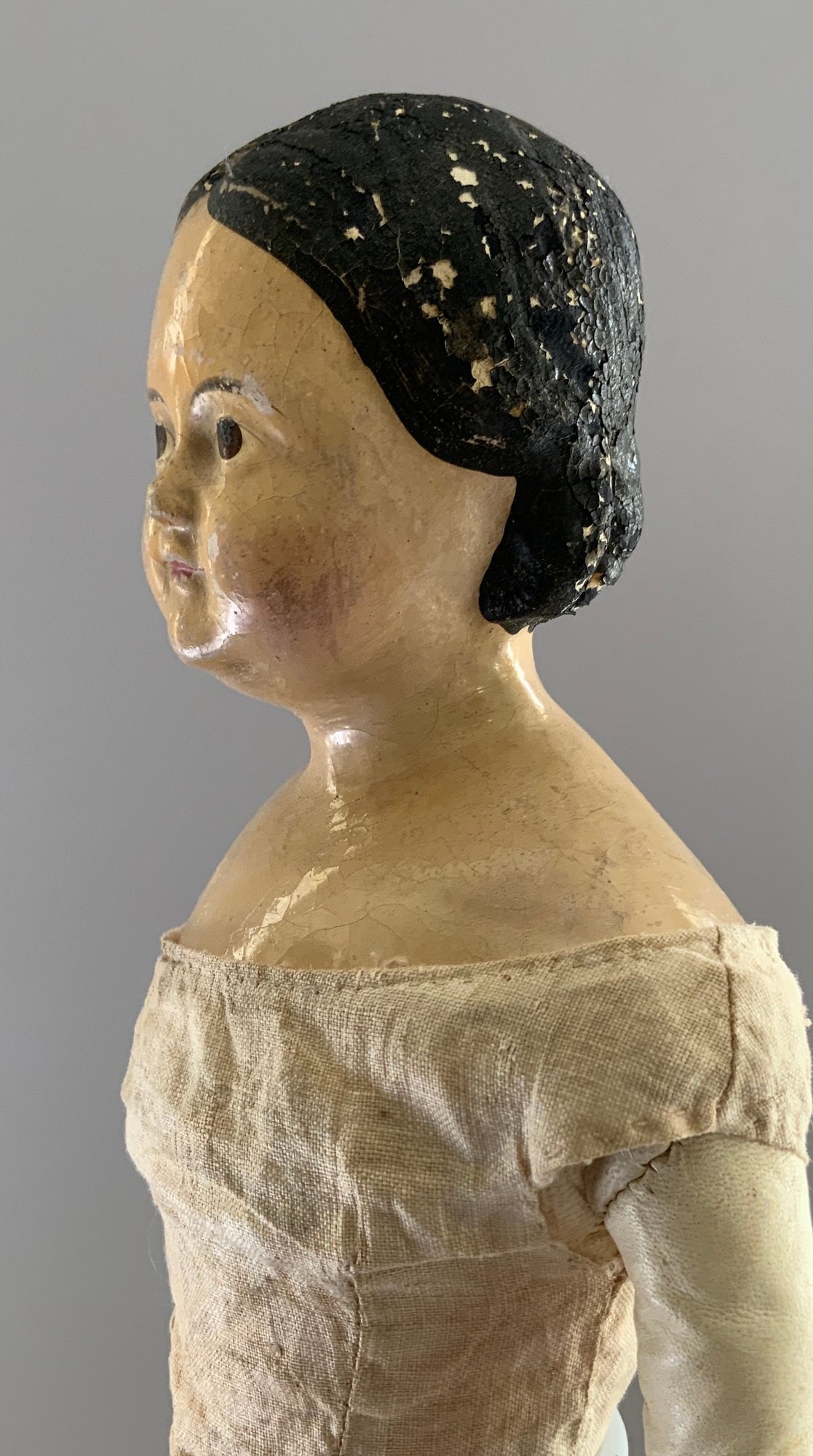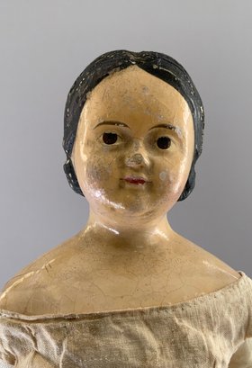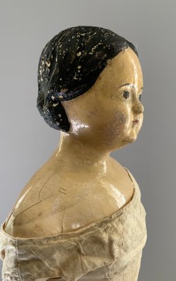 18” Paper mache shoulder head, painted features, center part painted black hair, leather body with wood limbs, white dress, ( crazing/cracks & chips to lower shoulder plate areas, facial rubs)