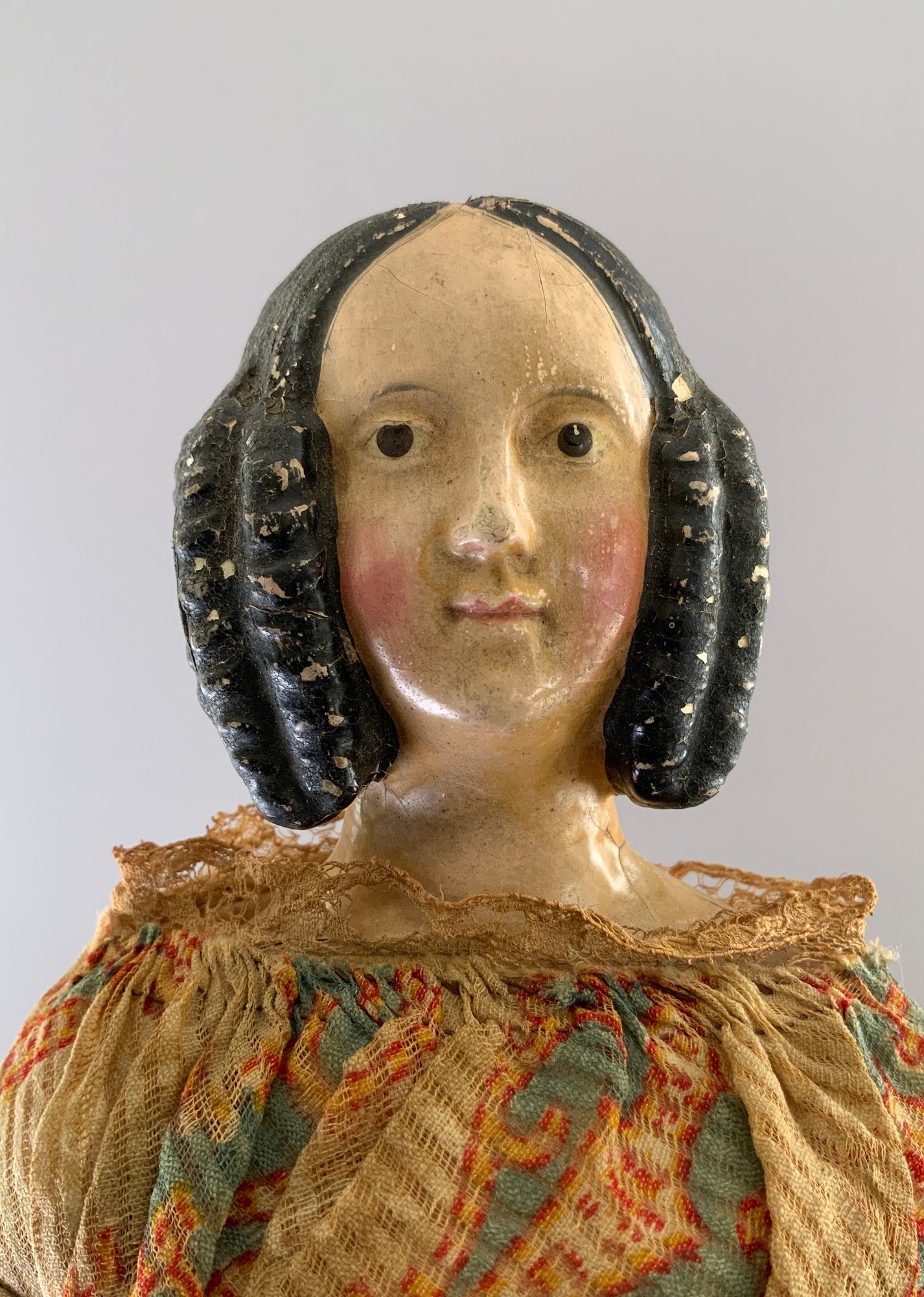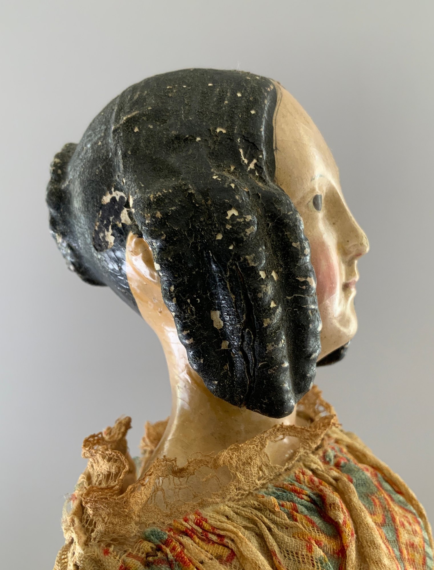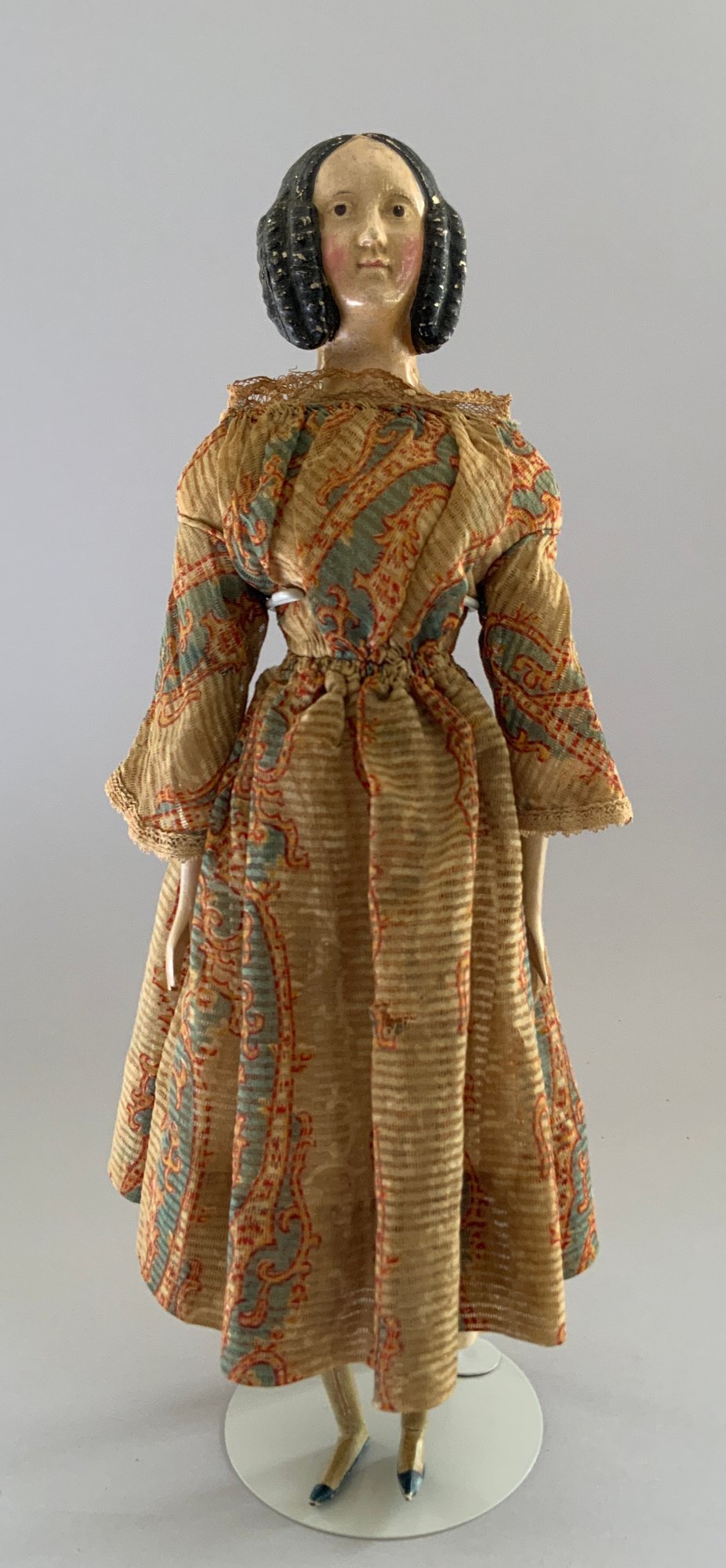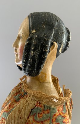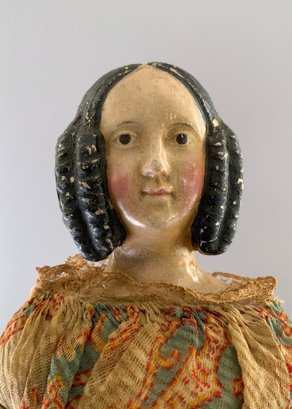 18” Paper mache shoulder head, painted features, center part black hair with back bun & side curls, kid body with wood limbs, early dress, blue painted shoes (crazing & cracks to shoulder plate, hair rubs)