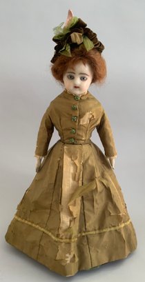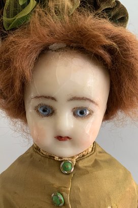18” Poured Wax S/H Doll w/ inset glass eyes, c/m, wax features flattened, mohair wig w/ hat of ribbons & beads, Kid body, wears a green silk walking suit (silk is melting), old unders, lace