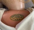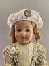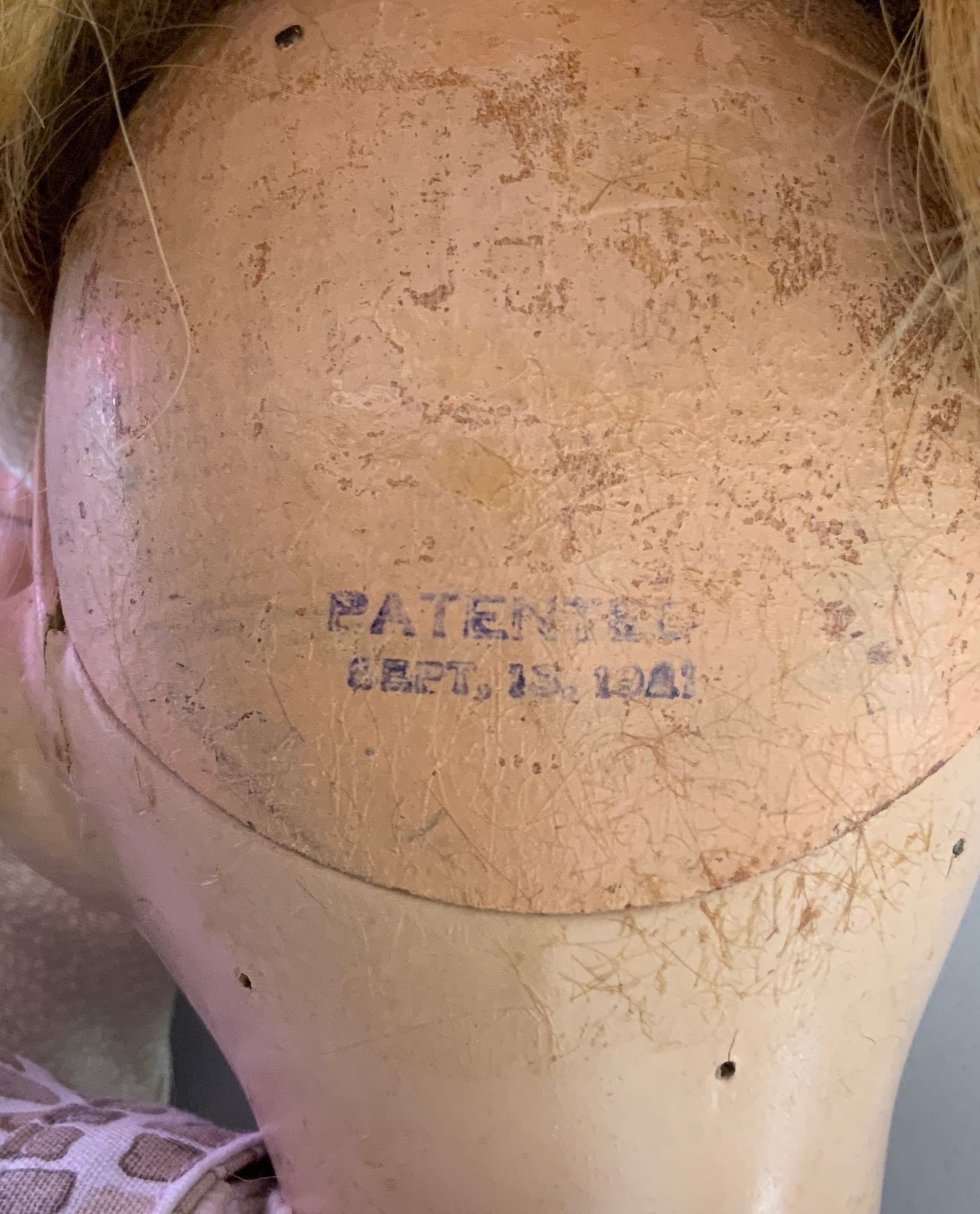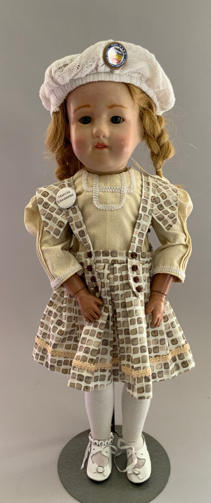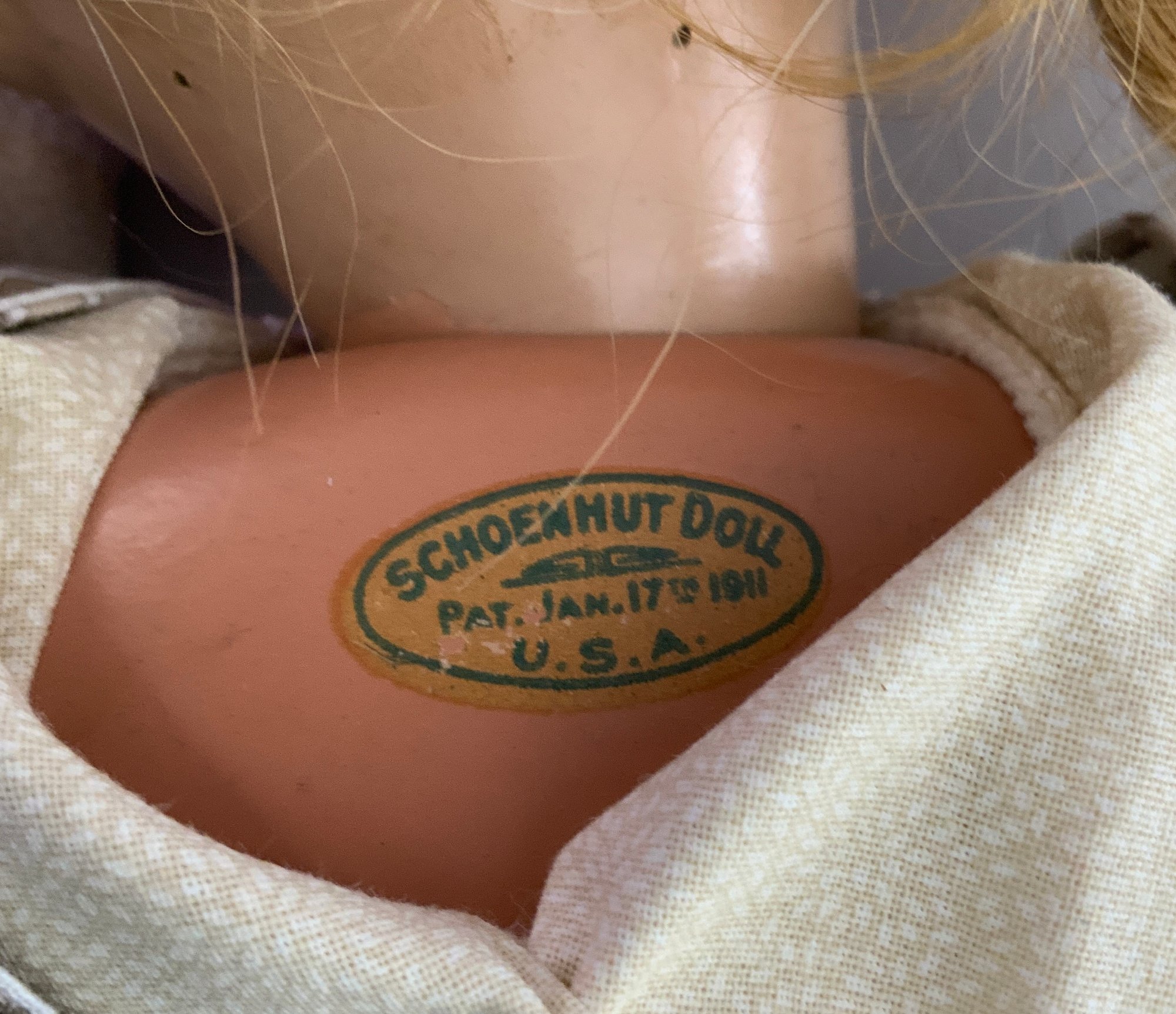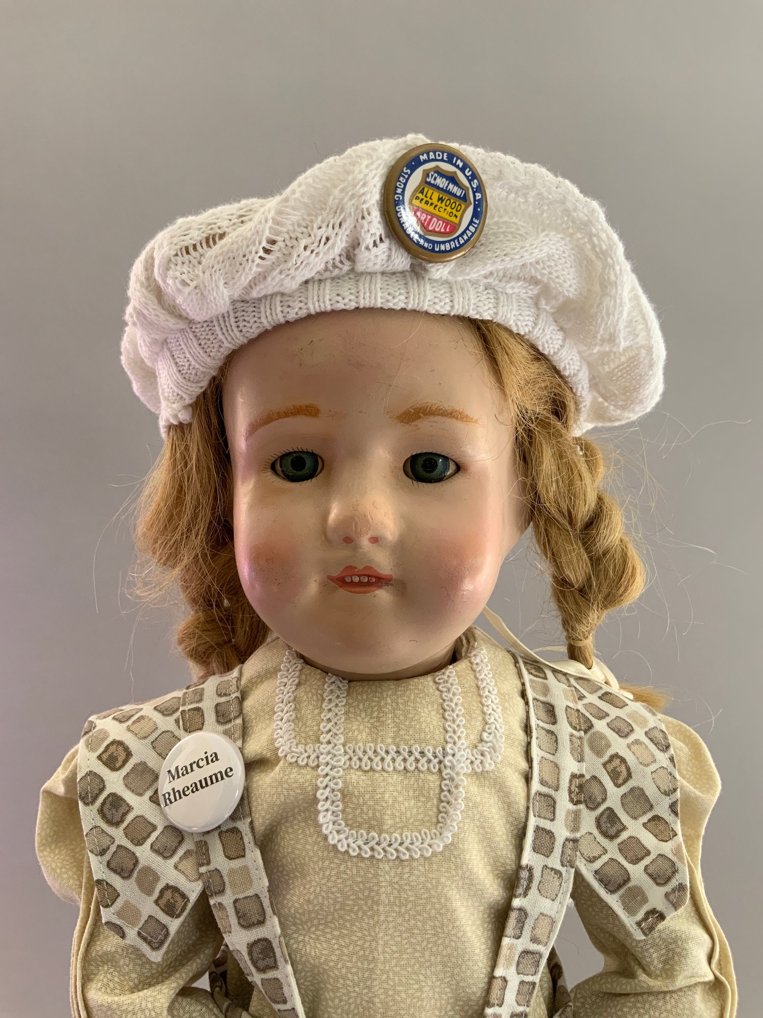 18” Schoenhut girl, painted features, blue glass sleep eyes, blonde mohair wig, green oval label & patent stamp on back of head, print dress, new Schoenhut shoes, facial repaint