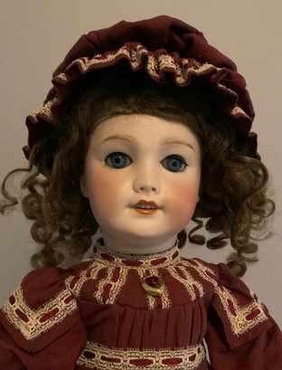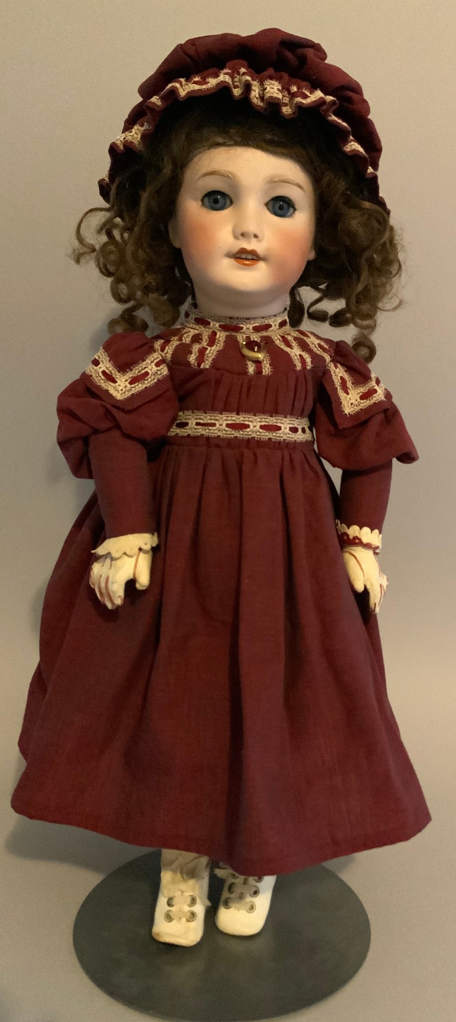 18” SFBJ 301 Paris 8 with red Tete Jumeau label, blue glass sleep eyes, OM with teeth, PE, brown mohair wig, crier compo body (not working), red dress, white leather gloves