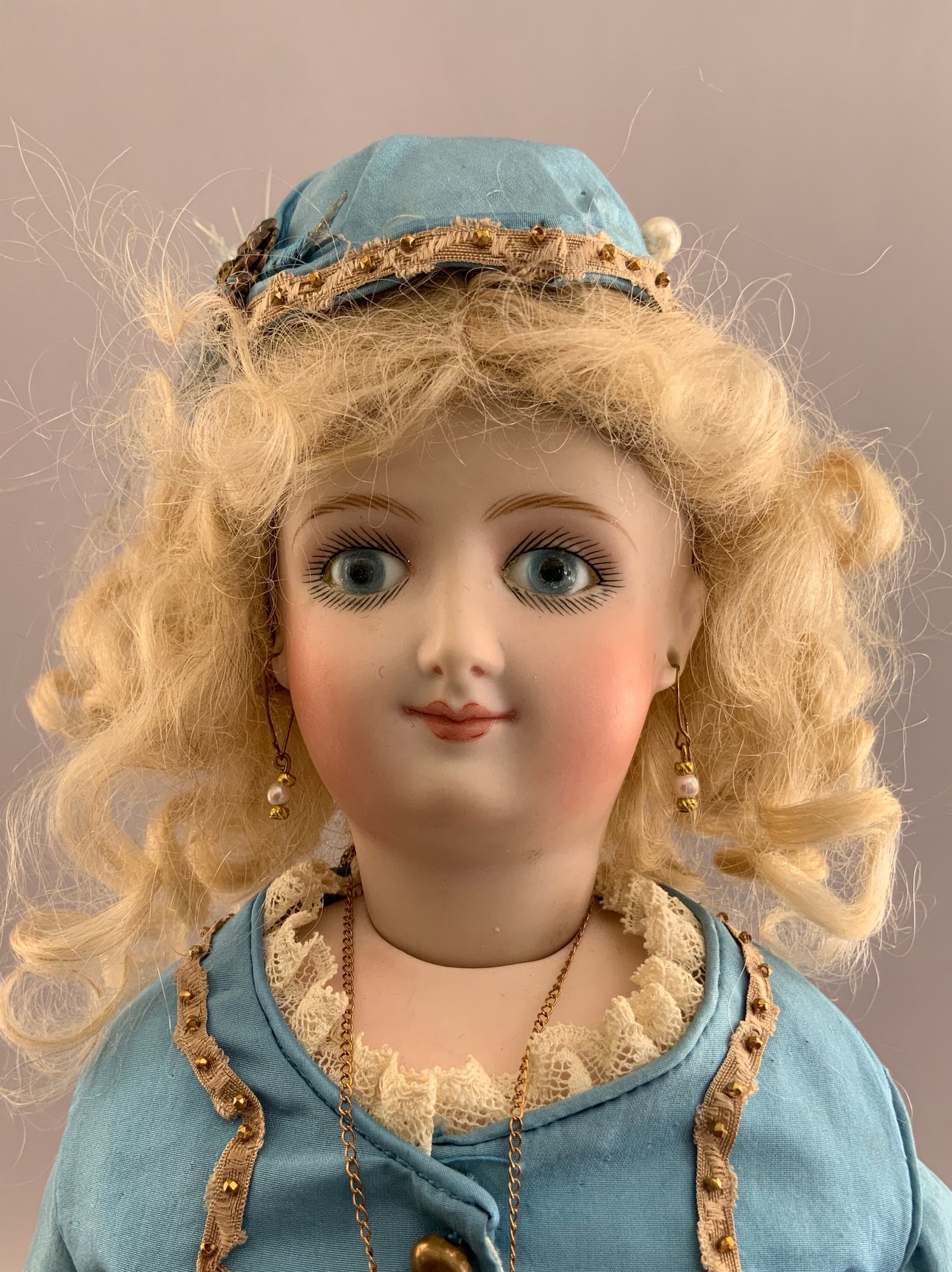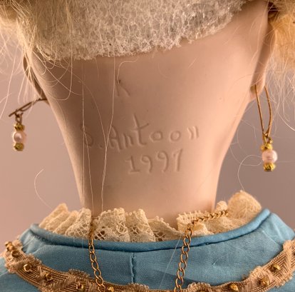18” Shirley Antoon Artist Doll: 1991 swivel head on bisque Shoulder plate, French Fashion K, blue glass paper weight eyes, CM, PE, blonde mohair wig, kid body with bisque arms, blue silk walking suit