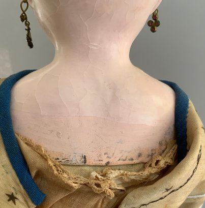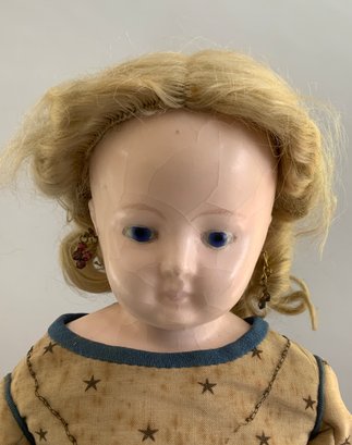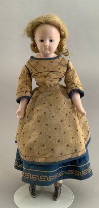18” Wax over compo, bald S/H doll, blue glass eyes, cloth body w/ wax arms & wax black boots, wax has surface cracks (appears to have been restored), she wears teal blue twill skirt trimmed with Greek Key trim, top and over skirt is wool w/ gold stars and teal trim (as-is)