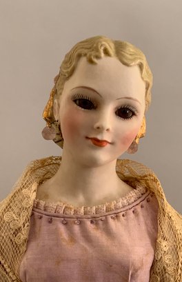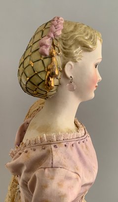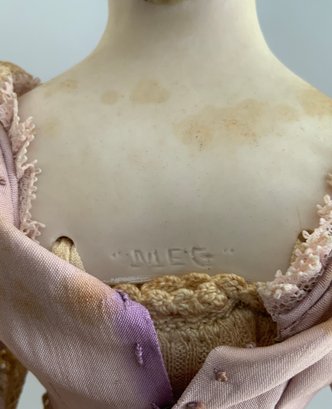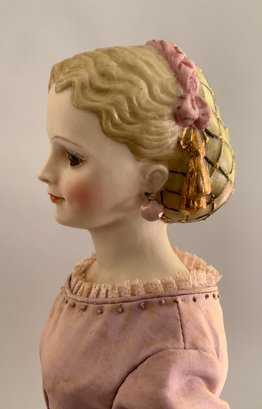 19” Artist doll by Martha Thompson signed “MDT ’82 “Meg”, Bisque S/H glass eyes, p/e, blonde hair w/ gold snood, cloth body w/ bisque limbs, wearing an antique pink silk & ecru lace gown