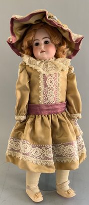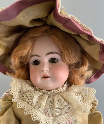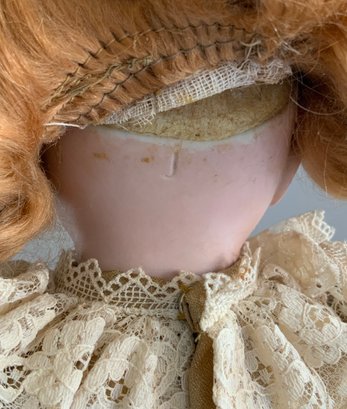 19” Bisque turned shoulder head incised J, brown glass sleep eyes, OM with teeth, red mohair wig, kid body with bisque arms, tan dress with lace trim, plaster pate