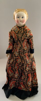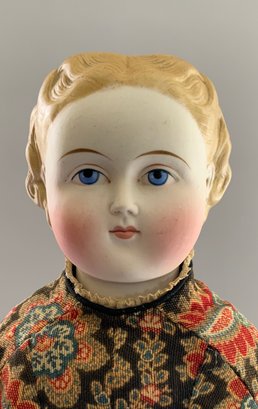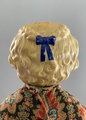 19” Blonde hair Parian, painted features with blue hair bow, PE, cloth body with compo arms, paisley dress (holes)