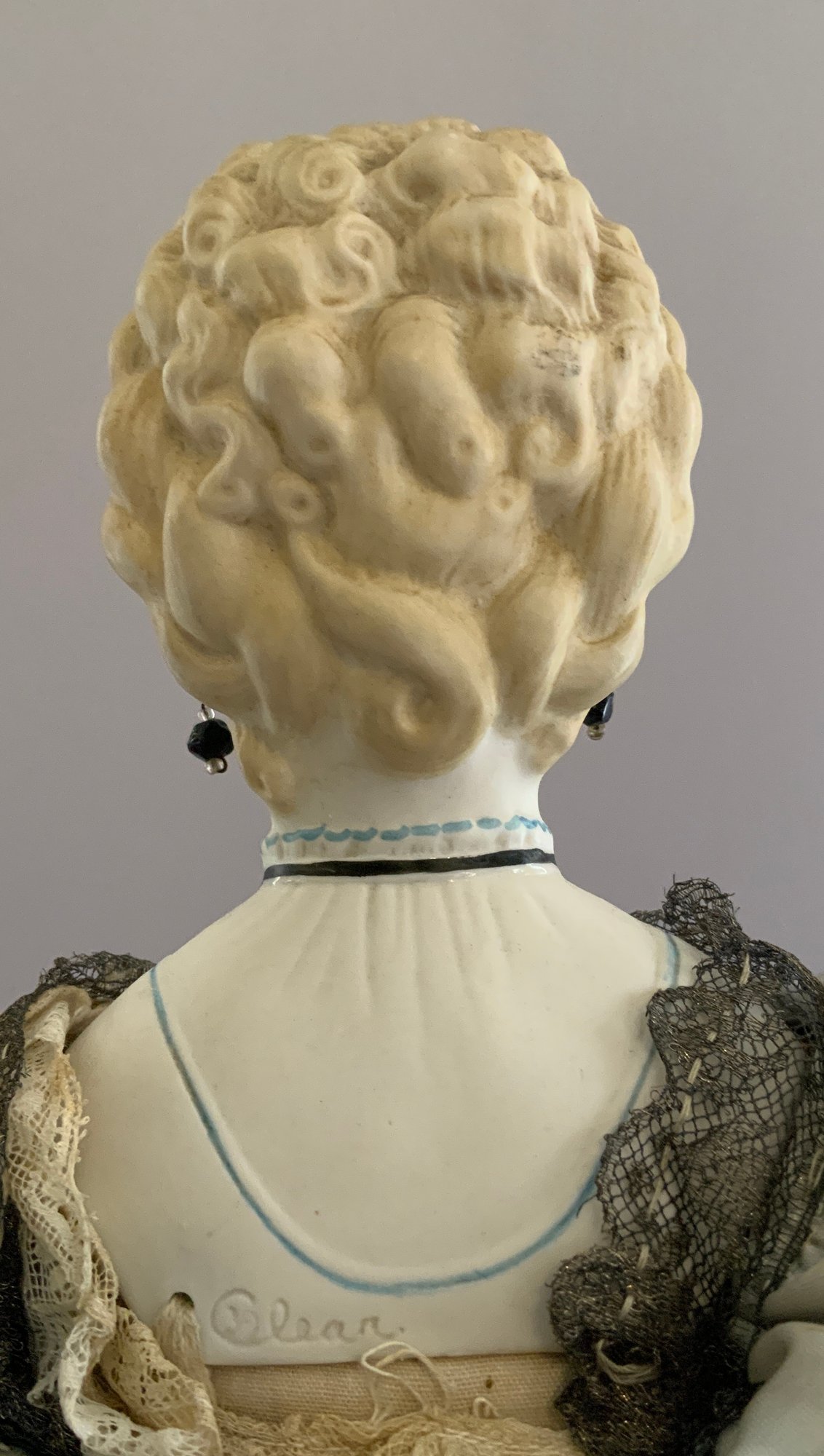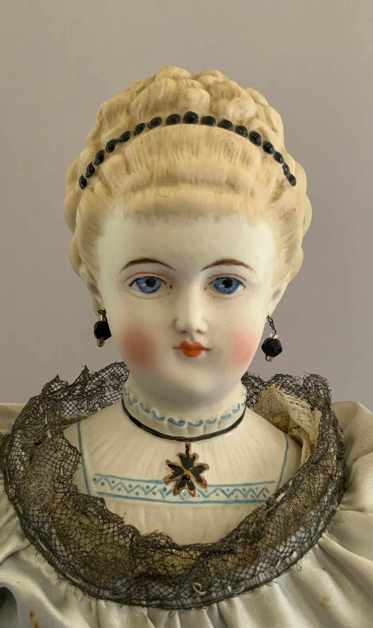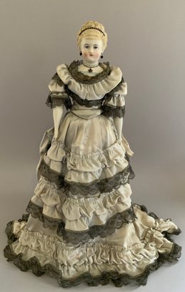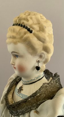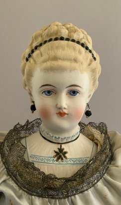 19” Emma Clear parian shoulder head artist doll, Kaiserina Augusta Victoria, painted features, PE, sculpted blonde hair with beaded band, fancy bodice, cloth body with parian limbs, blue ruffled court costume (light stains)
