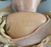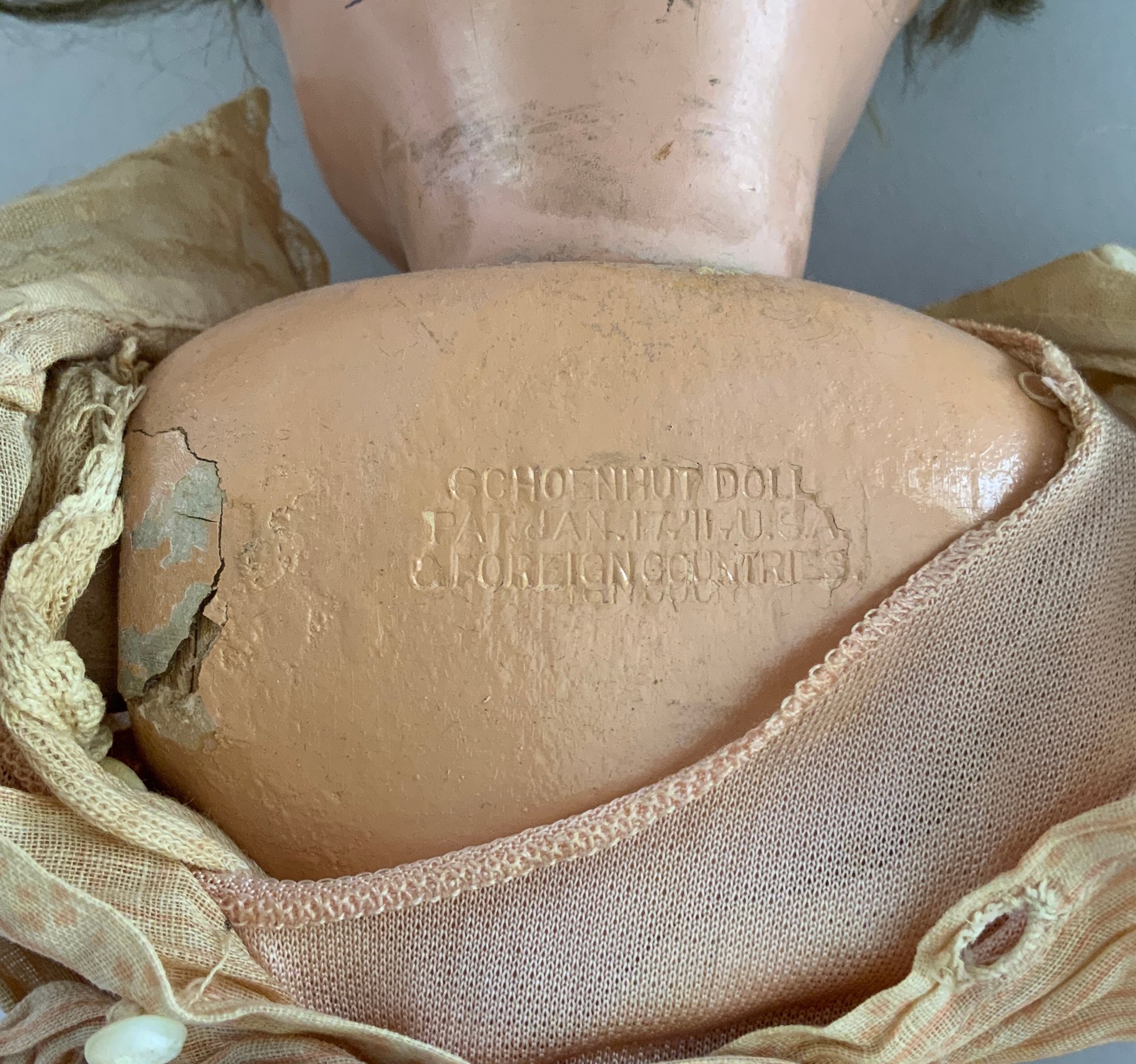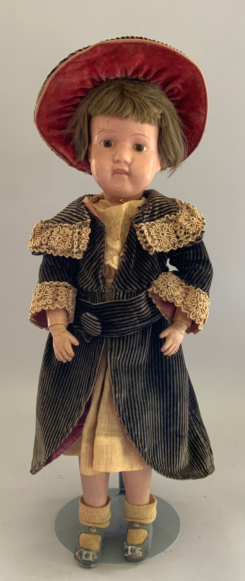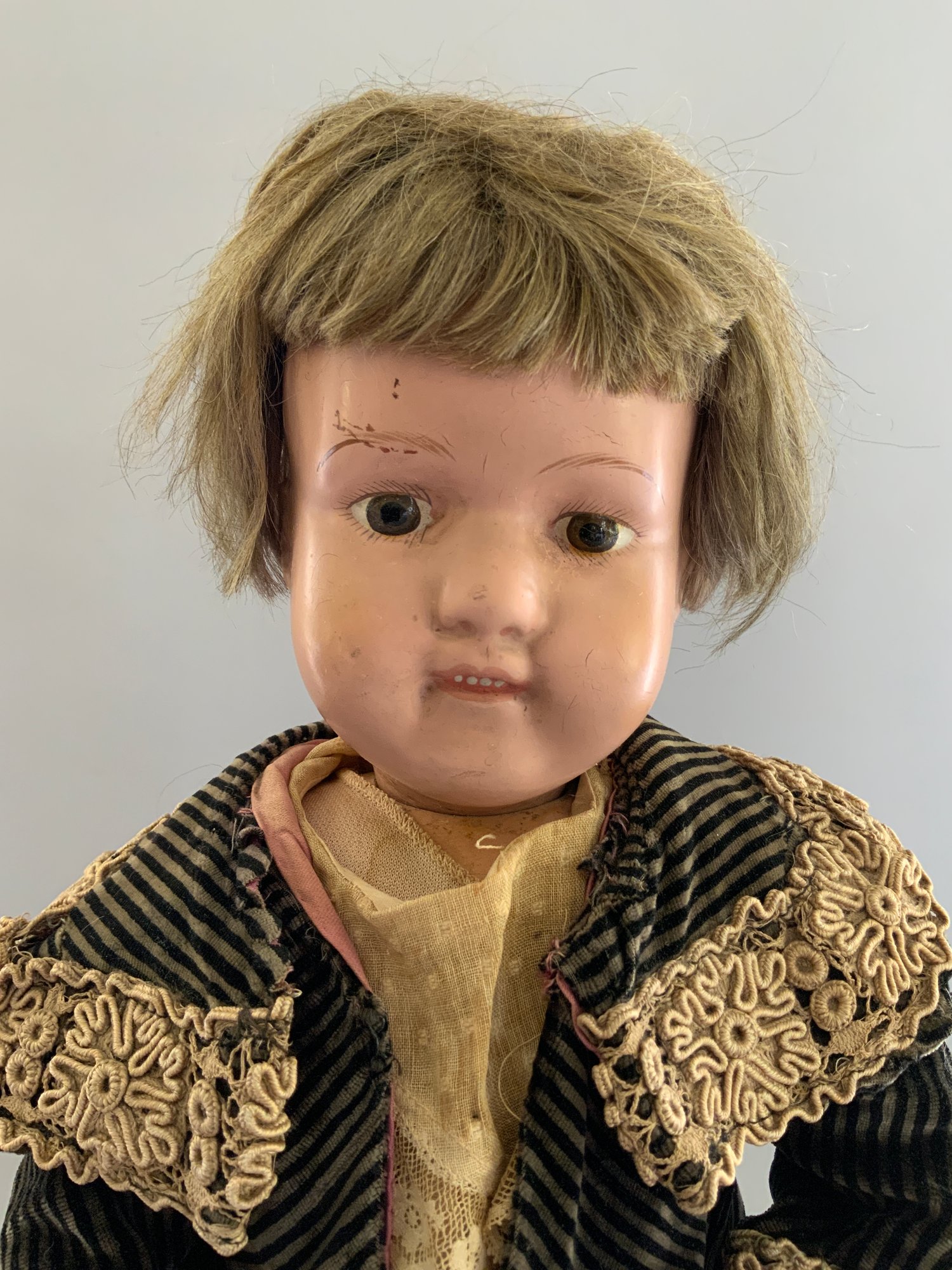 19” Schoenhut girl, painted features, blonde mohair wig, OM with teeth, incised mark, stripe velvet outfit, (wear, rubs)