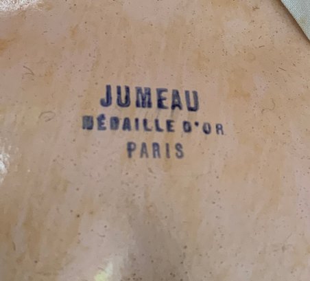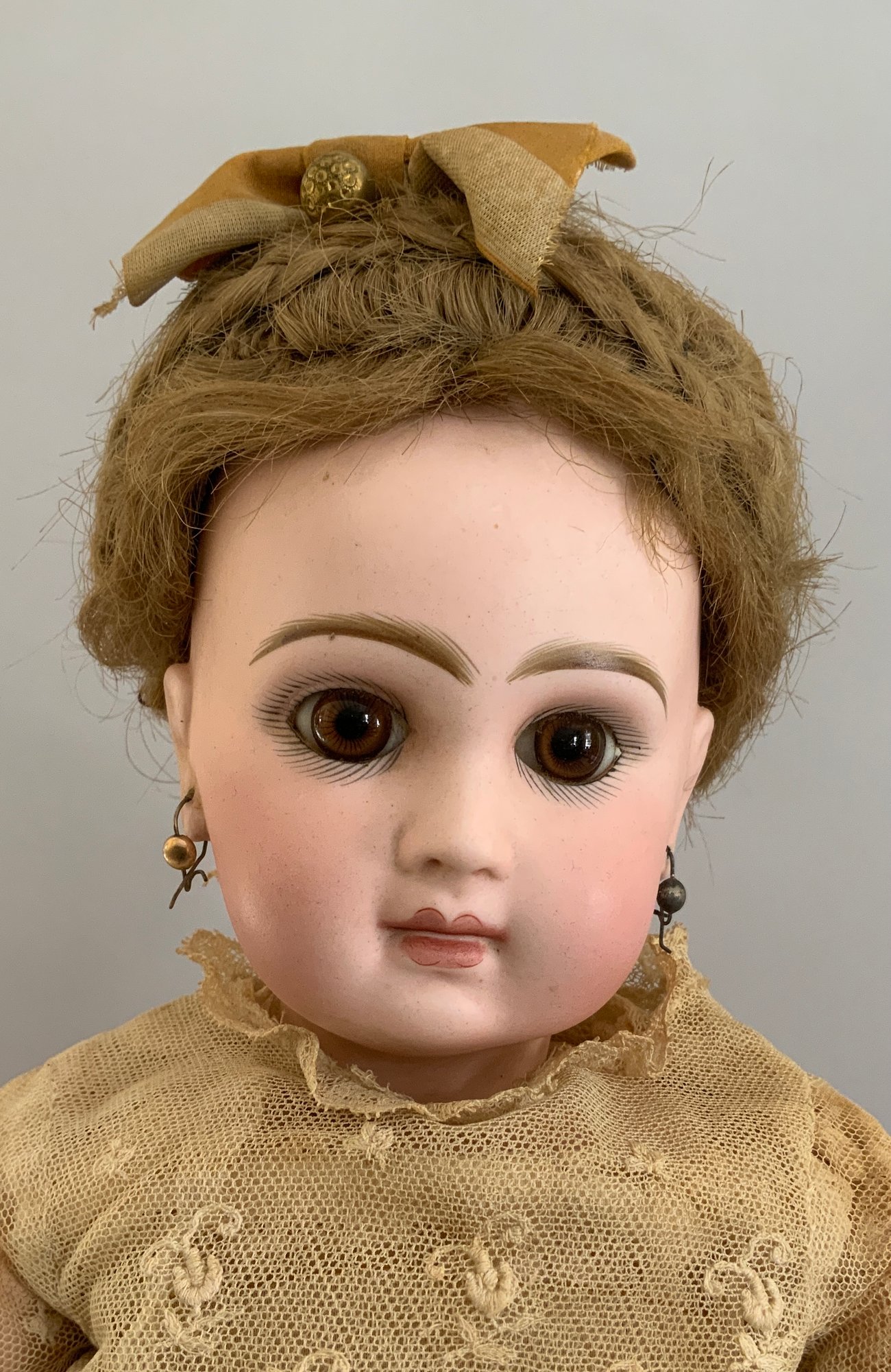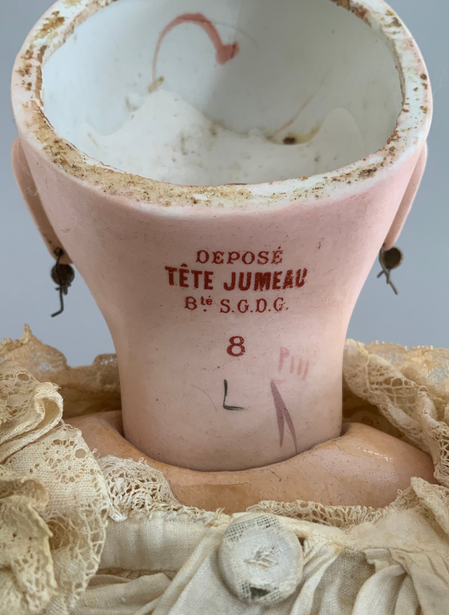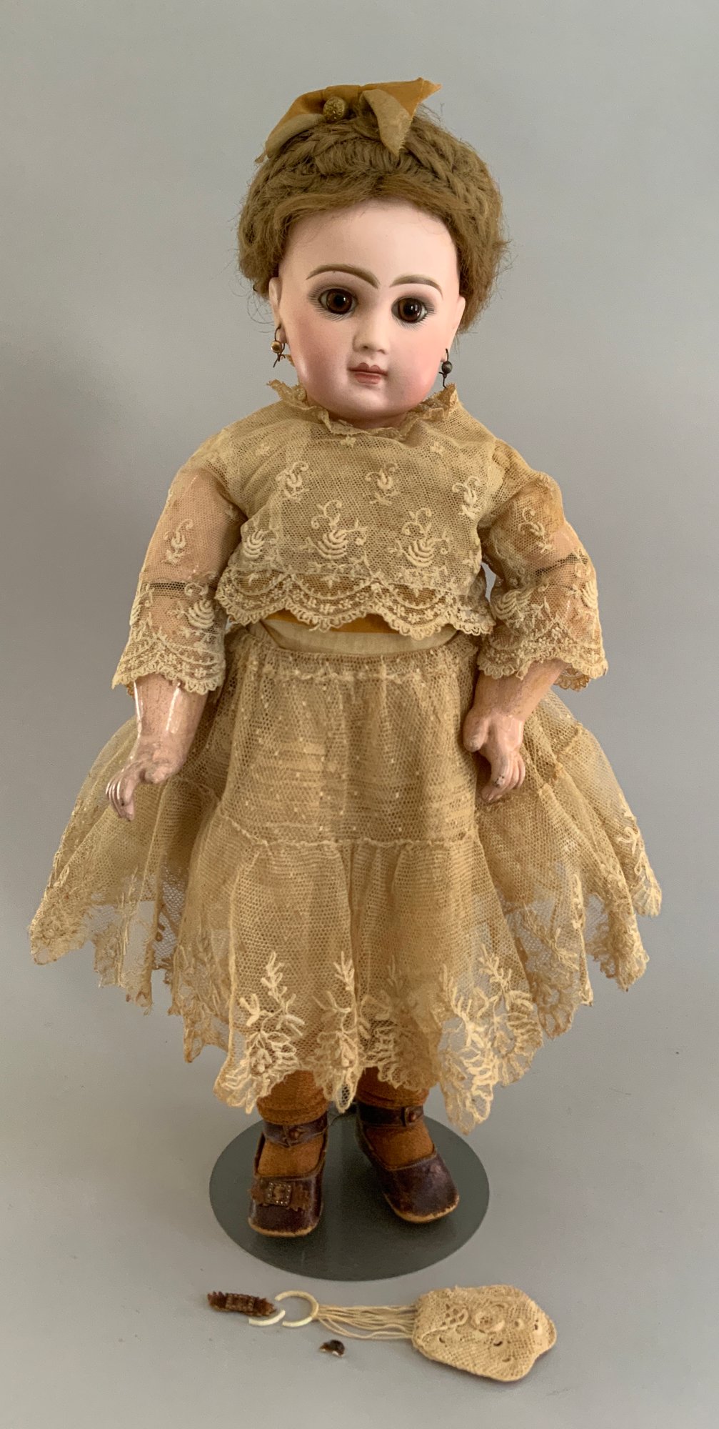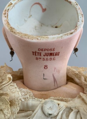 19 ½” Tete Jumeau 8 red label, brown glass eyes, CM, PE, blonde mohair wig, blue stamp Jumeau compo body (hands/fingers have repairs), antique lace outfit (wear)