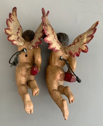 2 – 6” long Crèche carved wood angels with spread wings, painted features, rubs & minor paint loss (both have faint left arm lines at shoulder), probably German, very good details, ( 1 has right finger tip break)