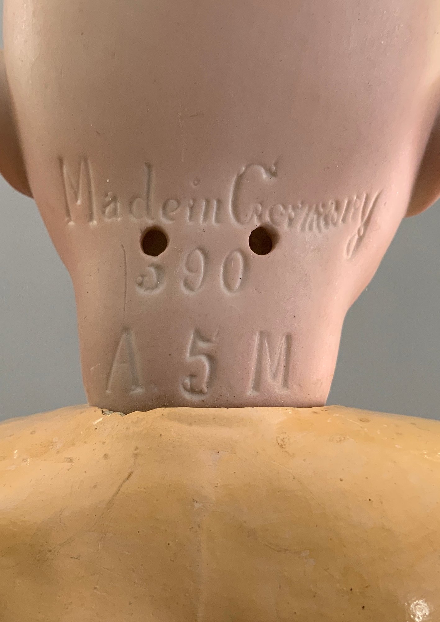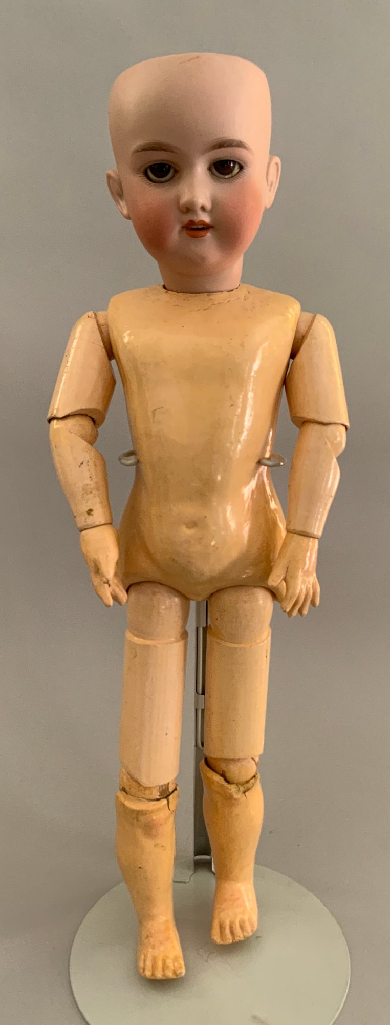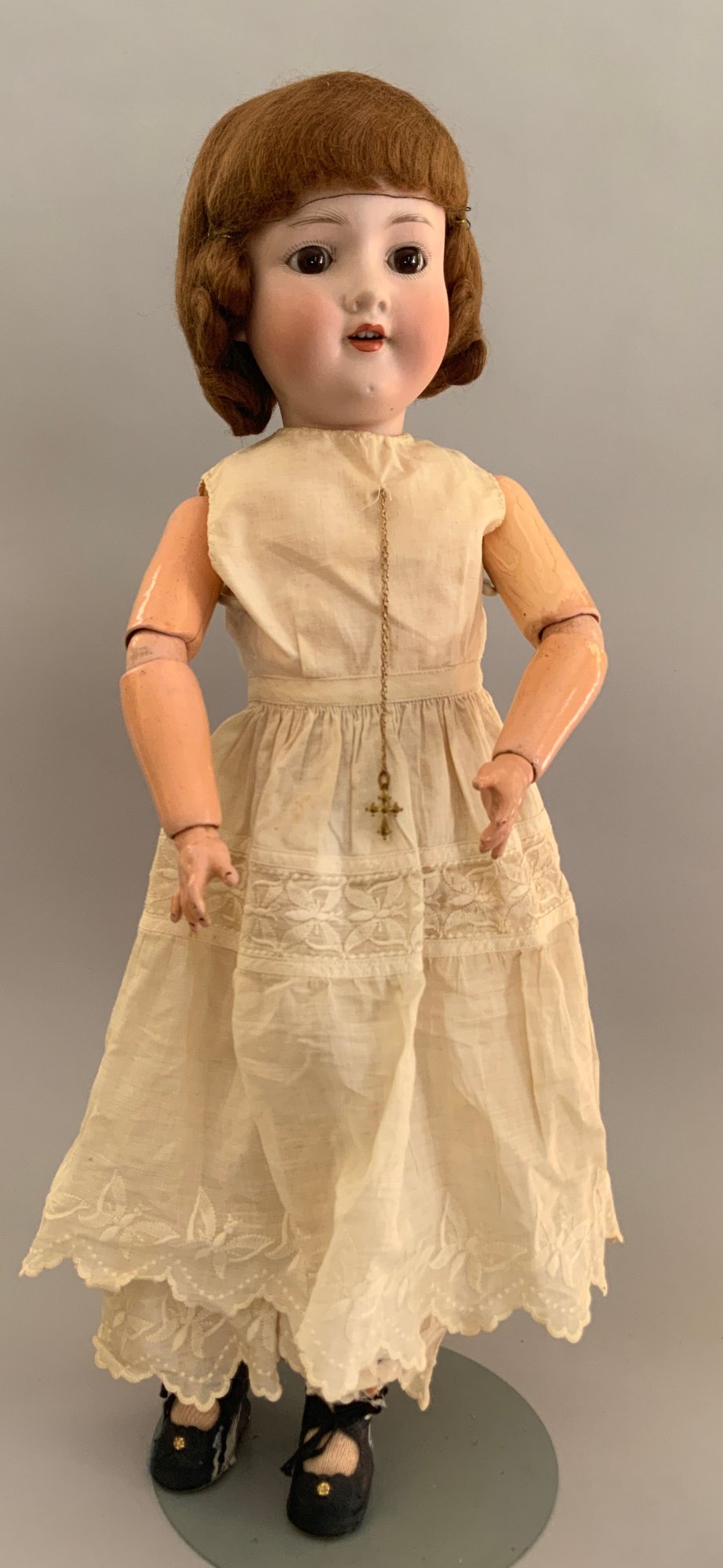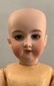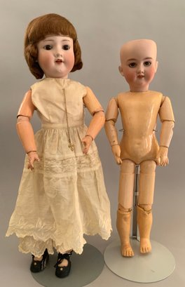 2 – AM 390’s, 1 – 21”, brown glass eyes, OM with teeth, red mohair wig, BJCB, white dress,(tiny black spot below chin) & 1 – brown glass sleep eyes, OM with teeth, BJCB (chips), no wig or clothes