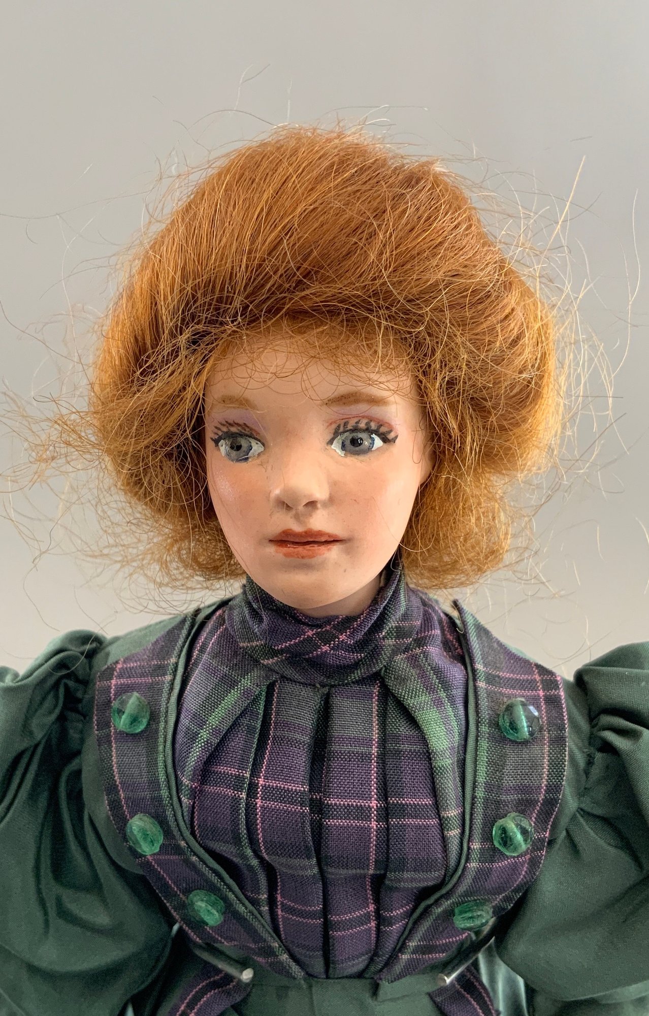 2 – Artist dolls, 1 - 13” Bea (Darlene) Lane fashion doll, painted features, blonde mohair wig, cloth body with bisque arms, green/blue plaid dress & 1 – 10” Cathy Hansen fashion doll, painted features, red Gibson girl hairdo, kid body with porcelain limbs, green dress