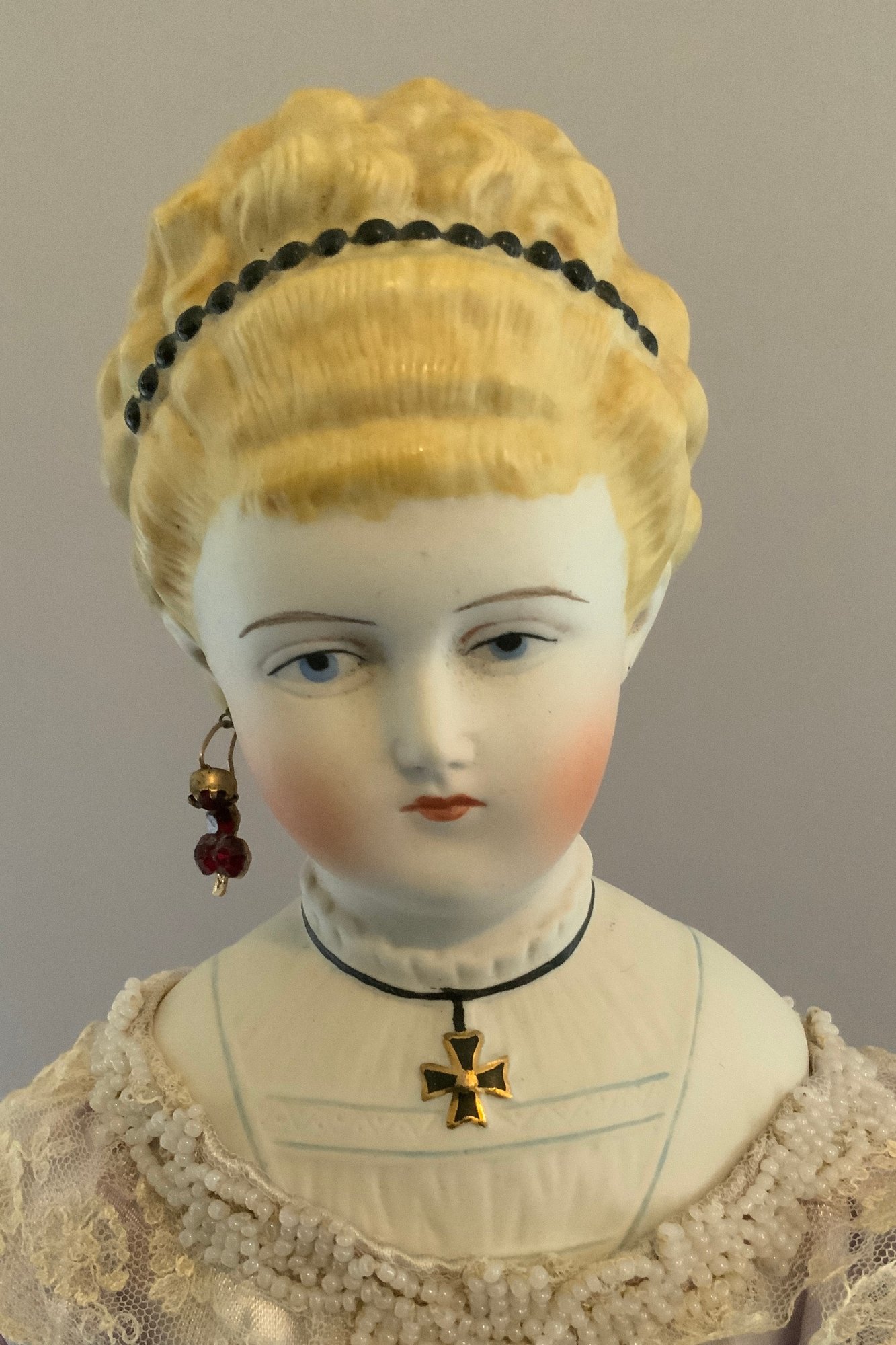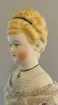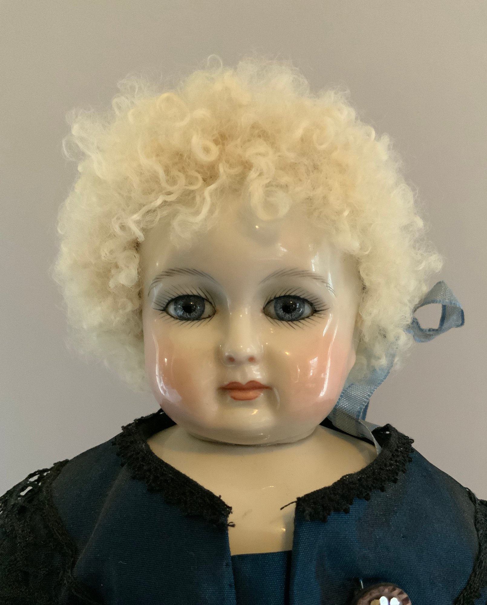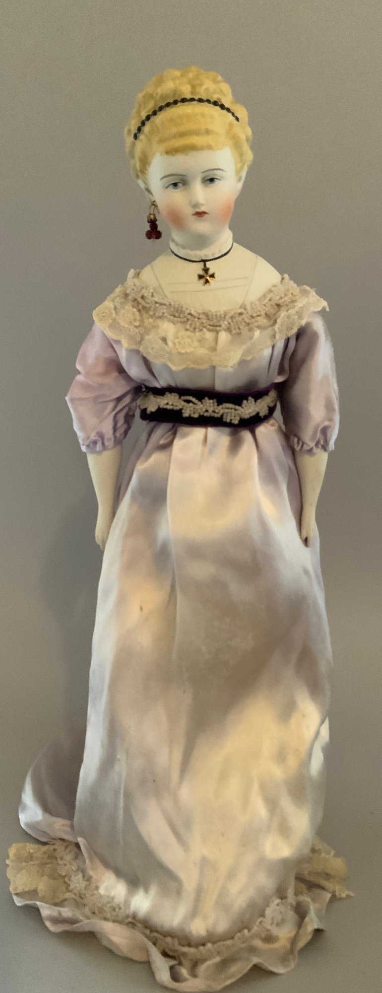 2 – Artist dolls 1 -18 ½” Emma Clear parian shoulder head artist doll, painted features, PE, fancy bodice, cloth body with parian limbs, silk violet dress (faded & melting), & 1 – 16” Huret type artist doll, blue glass eyes, blonde skin wig, kid body with bisque arms, blue/black dress