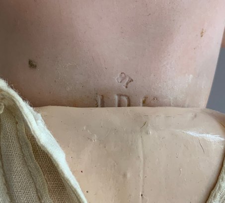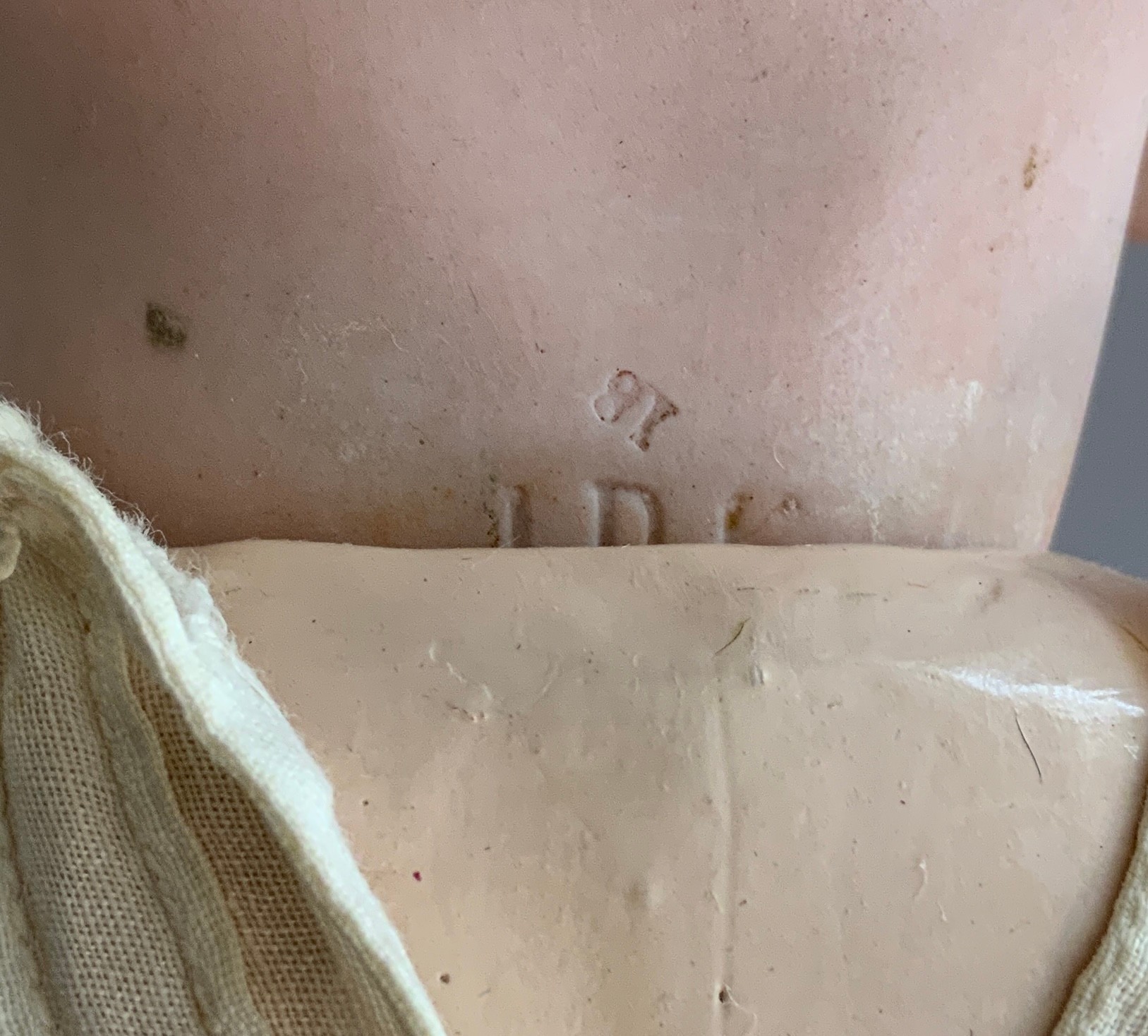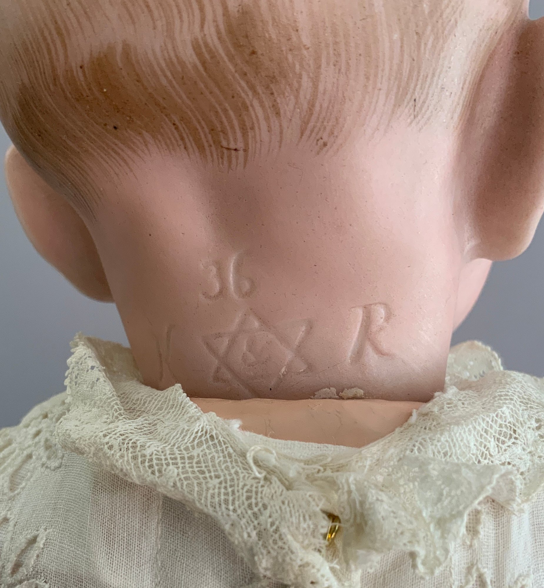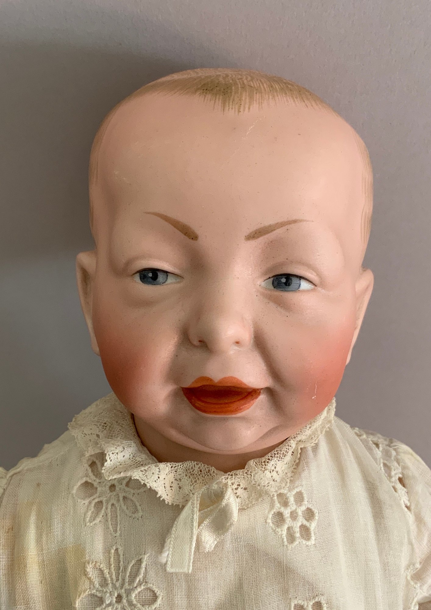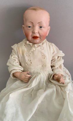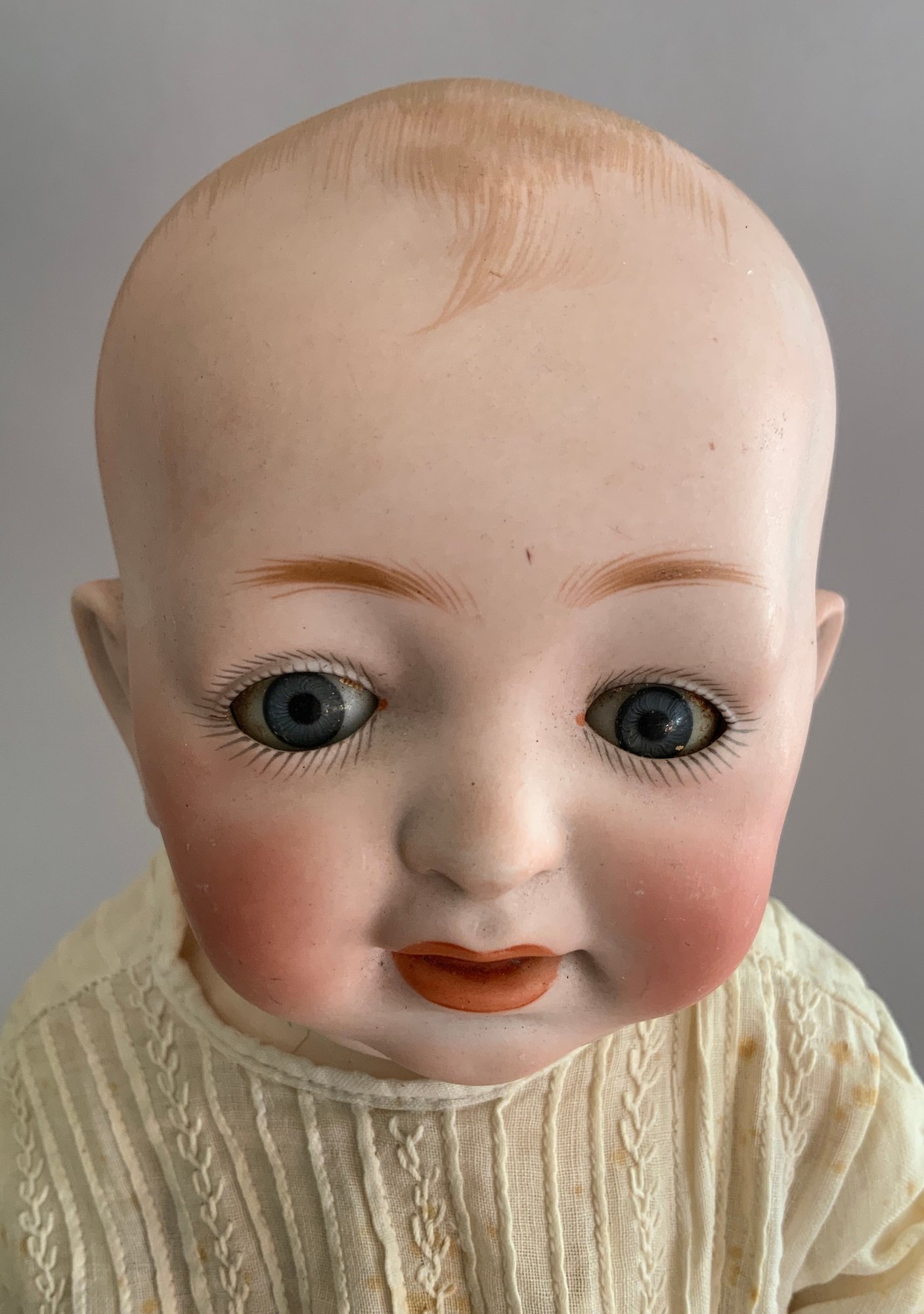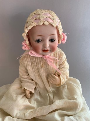 2 – Bisque head baby dolls, 1 – 13” K*R 100 character baby, painted features, baby compo body, white christening dress, & 1 – 12” JDK character baby, blue glass sleep eyes, OM with 2 teeth, baby comp body (light crazing), white christening dress (light stains)