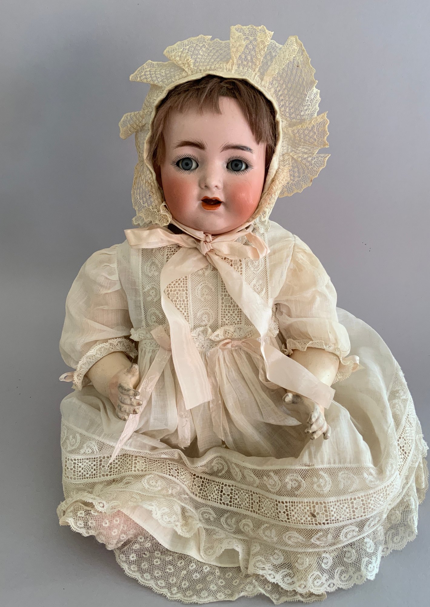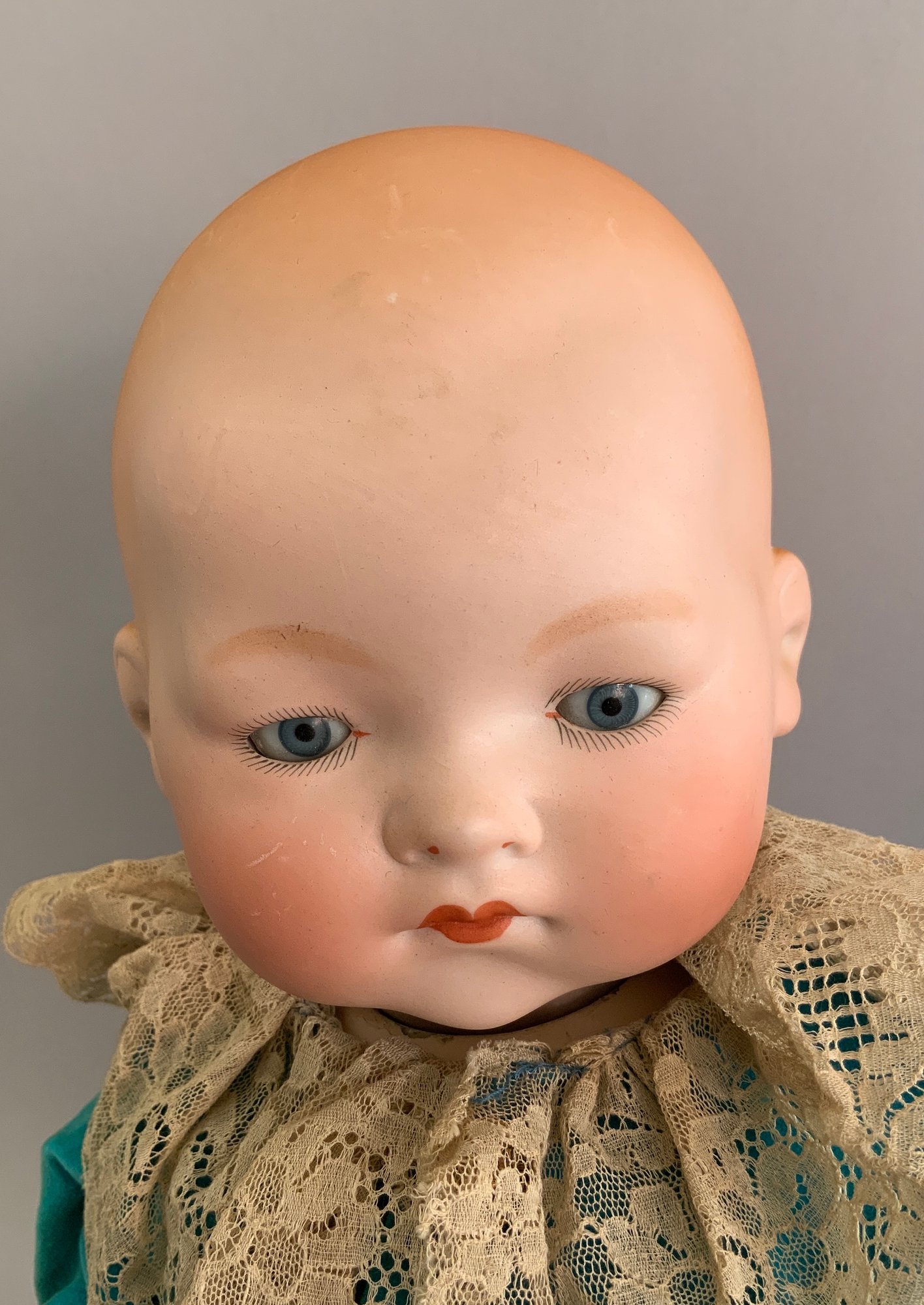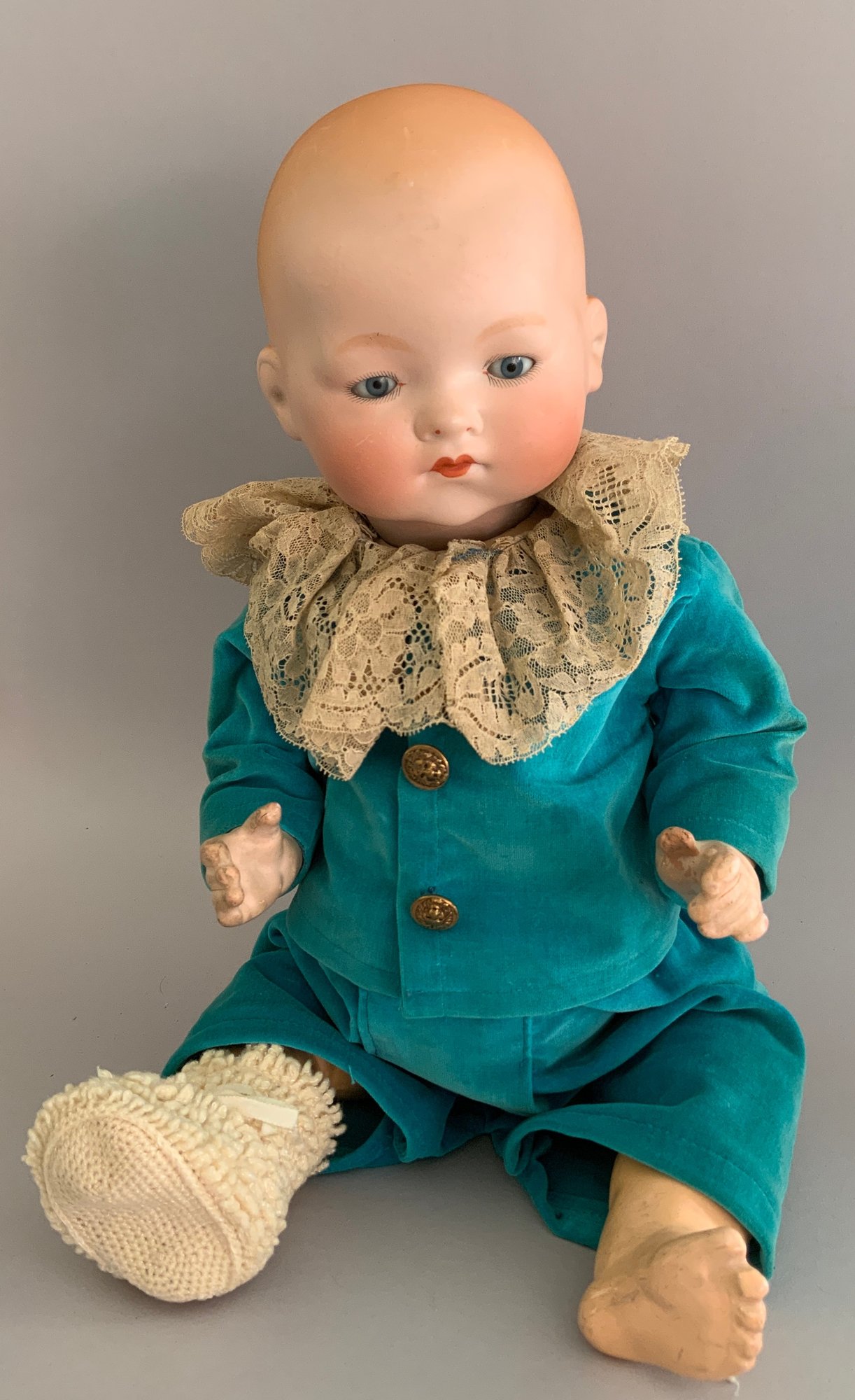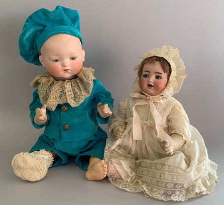 2 Bisque head baby dolls, 1 – 18” AM 341, blue glass eyes, baby compo body (broken thumb left hand), teal outfit, & 1 – 14” K*R 120, blue glass flirty eyes, OM with teeth, baby compo body, white dress
