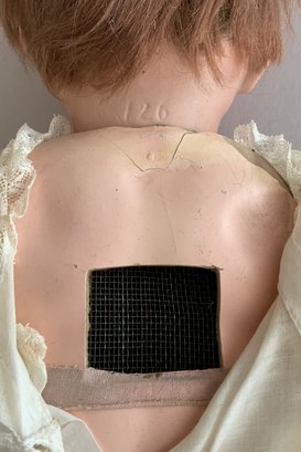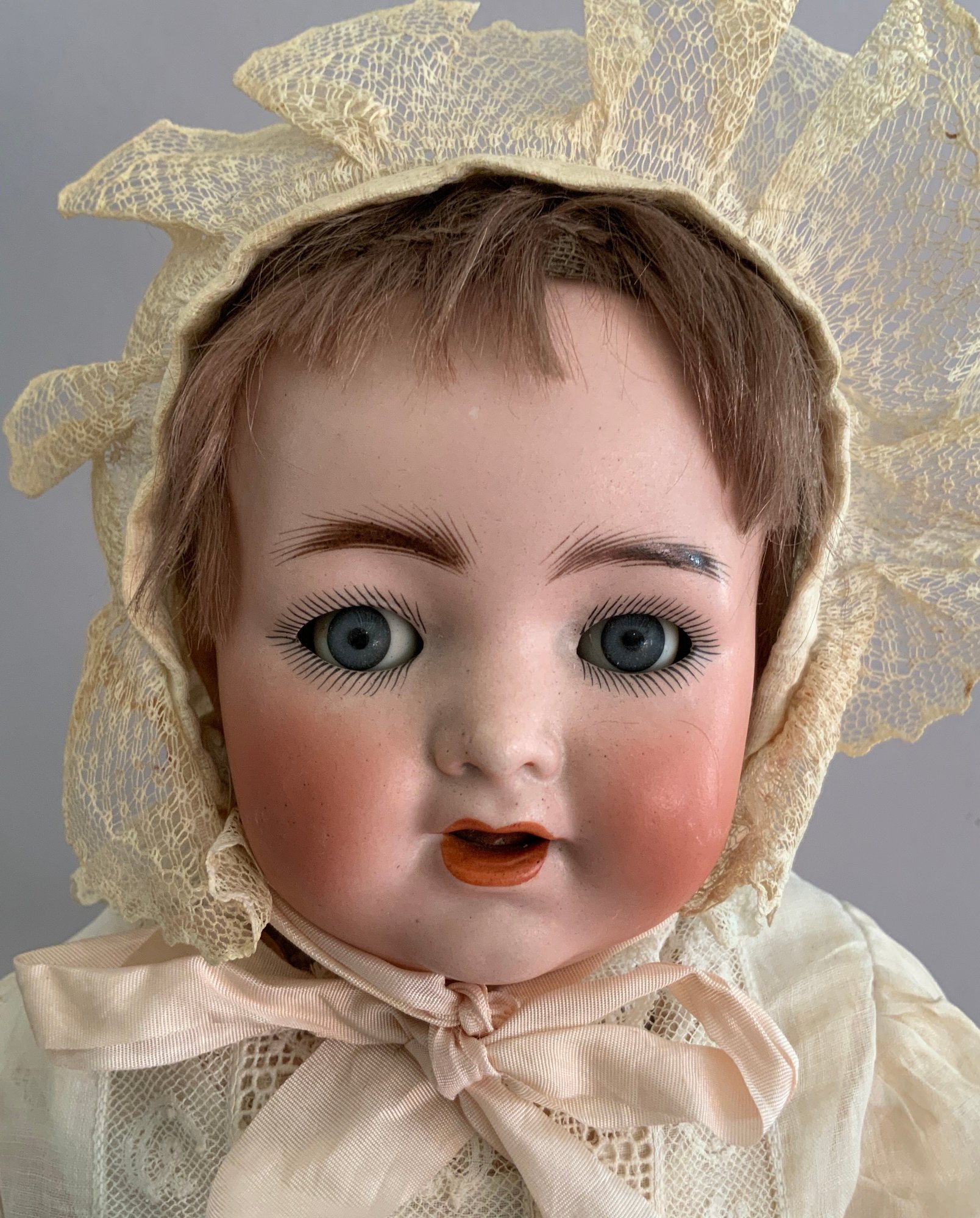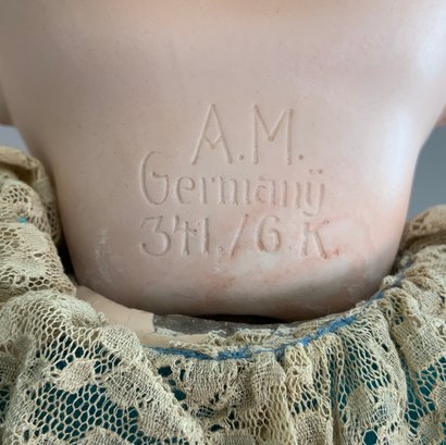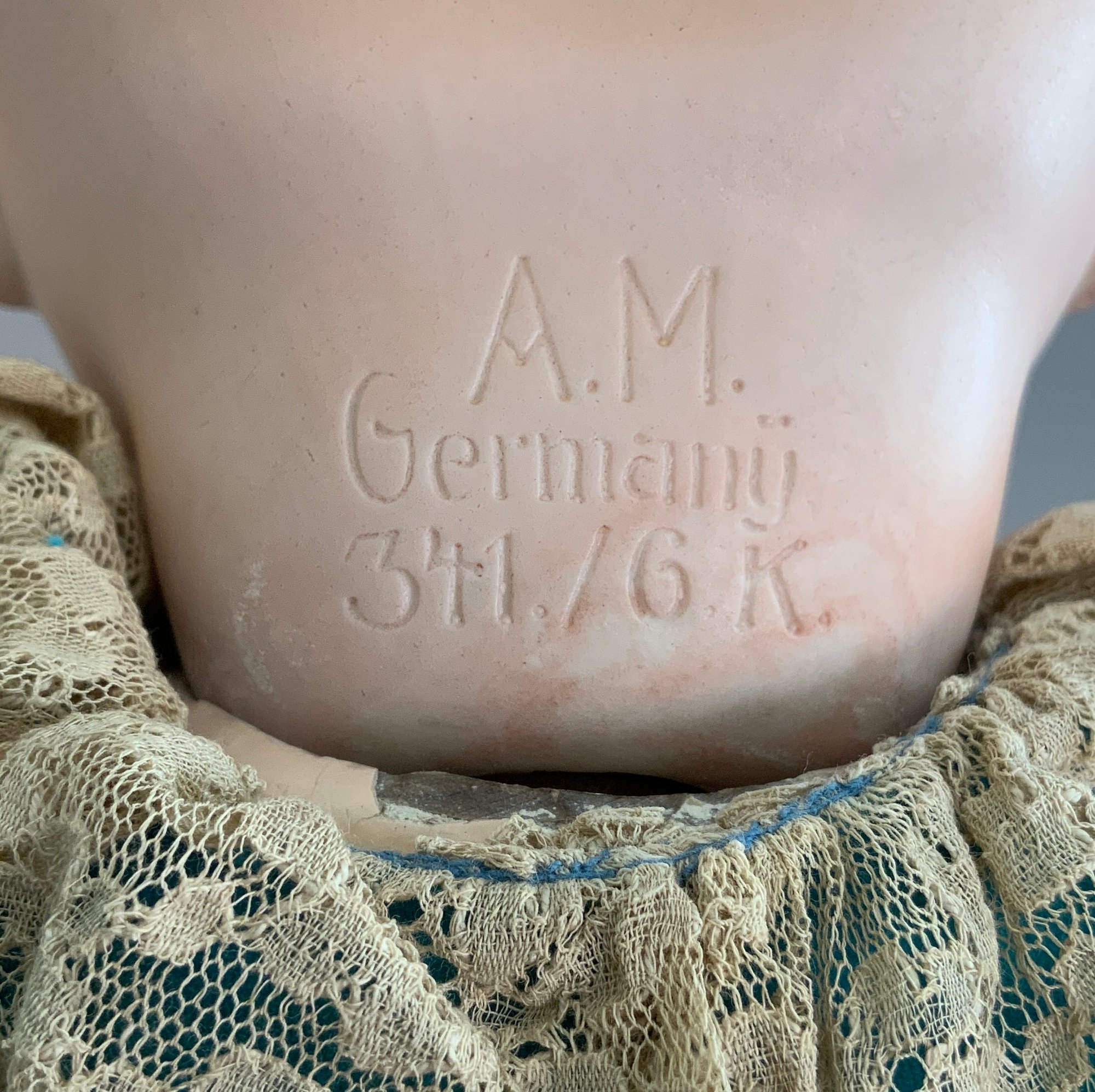 2 Bisque head baby dolls, 1 – 18” AM 341, blue glass eyes, baby compo body (broken thumb left hand), teal outfit, & 1 – 14” K*R 120, blue glass flirty eyes, OM with teeth, baby compo body, white dress