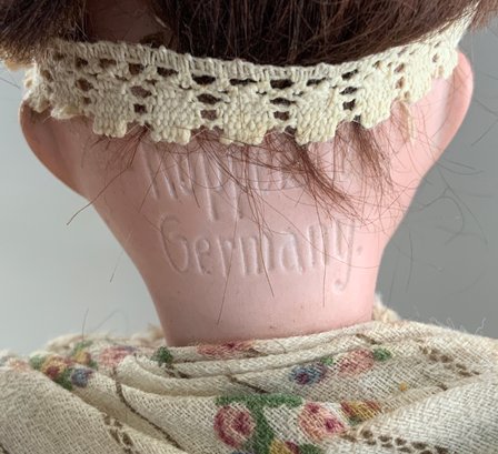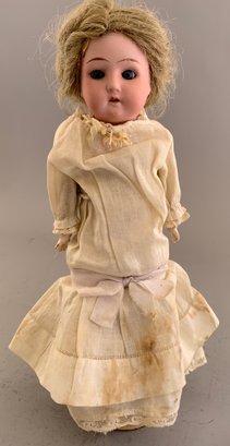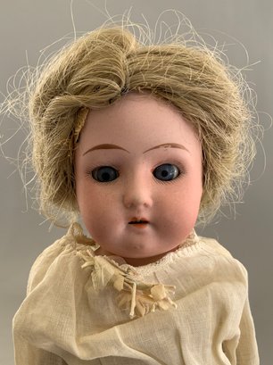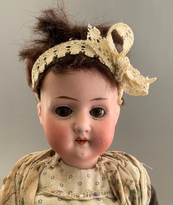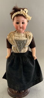 2 – Bisque head dolls, 1 – 11” Heubach Koppelsdorf 200, brown glass eyes, OM with teeth, brown mohair wig, compo body, black skirt (rim chip under wig, nose rub), & 1 – 11” shoulder head Heubach Koppelsdorf 250, blonde glass sleep eyes, OM with teeth, blonde mohair wig, cloth body with bisque arms, white dress (stains)