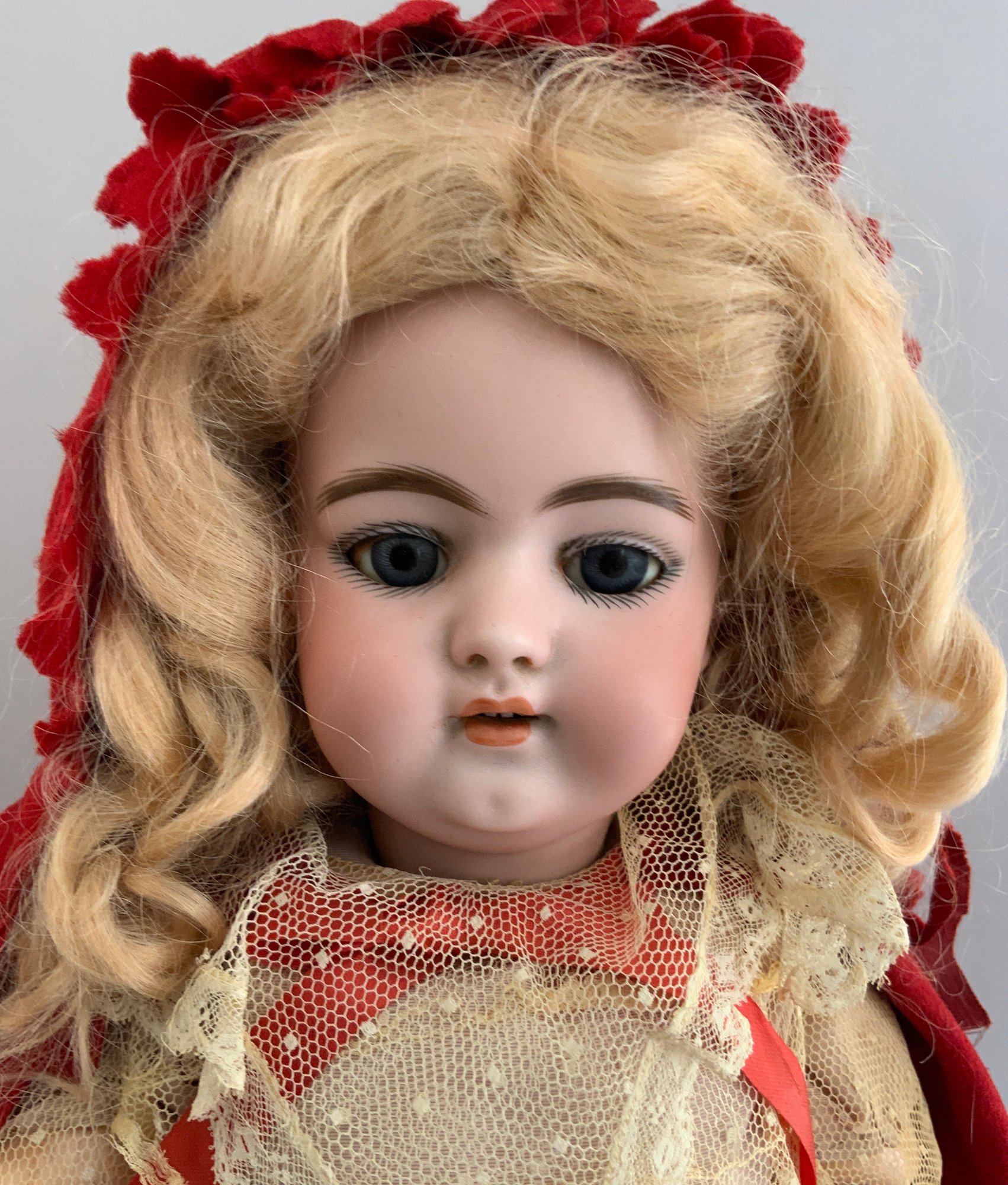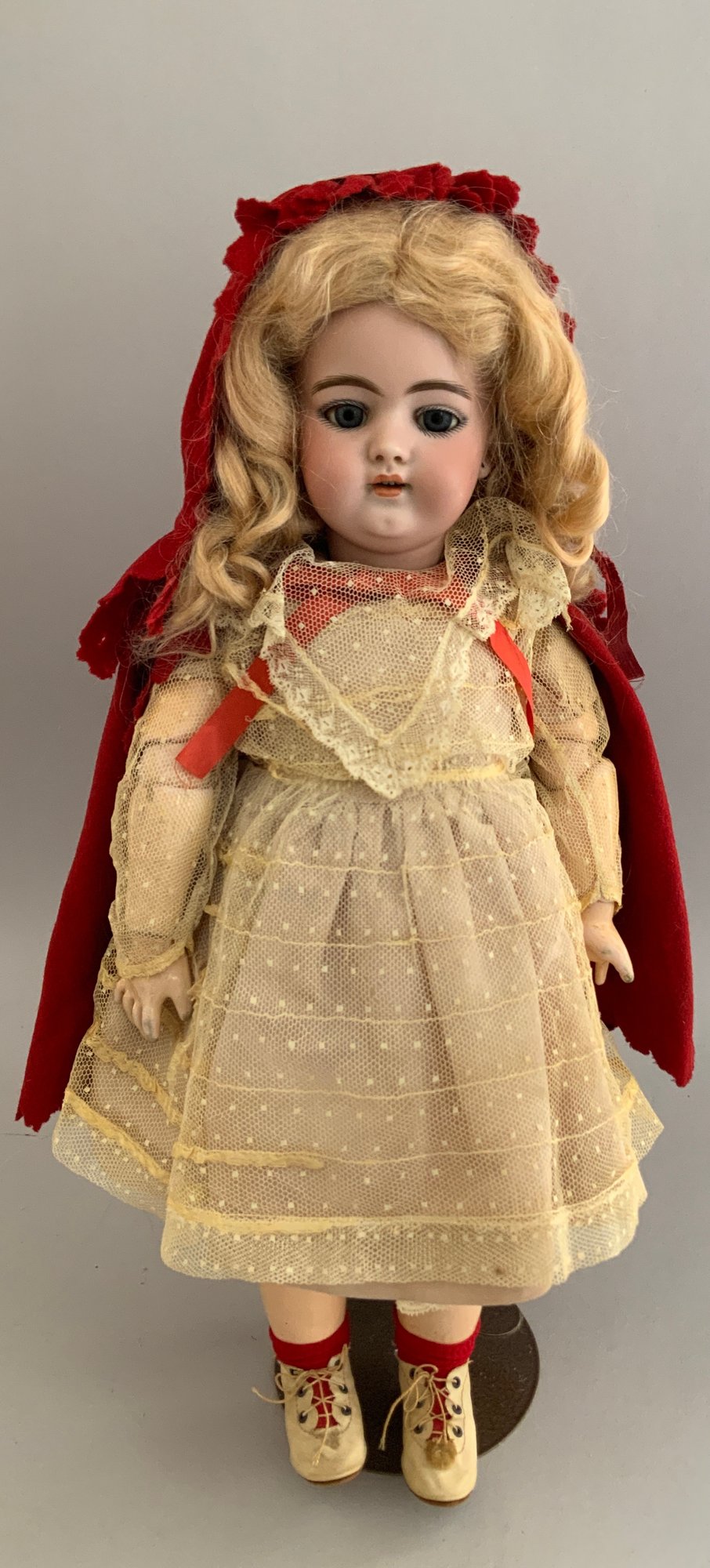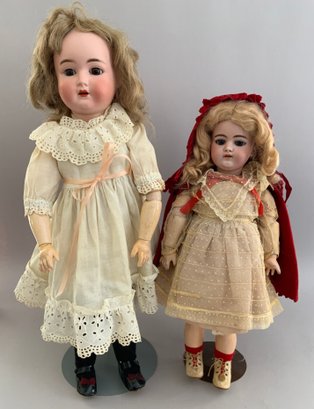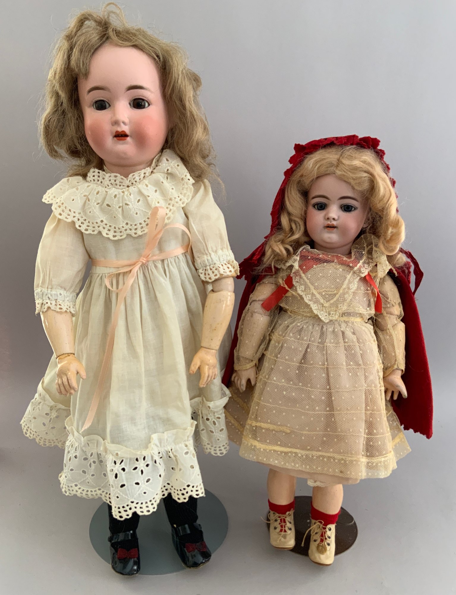 2 – Bisque head dolls, 1 – 24” A W Special, brown glass sleep eyes, OM with teeth, blonde mohair wig, BJCB, white dress (rough forehead), & 1 – 18” S&H 1079, blue glass sleep eyes, OM with teeth, blonde mohair wig, BJCB, red cape (wear) (head loose)