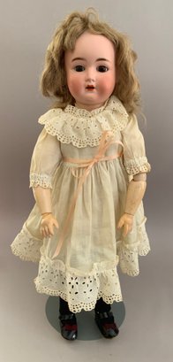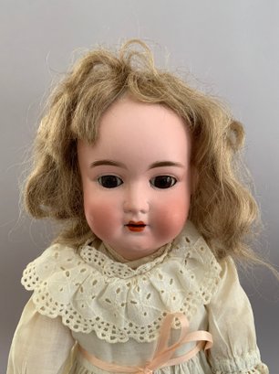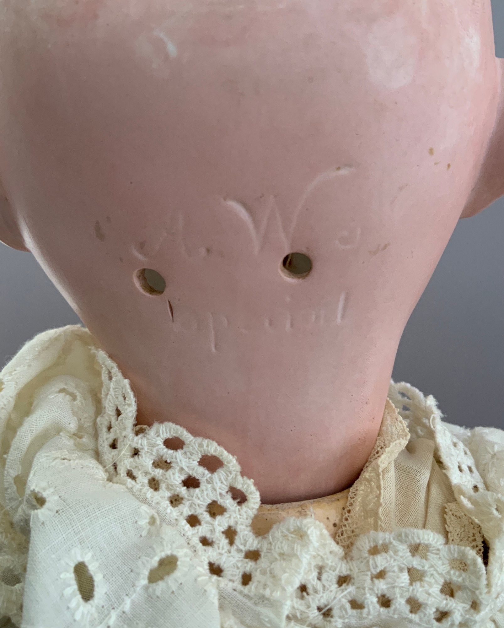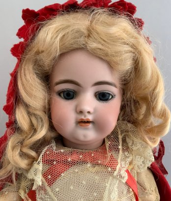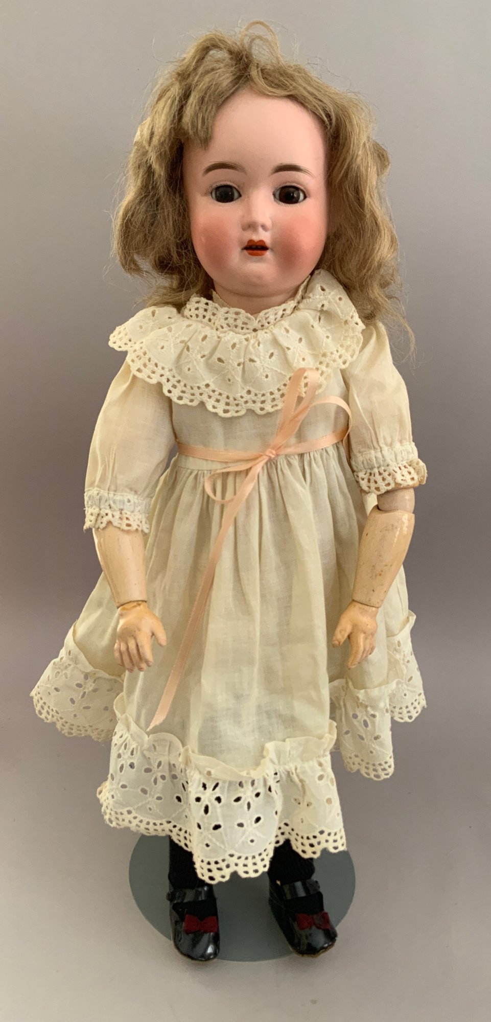 2 – Bisque head dolls, 1 – 24” A W Special, brown glass sleep eyes, OM with teeth, blonde mohair wig, BJCB, white dress (rough forehead), & 1 – 18” S&H 1079, blue glass sleep eyes, OM with teeth, blonde mohair wig, BJCB, red cape (wear) (head loose)