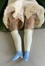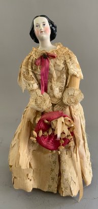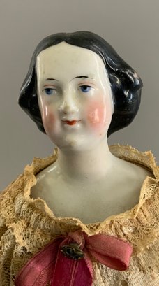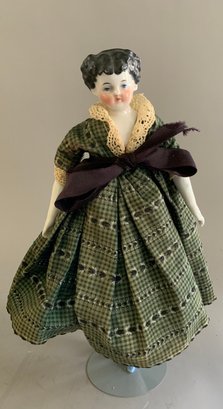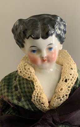 2 – Black hair china dolls, 1- 12” shoulder head, painted features, swept back hair (some rubs), cloth body, silk floral dress (melting badly), & 1 – 10 ½” shoulder head, center part, painted features, cloth body (rough shape, leaky legs), china limbs, green dress