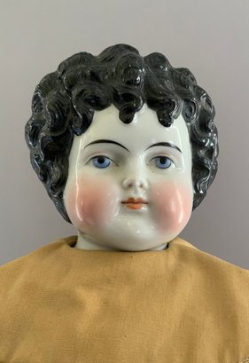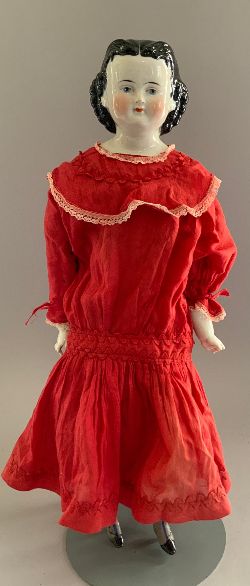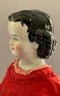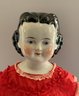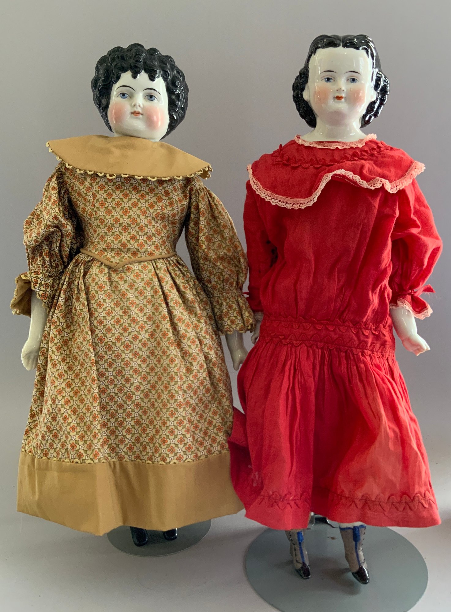 2 – Black hair china shoulder head dolls, 1 – 18 ½” center part with curls, painted features, cloth body with china limbs ( right leg damage, left hand damage), red dress & 1 – 20” sculpted curls, painted features, cloth body with china limbs, gold print dress