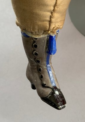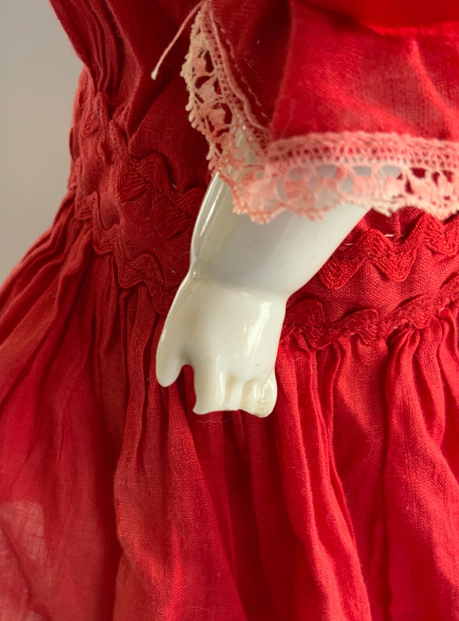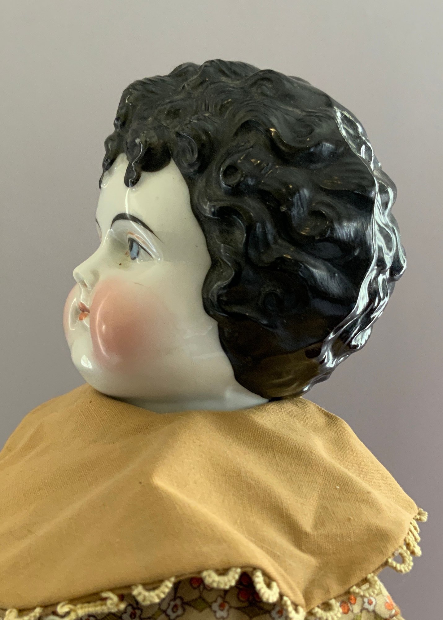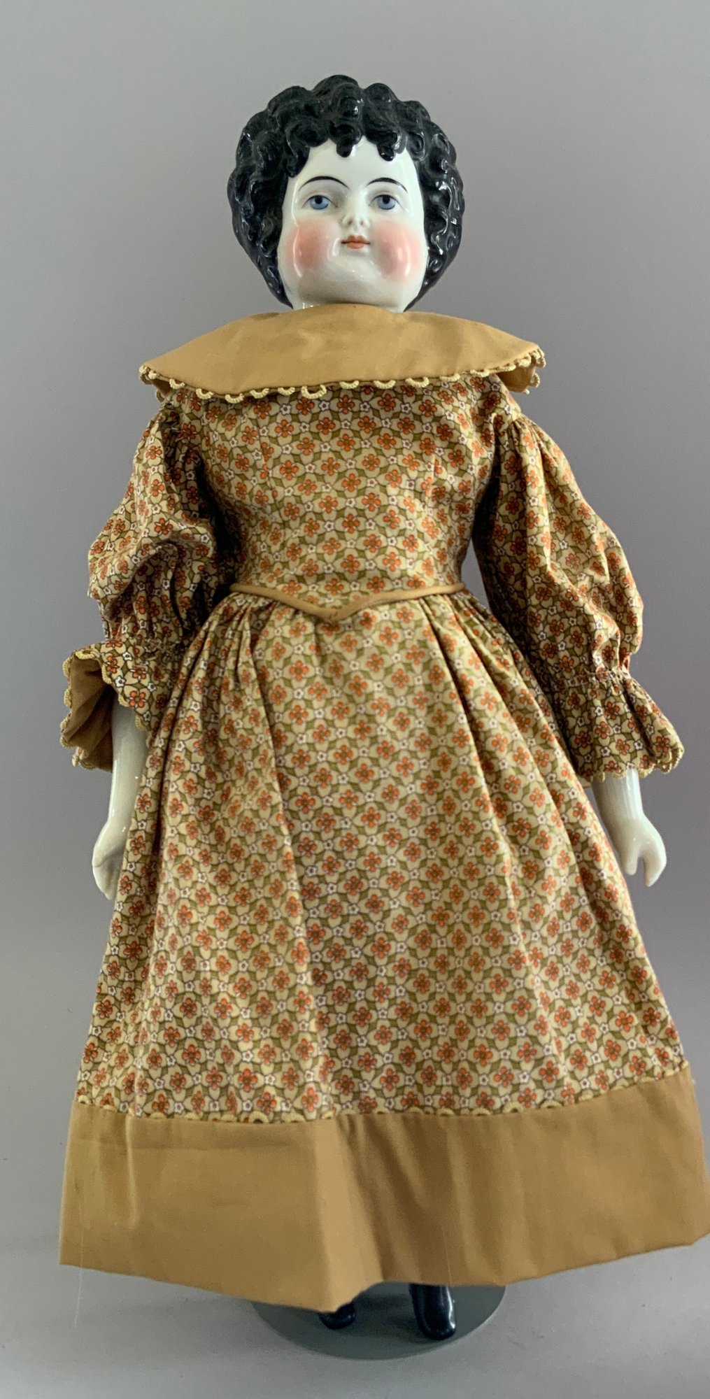 2 – Black hair china shoulder head dolls, 1 – 18 ½” center part with curls, painted features, cloth body with china limbs ( right leg damage, left hand damage), red dress & 1 – 20” sculpted curls, painted features, cloth body with china limbs, gold print dress