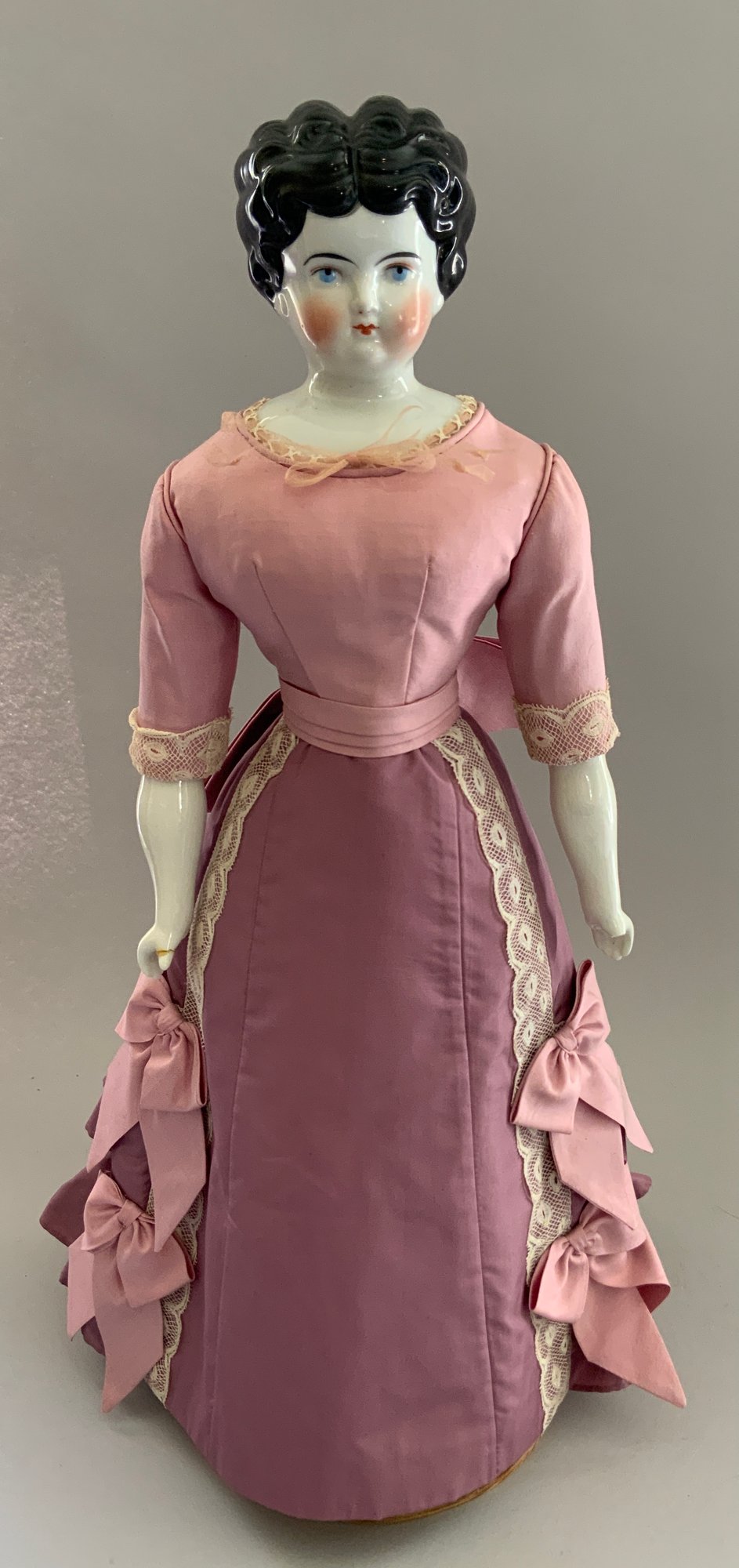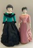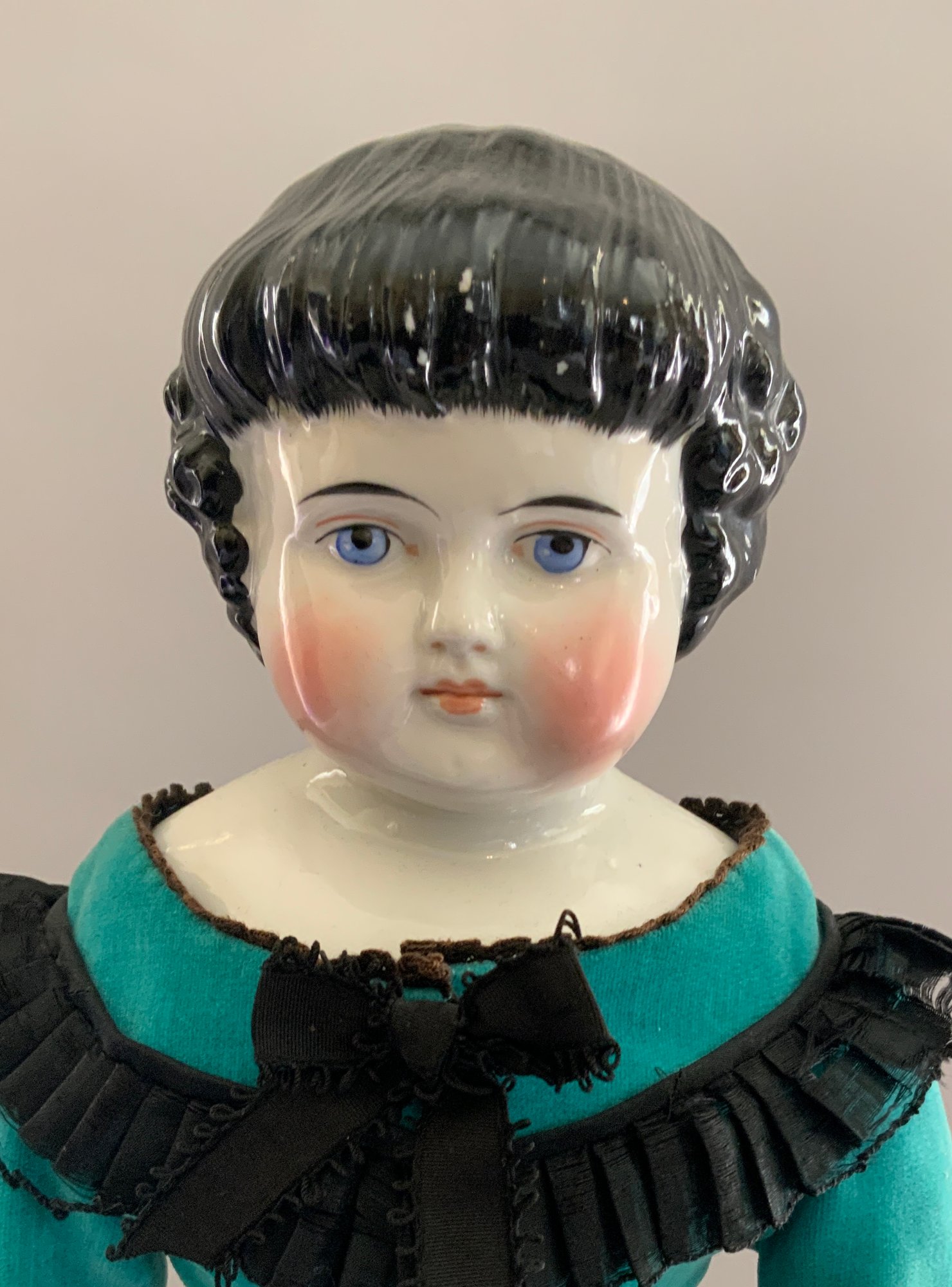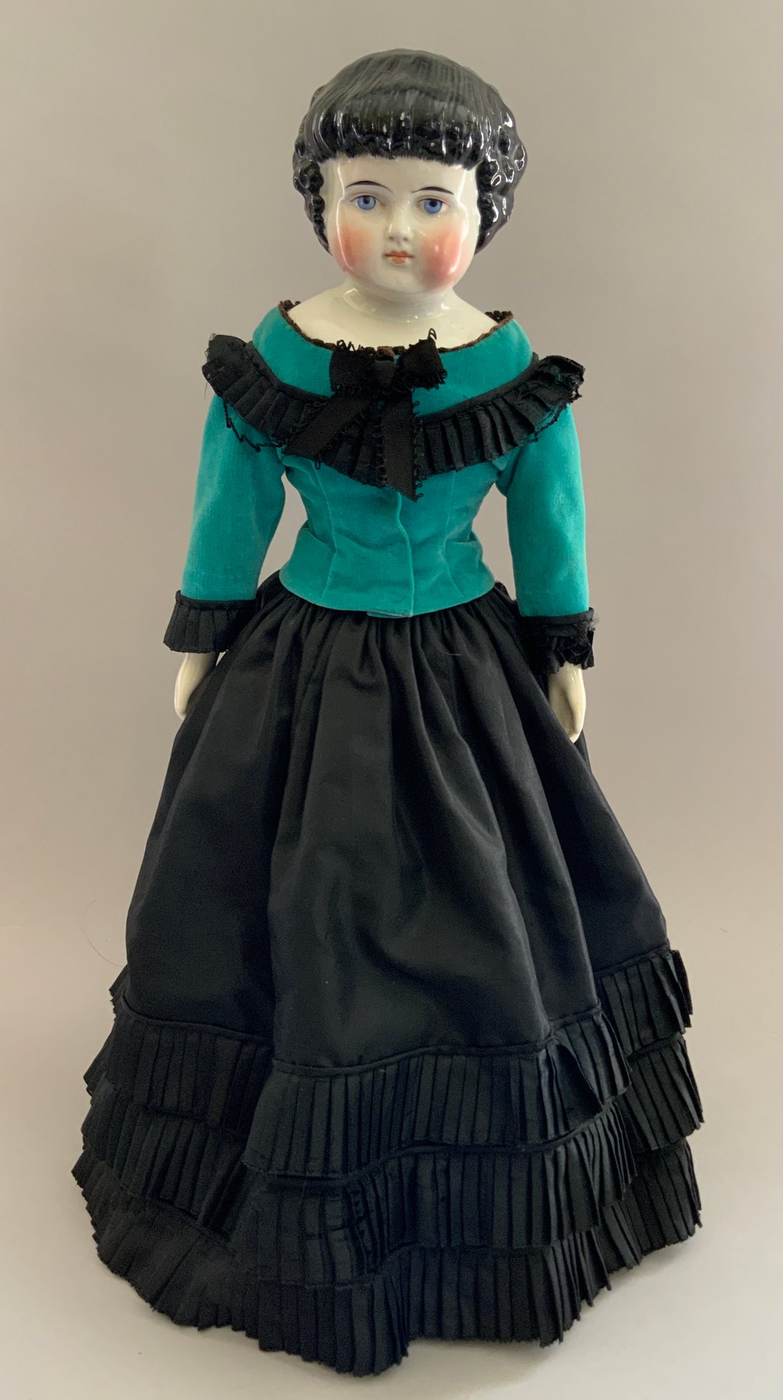 2 – Black hair low brow china shoulder head dolls, 1 – 18”, painted features, center part hair, cloth body with china limbs, purple dress (right thumb repair, broken left thumb), & 1 – 20”, painted features, cloth body with china limbs, turquoise & black dress
