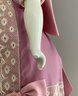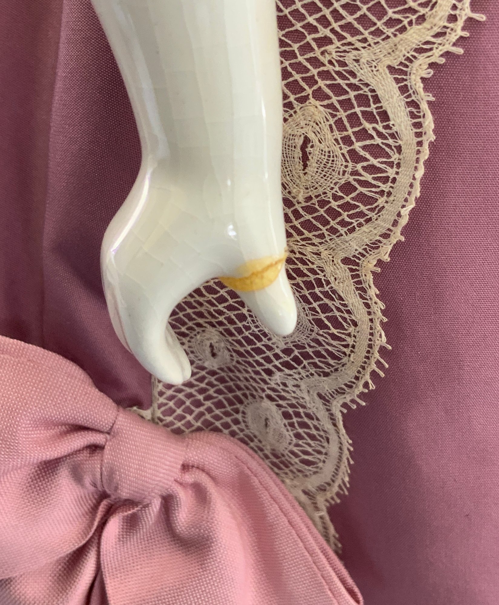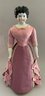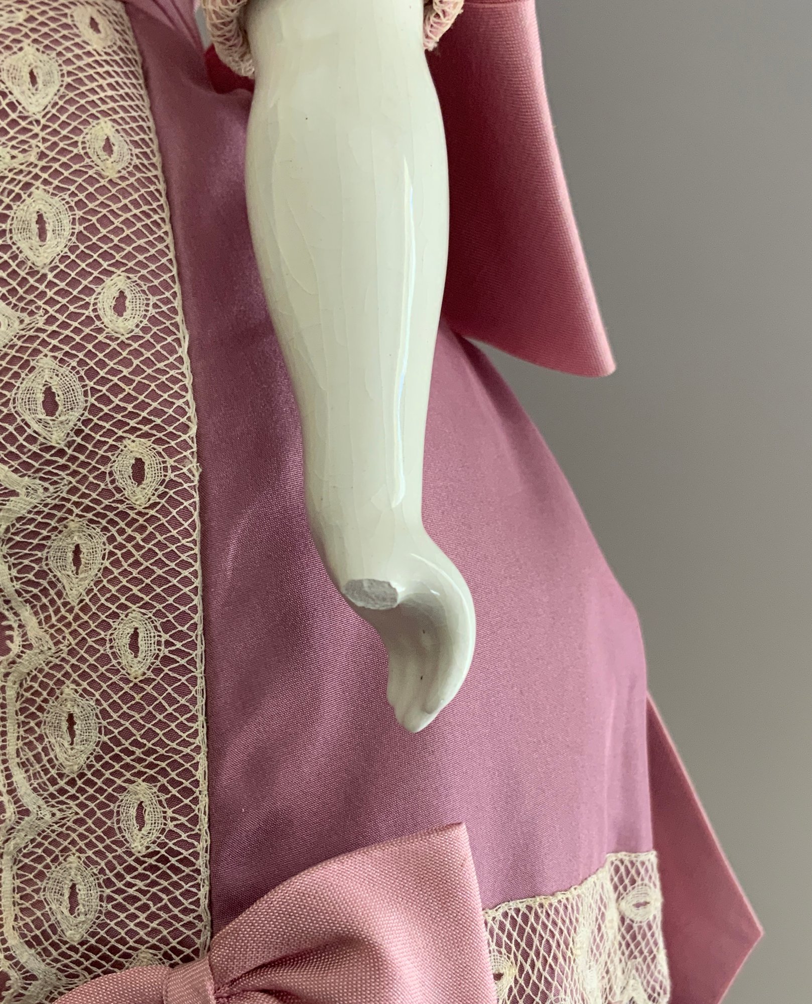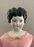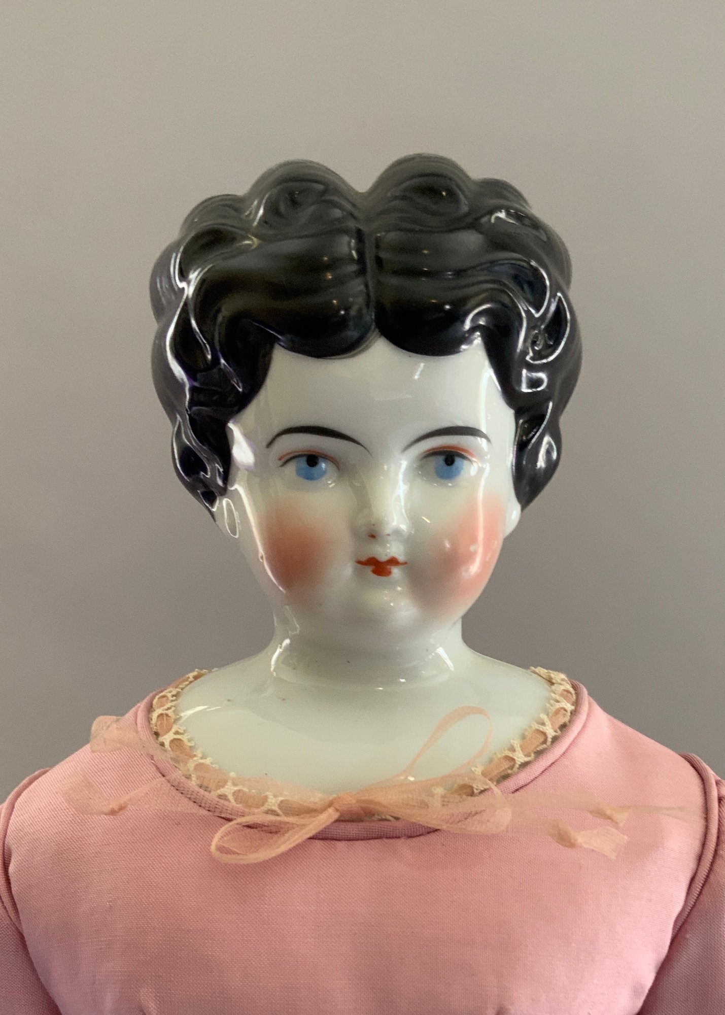 2 – Black hair low brow china shoulder head dolls, 1 – 18”, painted features, center part hair, cloth body with china limbs, purple dress (right thumb repair, broken left thumb), & 1 – 20”, painted features, cloth body with china limbs, turquoise & black dress