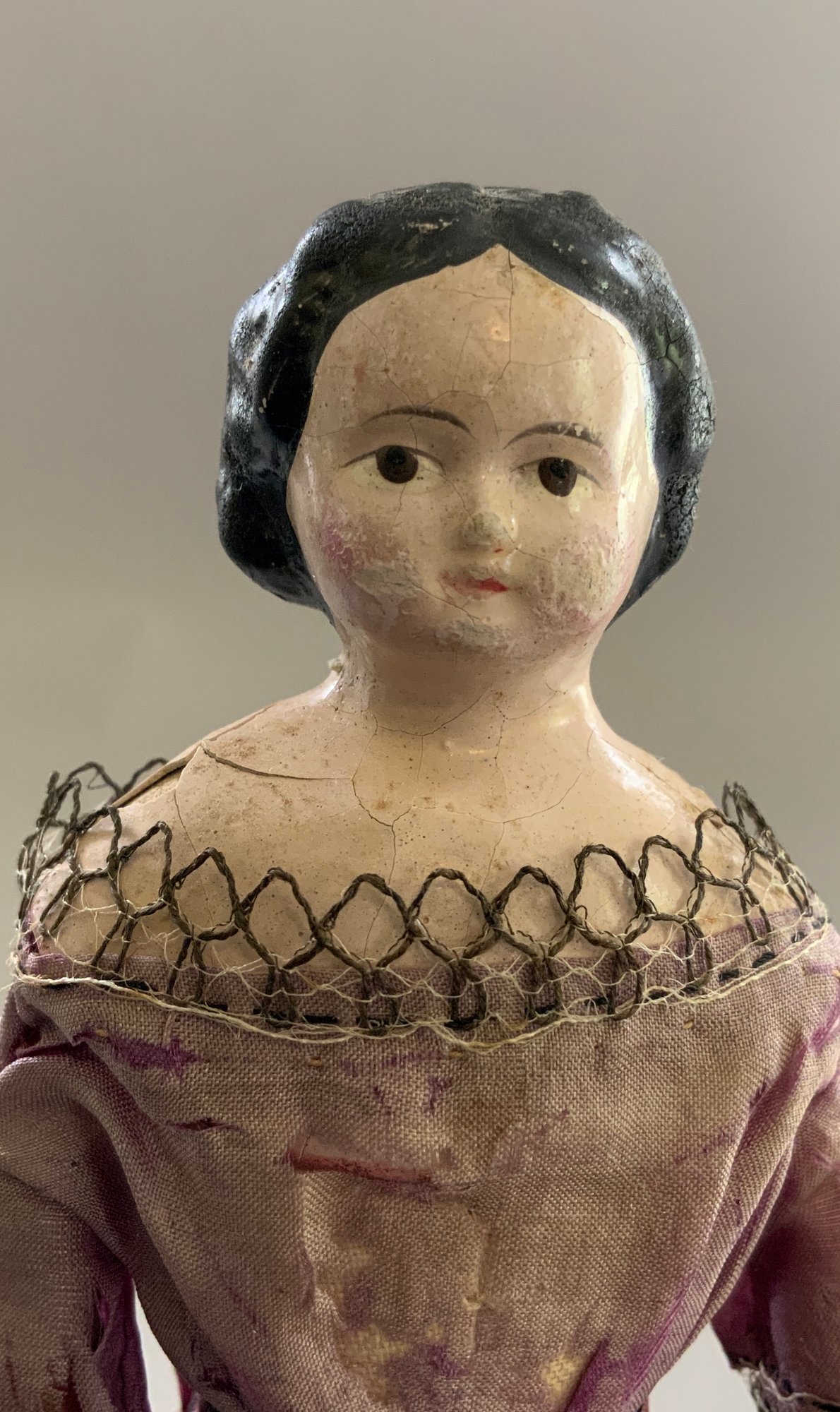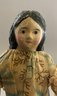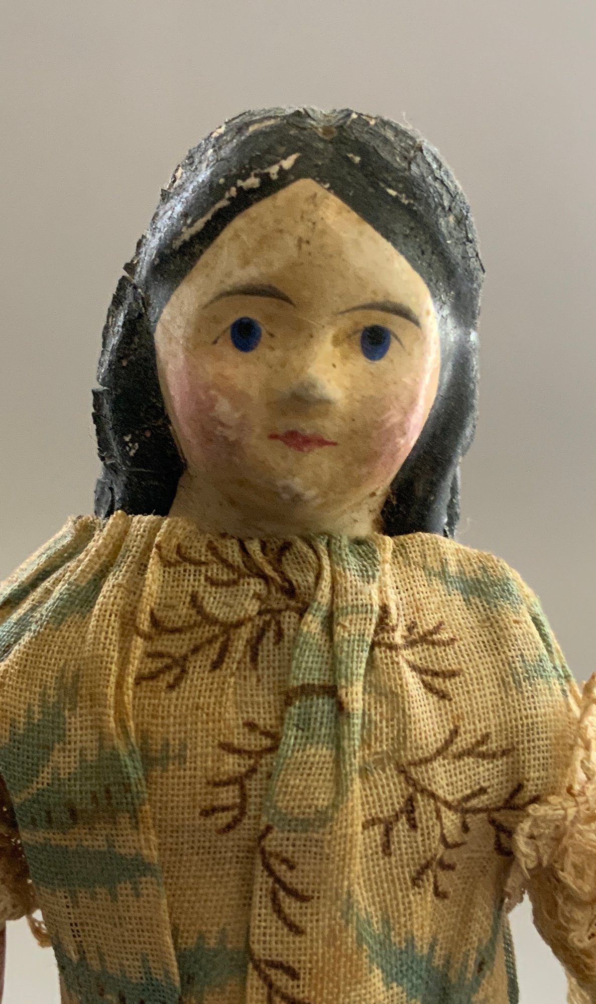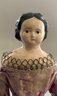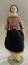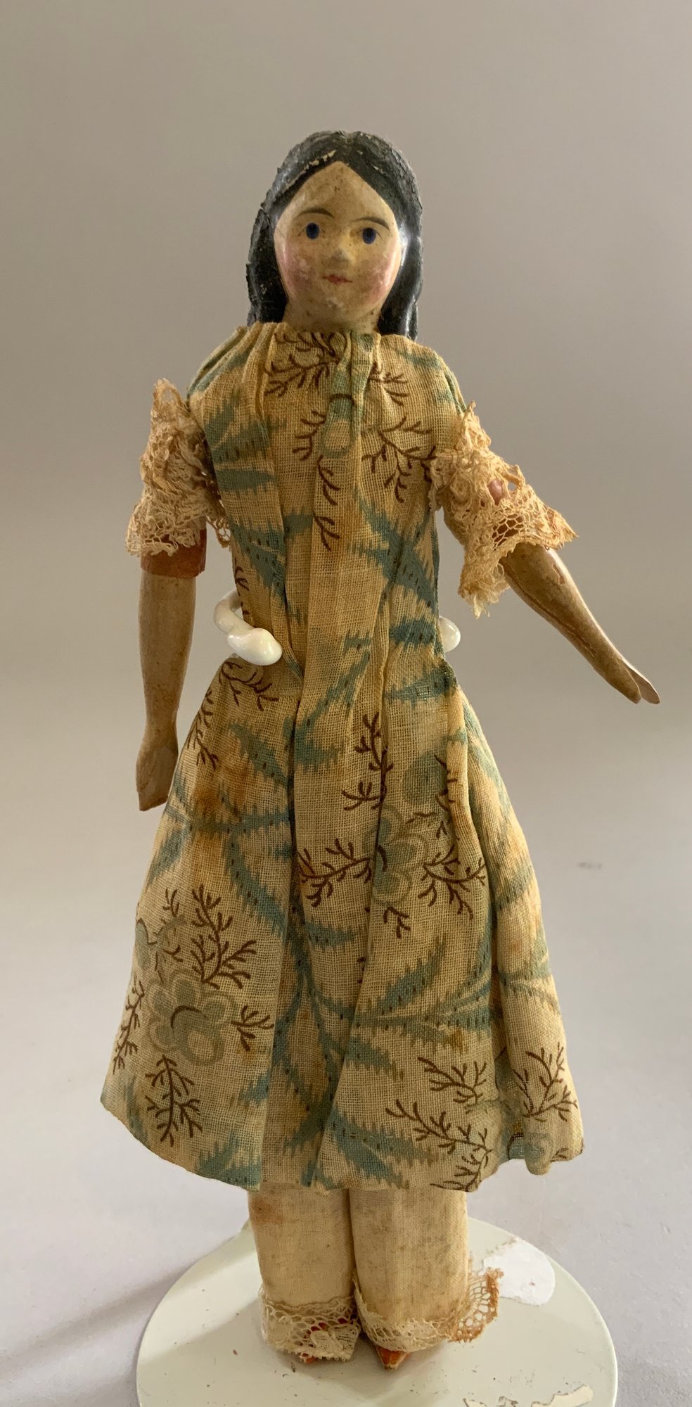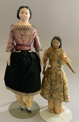 2 – Black hair paper mache milliners models, painted features, 1 – kid body with wood limbs, 1 – linen body with wood limbs, antique outfits (wear), black skirt 9”, floral outfit 7”