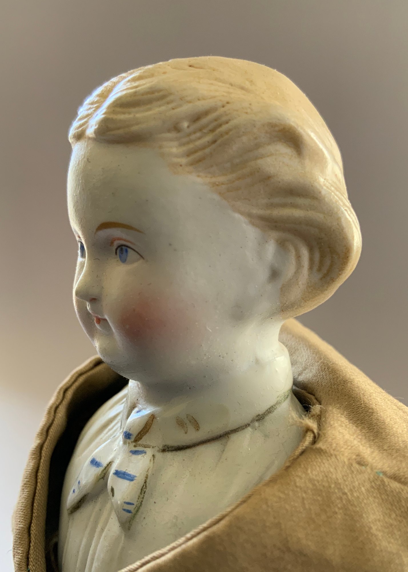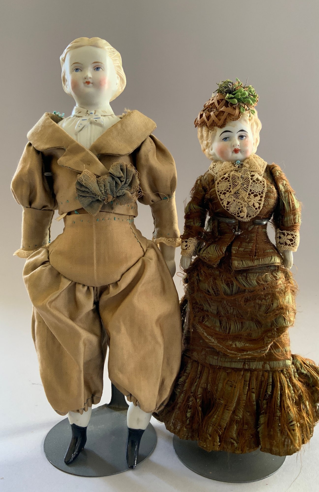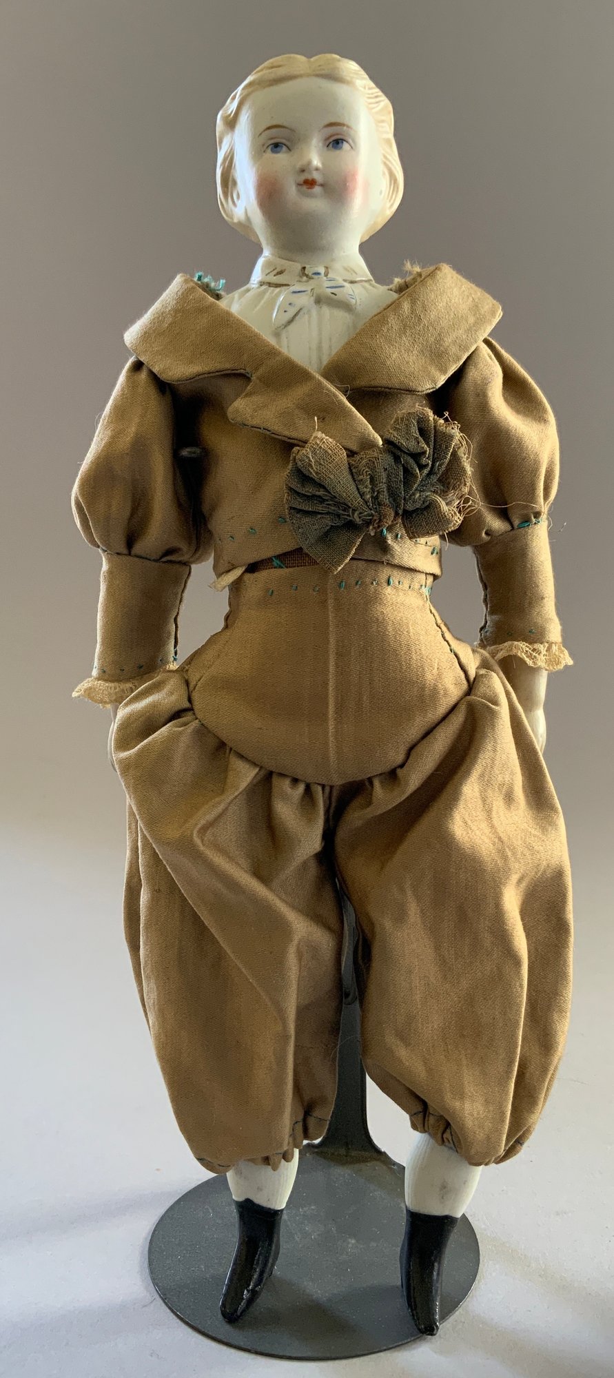 2 – Blonde hair Parian shoulder head dolls with painted features, 1 – 10 ½” molded bodice boy, cloth body, parian limbs, brown silk suit, & 1 – 8” sculpted hair, cloth body with parian limbs, silk walking suit (melting)